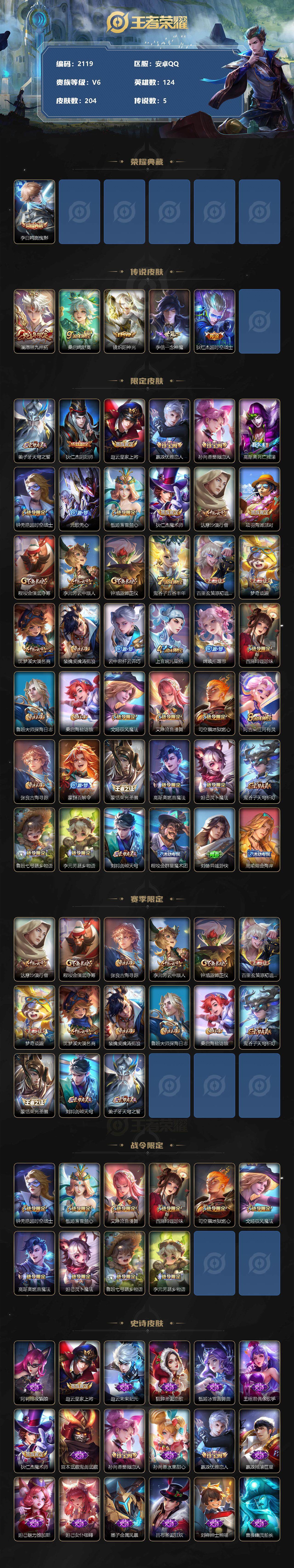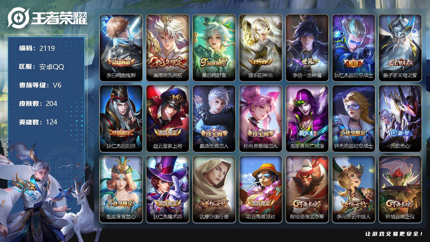 [12934792]安卓Q-V6-最强王者段位-124英雄-204皮肤-1典藏-0珍品无双-0无双-0珍品传说-5传说-66史诗