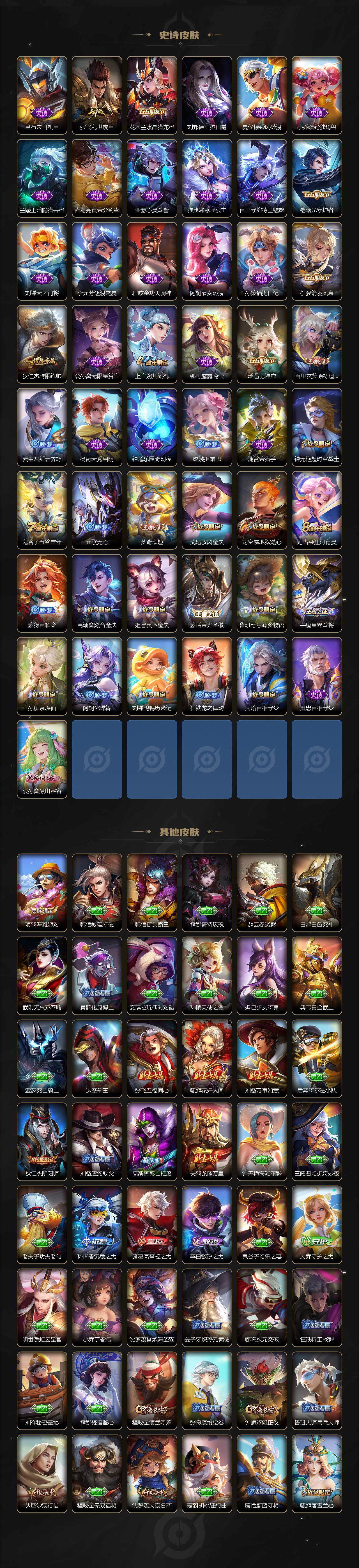 【史诗皮肤】:阿轲暗夜猫娘,赵云皇家上将,赵云未来纪元,貂蝉圣诞恋歌,甄姬冰雪圆舞曲,王昭君偶像歌手,狄仁杰魔术师,宫本武藏鬼剑武藏,孙尚香蔷薇恋人,孙尚香水果甜心,嬴政优雅恋人,嬴政摇滚巨星,妲己魅力维加斯,妲己女仆咖啡,墨子金属风暴,吕布圣诞狂欢,刘禅绅士熊喵,曹操幽灵船长,吕布末日机甲,张飞乱世虎臣,花木兰水晶猎龙者,刘邦德古拉伯爵,夏侯惇乘风破浪,小乔缤纷独角兽,兰陵王暗隐猎兽者,诸葛亮黄金分割率,亚瑟心灵战警,雅典娜冰冠公主,百里守约特工魅影,铠曙光守护者,刘禅天才门将,李元芳逐浪之夏,程咬金功夫厨神,阿轲节奏热浪,孙策猫狗日记,伽罗箭羽风息,狄仁杰鹰眼统帅,公孙离无限星赏官,上官婉儿梁祝,娜可露露晚萤,瑶遇见神鹿,百里玄策原初追逐者,云中君纤云弄巧,杨戬天秀启明,钟馗乐园奇幻夜,嫦