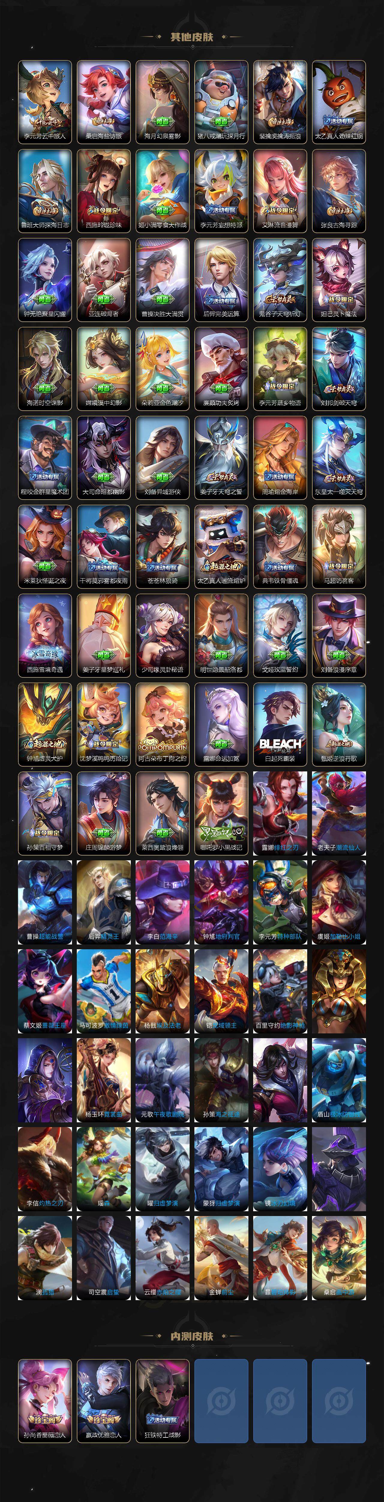【限定皮肤】:姜子牙天穹之誓,狄仁杰阴阳师,赵云皇家上将,嬴政优雅恋人,孙尚香蔷薇恋人,高渐离死亡摇滚,钟无艳超时空战士,元歌无心,甄姬落雪兰心,狄仁杰魔术师,达摩沙漠行僧,项羽海滩派对,程咬金演武夺筹,李元芳云中旅人,钟馗驱傩正仪,鬼谷子五谷丰年,百里玄策原初追逐者,梦奇顽趣,沈梦溪大漠名商,裴擒虎擒涛扼浪,云中君纤云弄巧,上官婉儿梁祝,嫦娥拒霜思,西施玲珑珍味,鲁班大师探海日志,桑启海盐诗旅,戈娅驭风魔法,艾琳流音漫舞,司空震地狱燃心,阿古朵江河有灵,张良古海寻踪,蒙犽百解令,蒙恬荣光圣徽,高渐离燃音魔法,妲己灵卜魔法,鬼谷子天穹祈灯,鲁班七号蔬乡物语,李元芳蔬乡物语,刘邦剑破天穹,程咬金群星魔术团,刘备异域游侠,周瑜熔金海岸