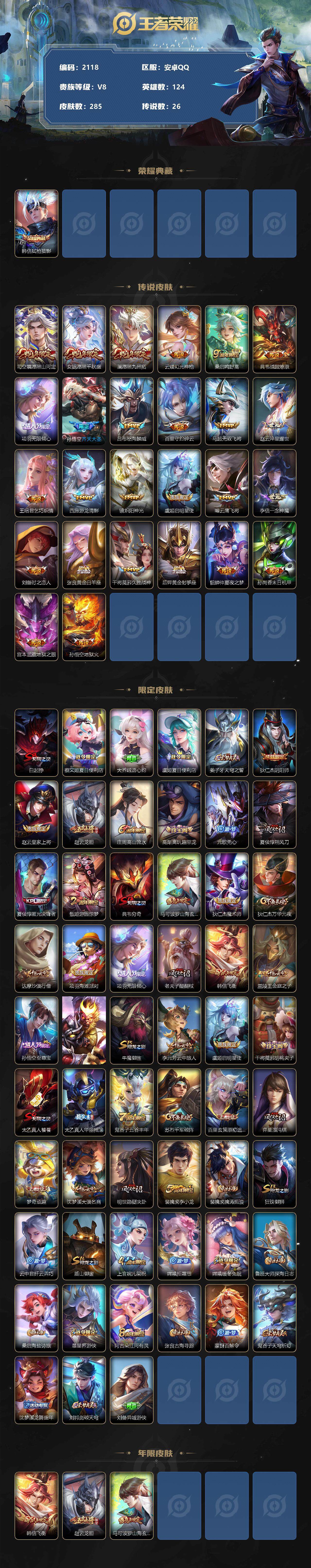 [12934848]安卓Q-V8-永恒钻石IV段位-124英雄-285皮肤-1典藏-0珍品无双-0无双-0珍品传说-26传说-78史诗 【英雄全皮】:空空儿全皮,影全皮 【荣耀典藏】:韩信弑枪猎影 【传说皮肤】:司空震愿照山河定,女娲愿照千秋盛,澜愿照九州拓,云缨幻光神枪,桑启鸣野蒿,典韦战鼓燎原,项羽无限倾心,孙悟空齐天大圣,吕布怒海麟威,百里守约碎云,马超无双飞将,赵云淬星耀世,王昭君乞巧织情,西施游龙清影,镜炽阳神光,虞姬启明星使,曜云鹰飞将,李信一念神魔,刘备时之恋人,张良黄金白羊座,干将莫邪久胜战神,后羿黄金射手座,貂蝉仲夏夜之梦,孙尚香末日机甲,宫本武藏地狱之眼,孙悟空地狱火 【限定皮肤】:白起狰,蔡文姬夏日便利店,大乔绒语心约,虞姬夏日便利店,姜子牙天穹之誓,狄仁杰阴阳师,赵云皇家上将,赵云龙胆,庄周高山流水,高渐离玩趣恶龙,元歌无心,夏侯惇朔风刀,夏侯惇匿光决锋者,甄姬游园惊梦,典韦穷奇,马可波罗山海玄木吟,狄仁杰魔术师,狄仁杰万华元夜,达摩沙漠行僧,项羽海滩派对,项羽无限倾心,老夫子醍醐杖,韩信飞衡,兰陵王金庭之子,孙悟空至尊宝,孙悟空齐天大圣,牛魔御旌,李元芳云中旅人,虞姬启明星使,干将莫邪胡桃夹子,太乙真人饕餮,太乙真人华丽摇滚,鬼谷子五谷丰年,苏烈千军破阵,百里玄策原初追逐者,弈星混沌棋,梦奇顽趣,沈梦溪大漠名商,明世隐疑决卦,裴擒虎李小龙,裴擒虎擒涛扼浪,狂铁御狮,云中君纤云弄巧,盾山御銮,上官婉儿梁祝,嫦娥拒霜思,嫦娥暖冬兔眠,鲁班大师探海日志,桑启海盐诗旅,暃星界游侠,阿古朵江河有灵,张良古海寻踪,蒙犽百解令,鬼谷子天穹祈灯,沈梦溪龙舞盛年,刘邦剑破天穹,刘备异域游侠 【年限皮肤】:韩信飞衡,赵云龙胆,马可波罗山海玄木吟 【赛季限定】:白起狰,夏侯惇朔风刀,典韦穷奇,狄仁杰万华元夜,达摩沙漠行僧,老夫子醍醐杖,兰陵王金庭之子,张良古海寻踪,牛魔御旌,李元芳云中旅人,太乙真人饕餮,苏烈千军破阵,百里玄策原初追逐者,弈星混沌棋,梦奇顽趣,沈梦溪大漠名商,明世隐疑决卦,裴擒虎擒涛扼浪,狂铁御狮,盾山御銮,鲁班大师探海日志,桑启海盐诗旅,鬼谷子天穹祈灯,刘邦剑破天穹,姜子牙天穹之誓 【战令限定】:蔡文姬夏日便利店,虞姬夏日便利店,嫦娥暖冬兔眠,暃星界游侠 【史诗皮肤】:鲁班七号电玩小子,露娜紫霞仙子,赵云皇家上将,赵云未来纪元,貂蝉圣诞恋歌,甄姬冰雪圆舞曲,王昭
