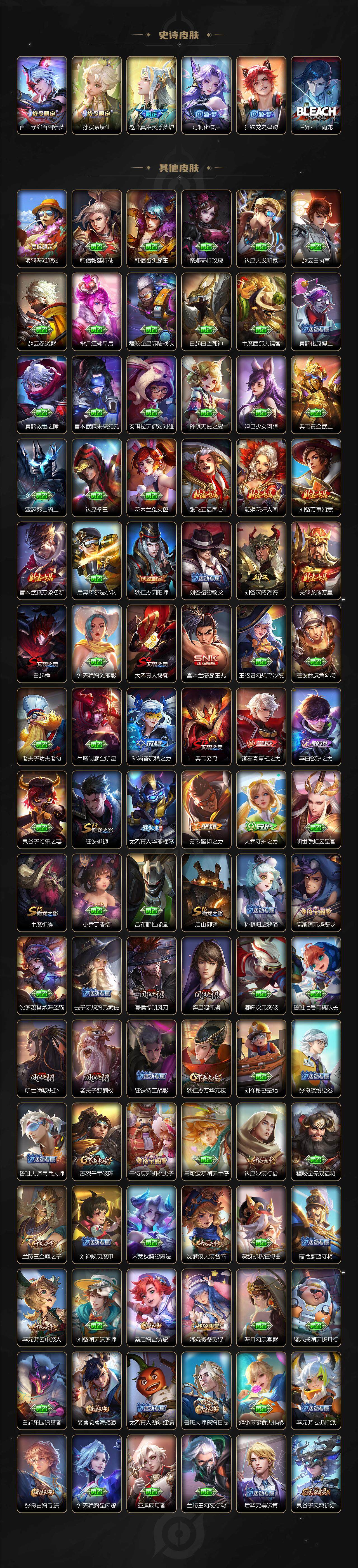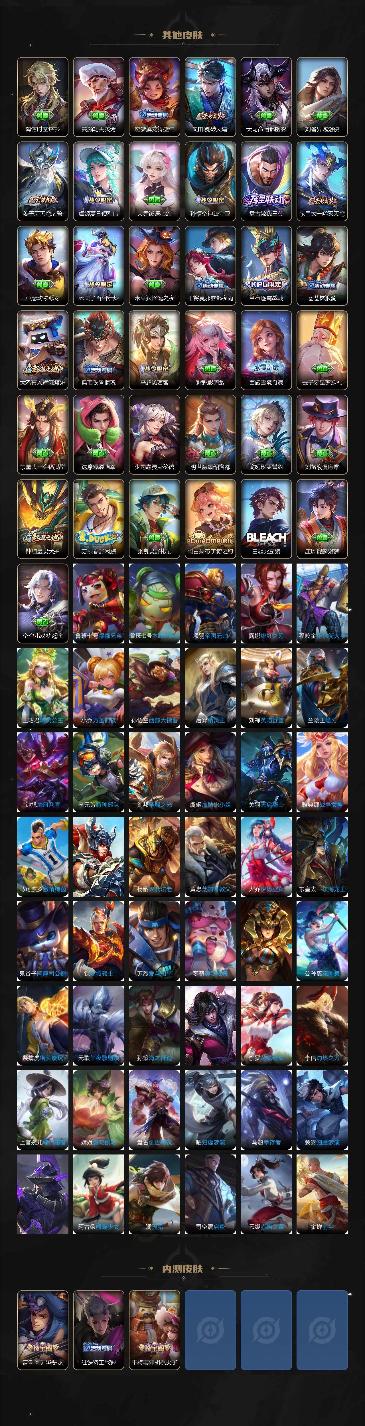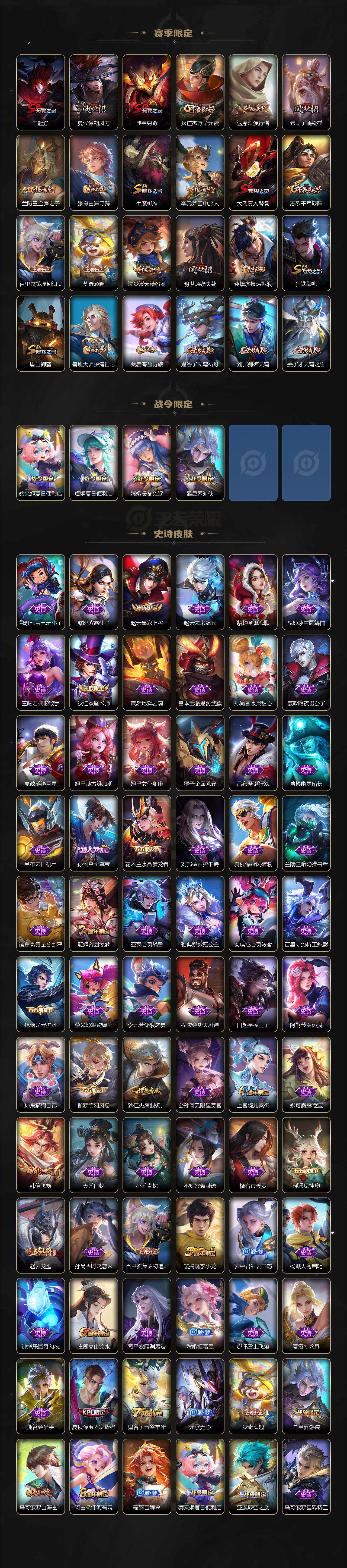 【限定皮肤】:白起狰,蔡文姬夏日便利店,大乔绒语心约,虞姬夏日便利店,姜子牙天穹之誓,狄仁杰阴阳师,赵云皇家上将,赵云龙胆,庄周高山流水,高渐离玩趣恶龙,元歌无心,夏侯惇朔风刀,夏侯惇匿光决锋者,甄姬游园惊梦,典韦穷奇,马可波罗山海玄木吟,狄仁杰魔术师,狄仁杰万华元夜,达摩沙漠行僧,项羽海滩派对,项羽无限倾心,老夫子醍醐杖,韩信飞衡,兰陵王金庭之子,孙悟空至尊宝,孙悟空齐天大圣,牛魔御旌,李元芳云中旅人,虞姬启明星使,干将莫邪胡桃夹子,太乙真人饕餮,太乙真人华丽摇滚,鬼谷子五谷丰年,苏烈千军破阵,百里玄策原初追逐者,弈星混沌棋,梦奇顽趣,沈梦溪大漠名商,明世隐疑决卦,裴擒虎李小龙,裴擒虎擒涛扼浪,狂铁御狮,云中君纤云弄巧,盾山御銮,上官婉儿梁祝,嫦娥拒霜思,嫦娥暖冬兔眠,鲁班大师探海日志,桑启海盐诗旅,暃星界游侠,阿古朵江河有灵,张良古海寻踪,蒙犽百解令,鬼谷子天穹祈灯,沈梦溪龙舞盛年,刘邦剑破天穹,刘备异域游侠