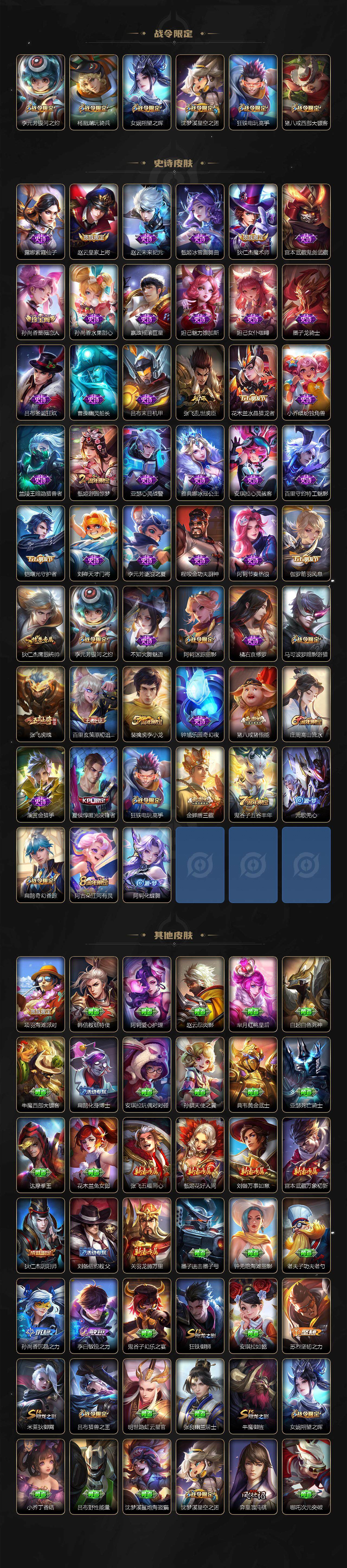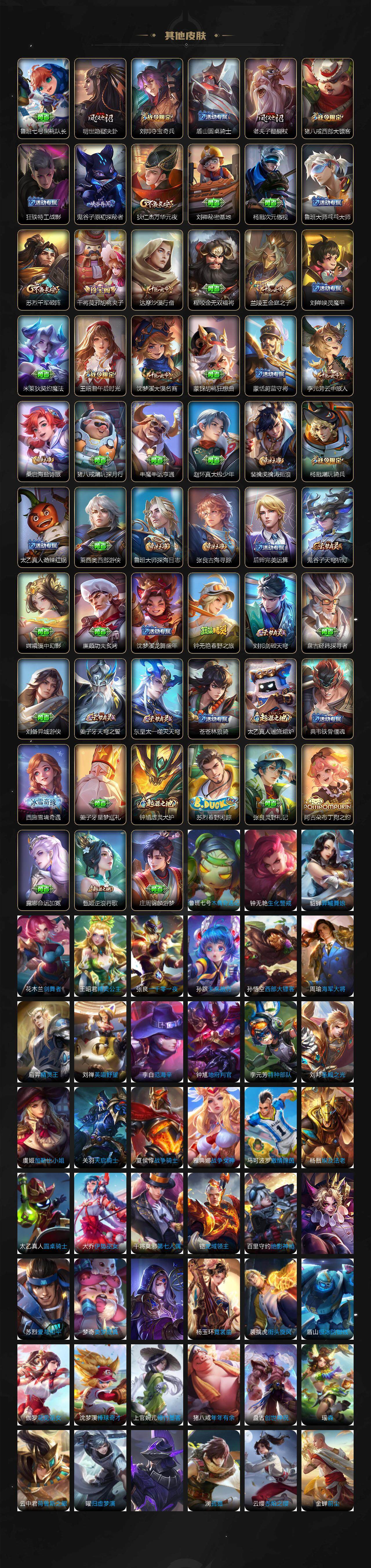 【限定皮肤】:姜子牙天穹之誓,狄仁杰阴阳师,赵云皇家上将,孙尚香蔷薇恋人,庄周高山流水,阿轲迷踪丽影,扁鹊奇幻香踪,吕布猎兽之王,元歌无心,夏侯惇匿光决锋者,甄姬游园惊梦,马可波罗暗影游猎,狄仁杰魔术师,狄仁杰万华元夜,达摩沙漠行僧,项羽海滩派对,老夫子醍醐杖,刘邦夺宝奇兵,王昭君午后时光,兰陵王金庭之子,花木兰燃星之曲,孙悟空零号赤焰,牛魔御旌,张飞虎魄,李元芳银河之约,李元芳云中旅人,杨戬潮玩骑兵,女娲朔望之晖,干将莫邪胡桃夹子,干将莫邪画中仙,鬼谷子原初探秘者,鬼谷子五谷丰年,苏烈千军破阵,百里玄策原初追逐者,弈星混沌棋,沈梦溪星空之诺,沈梦溪大漠名商,明世隐疑决卦,裴擒虎李小龙,裴擒虎擒涛扼浪,狂铁御狮,狂铁电玩高手,米莱狄御霄,猪八戒西部大镖客,猪八戒猪悟能,鲁班大师探海日志,桑启海盐诗旅,金蝉唐三藏,阿古朵江河有灵,张良古海寻踪,鬼谷子天穹祈灯,沈梦溪龙舞盛年,刘邦剑破天穹,刘备异域游侠