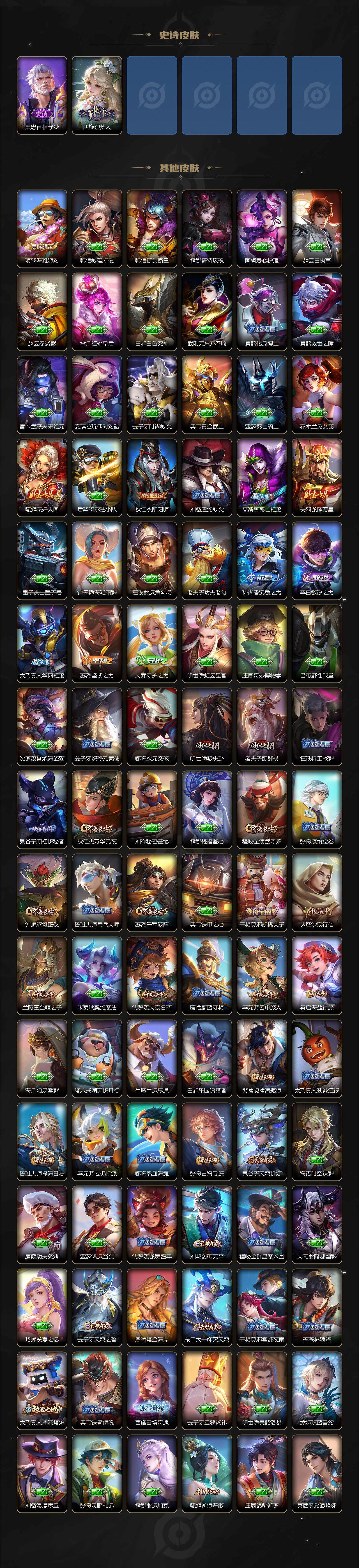 【史诗皮肤】:露娜紫霞仙子,赵云皇家上将,貂蝉圣诞恋歌,甄姬冰雪圆舞曲,王昭君偶像歌手,宫本武藏鬼剑武藏,孙尚香蔷薇恋人,孙尚香水果甜心,妲己魅力维加斯,妲己女仆咖啡,吕布圣诞狂欢,吕布末日机甲,花木兰水晶猎龙者,夏侯惇乘风破浪,安琪拉心灵骇客,百里守约特工魅影,阿轲节奏热浪,孙悟空大圣娶亲,狄仁杰鹰眼统帅,小乔青蛇,安琪拉时之奇旅,嫦娥拒霜思,元歌无心,梦奇顽趣,马可波罗山海玄木吟,蒙犽百解令,蒙恬荣光圣徽,牛魔星界战将,阿轲化蝶舞,后羿石田雨龙,黄忠百相守梦,西施织梦人