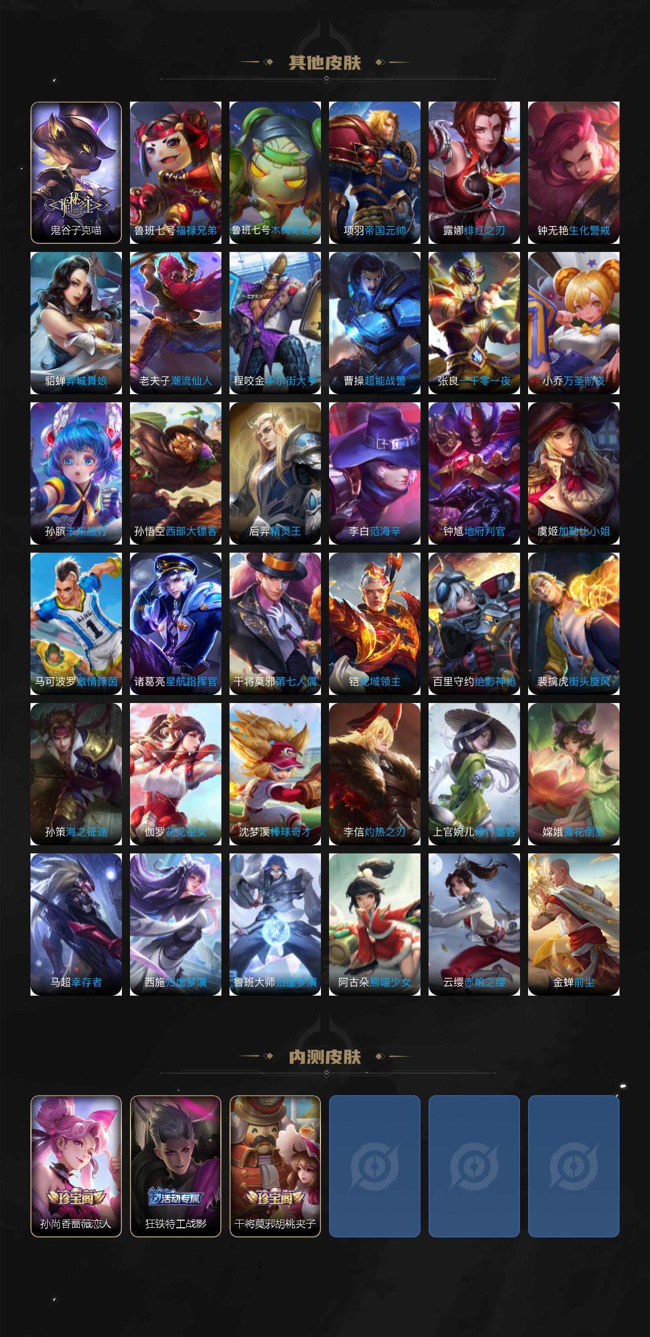 【其他皮肤】:项羽海滩派对,韩信教廷特使,韩信街头霸王,露娜哥特玫瑰,阿轲爱心护理,赵云白执事,赵云忍炎影,芈月红桃皇后,白起白色死神,武则天东方不败,扁鹊化身博士,扁鹊救世之瞳,宫本武藏未来纪元,安琪拉玩偶对对碰,姜子牙时尚教父,典韦黄金武士,亚瑟死亡骑士,花木兰兔女郎,甄姬花好人间,后羿阿尔法小队,狄仁杰阴阳师,刘备纽约教父,高渐离死亡摇滚,关羽龙腾万里,墨子进击墨子号,钟无艳海滩丽影,狂铁命运角斗场,老夫子功夫老勺,孙尚香沉稳之