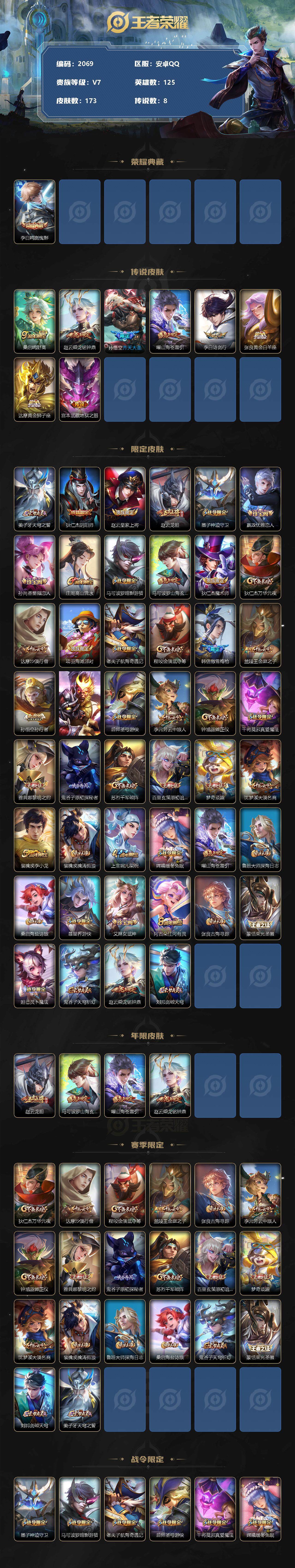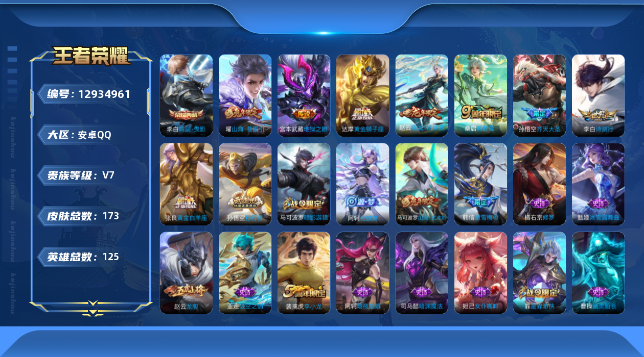 [12934961]安卓Q-V7-最强王者段位-125英雄-173皮肤-1典藏-0珍品无双-0无双-0珍品传说-8传说-50史诗