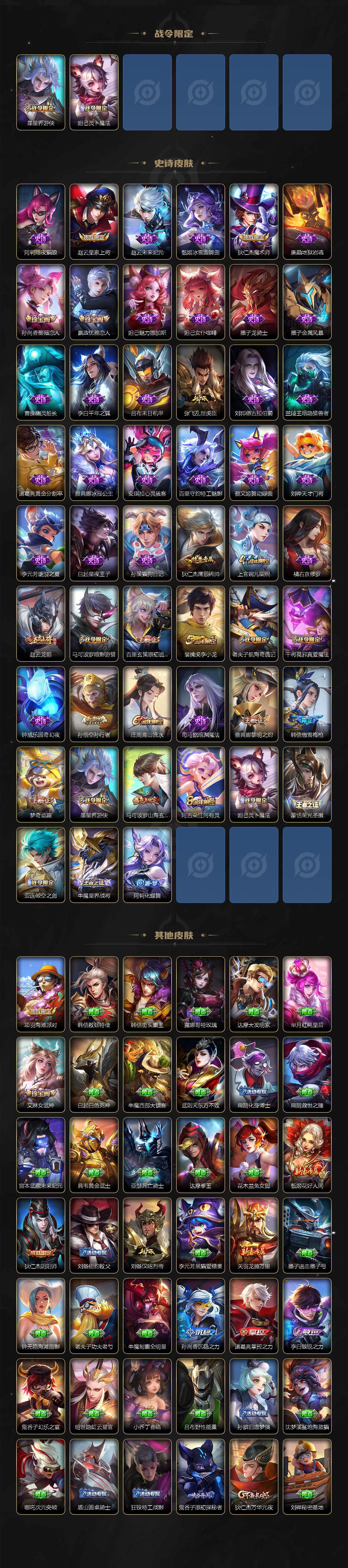 【史诗皮肤】:阿轲暗夜猫娘,赵云皇家上将,赵云未来纪元,甄姬冰雪圆舞曲,狄仁杰魔术师,廉颇地狱岩魂,孙尚香蔷薇恋人,嬴政优雅恋人,妲己魅力维加斯,妲己女仆咖啡,墨子龙骑士,墨子金属风暴,曹操幽灵船长,李白千年之狐,吕布末日机甲,张飞乱世虎臣,刘邦德古拉伯爵,兰陵王暗隐猎兽者,诸葛亮黄金分割率,雅典娜冰冠公主,安琪拉心灵骇客,百里守约特工魅影,蔡文姬舞动绿茵,刘禅天才门将,李元芳逐浪之夏,白起星夜王子,孙策猫狗日记,狄仁杰鹰眼统帅,上官婉儿梁祝,橘右京修罗,赵云龙