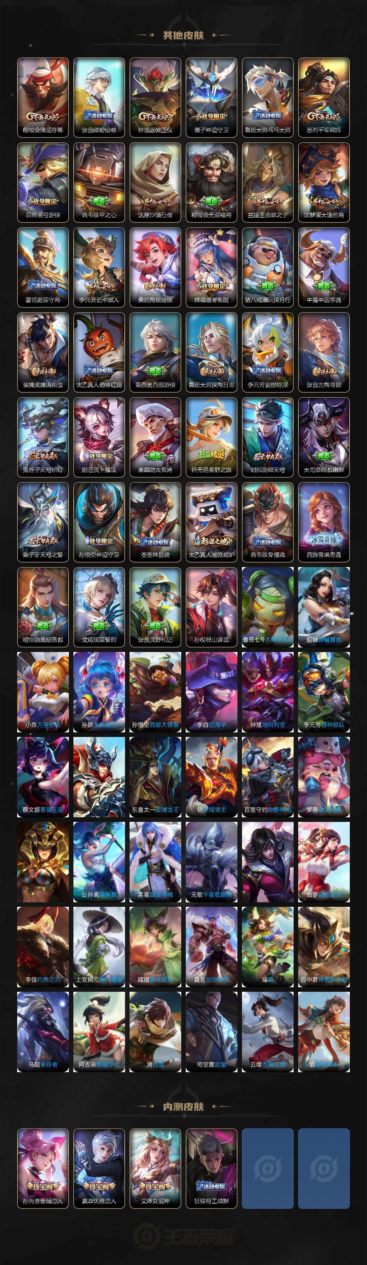 【限定皮肤】:姜子牙天穹之誓,狄仁杰阴阳师,赵云皇家上将,赵云龙胆,墨子神迹守卫,嬴政优雅恋人,孙尚香蔷薇恋人,庄周高山流水,马可波罗暗影游猎,马可波罗山海玄木吟,狄仁杰魔术师,狄仁杰万华元夜,达摩沙漠行僧,项羽海滩派对,老夫子航海奇遇记,程咬金演武夺筹,韩信傲雪梅枪,兰陵王金庭之子,孙悟空孙行者,孙悟空齐天大圣,后羿圣弓游侠,李元芳云中旅人,钟馗驱傩正仪,干将莫邪真爱魔法,雅典娜黎明之约,鬼谷子原初探秘者,苏烈千军破阵,百里玄策原初追逐者,梦奇顽趣,沈梦溪大漠名商,裴擒虎李小龙,裴擒虎擒涛扼浪,上官婉儿梁祝,嫦娥暖冬兔眠,曜山海苍雷引,鲁班大师探海日志,桑启海盐诗旅,暃星界游侠,艾琳女武神,阿古朵江河有灵,张良古海寻踪,蒙恬荣光圣徽,妲己灵卜魔法,鬼谷子天穹祈灯,赵云乘龙铭钟鼎,刘邦剑破天穹