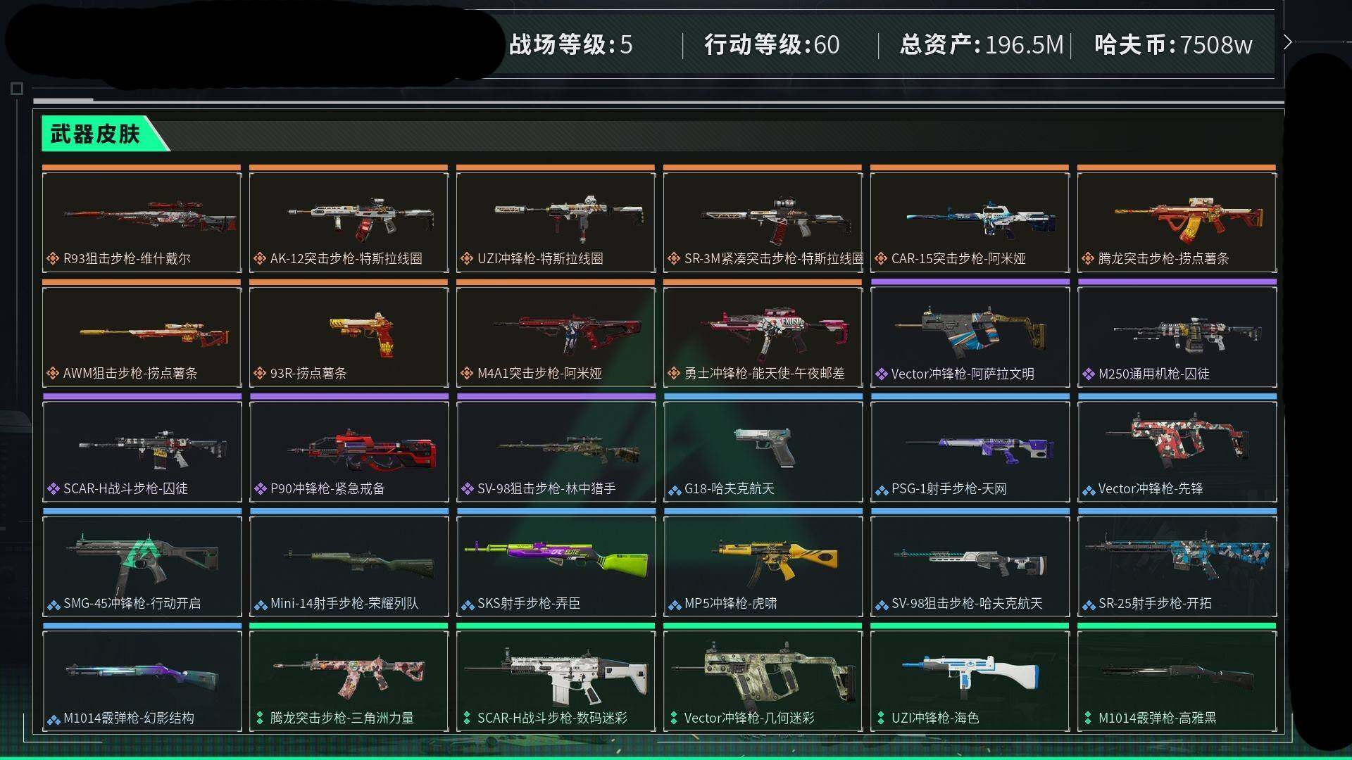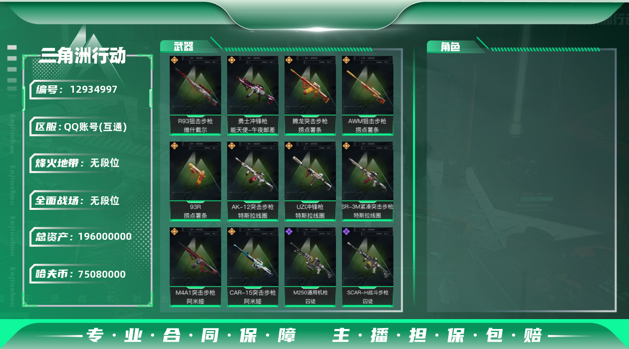 [12934997]汤13025 总资产196M,哈夫币7508w,枪皮数量53,战场等级:5 无军衔,行动等级:60 无段位,近战-黑鹰,安全箱等时效性道具请以游戏内数据为准;详情请看图【个人信息】战场等级:5 无军衔,行动等级:60 无段位【哈夫币】7508w【总资产】196M【烽火地带专区】总资产150M-200M【货币】0三角币/0曼德尔币/160三角券【安全箱】基础安全箱2(1x2)【通行证】通行证免费版【特勤处】制药台Lv.3/工作台Lv.3/仓库Lv.7/防具台Lv.3/训练中心Lv.6/靶场Lv.4/技术中心Lv.3/指挥中心Lv.3/潜水中心Lv.0/收藏室Lv.0【已拥有捆绑包】捞点薯条捆绑包/特斯拉线圈捆绑包/【近战皮肤】近战-黑鹰/【步枪皮肤】SCAR-H战斗步枪-囚徒/CAR-15突击步枪-阿米娅/M4A1突击步枪-阿米娅/腾龙突击步枪-捞点薯条/AK-12突击步枪-特斯拉线圈/SR-3M紧凑突击步枪-特斯拉线圈/【冲锋枪皮肤】UZI冲锋枪-特斯拉线圈/Vector冲锋枪-阿萨拉文明/勇士冲锋枪-能天使-午夜邮差/P90冲锋枪-紧急戒备/P90冲锋枪-莫斯提马/【轻机枪皮肤】M250通用机枪-囚徒/【狙击步枪皮肤】R93狙击步枪-维什戴尔/SV-98狙击步枪-林中猎手/AWM狙击步枪-捞点薯条/【手枪皮肤】93R-捞点薯条/【挂饰】挂饰-维什戴尔/阿萨拉喷火兵/阿萨拉霰弹兵/阿萨拉狙击兵/挂饰-阿米娅/挂饰-来点薯条/挂饰-特斯拉线圈/阿萨拉徽章/【载具】M1A4坦克-烈焰/(典藏皮肤颜色请以典藏展示为准,安全箱等时效性道具请以游戏内数据为准)