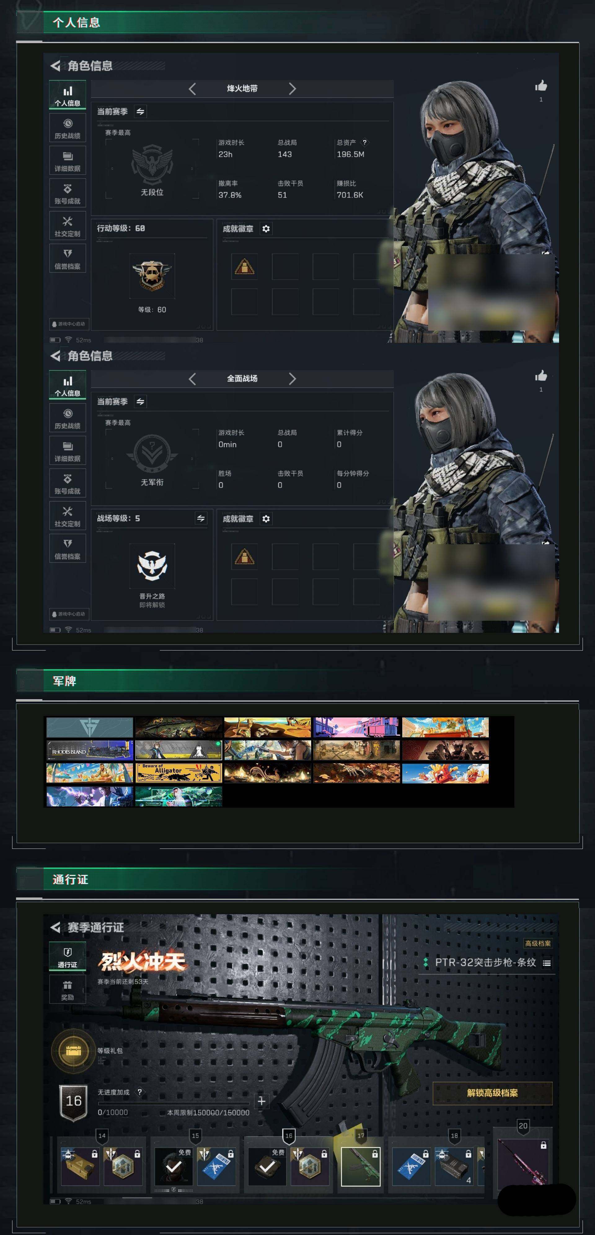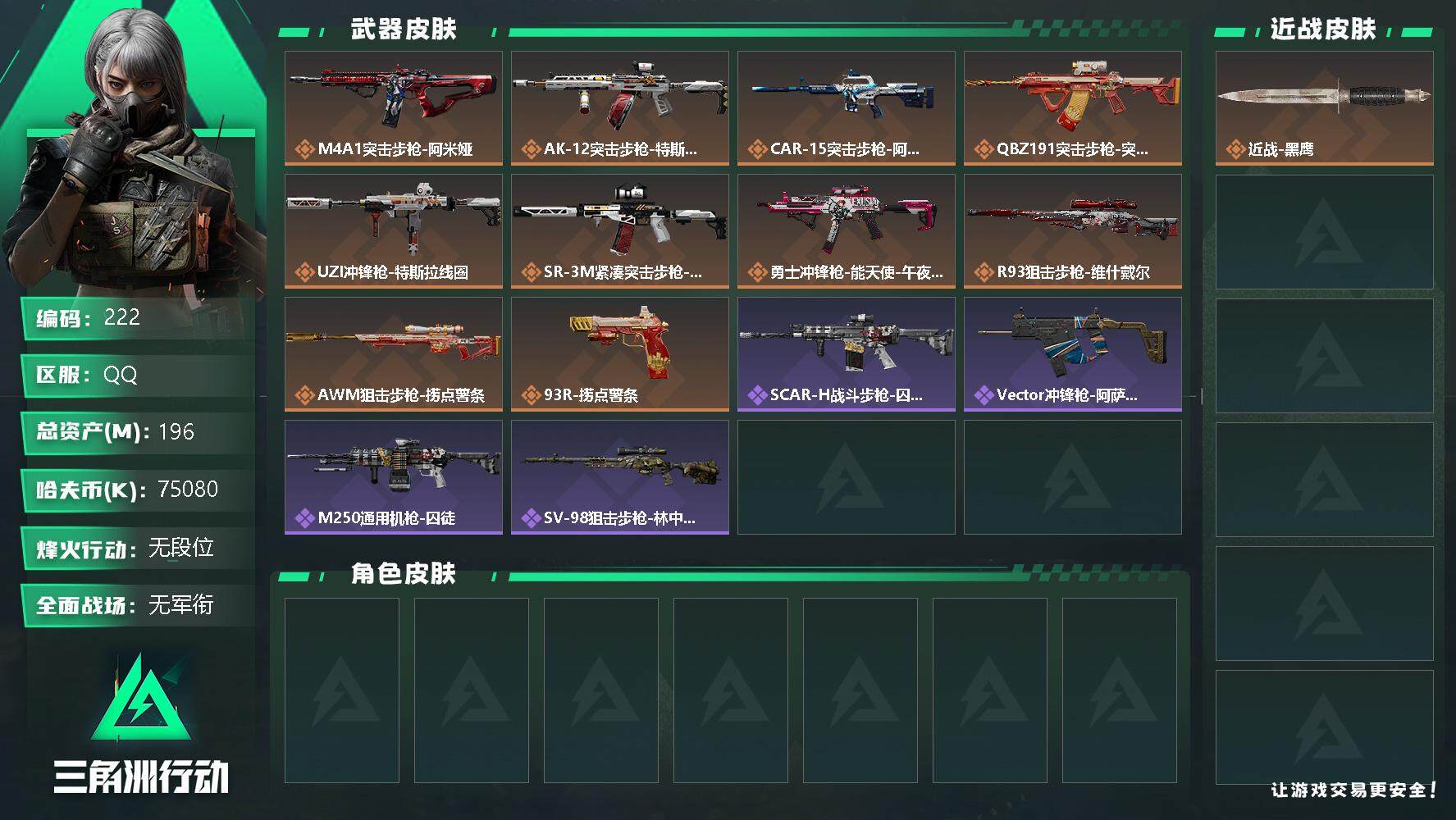 - [11578533]总资产:312.1M 10传说枪械 哈夫币:110K 进阶安全箱(9.17到期) 可二次 可修改实名 烽火地带段位:青铜 全面战场段位:无段位 传说武器皮肤:M16A4突击步枪-狩猎时刻,AWM狙击步枪-捞点薯条,腾龙突击步枪-捞点薯条,93R-捞点薯条,勇士冲锋枪-能天使-午夜邮差,Vector冲锋枪-狩猎时刻,G3战斗步枪-狩猎时刻,复合弓-黑-天际线,M4A1突击步枪-阿米娅,CAR-15突击步枪-阿米娅