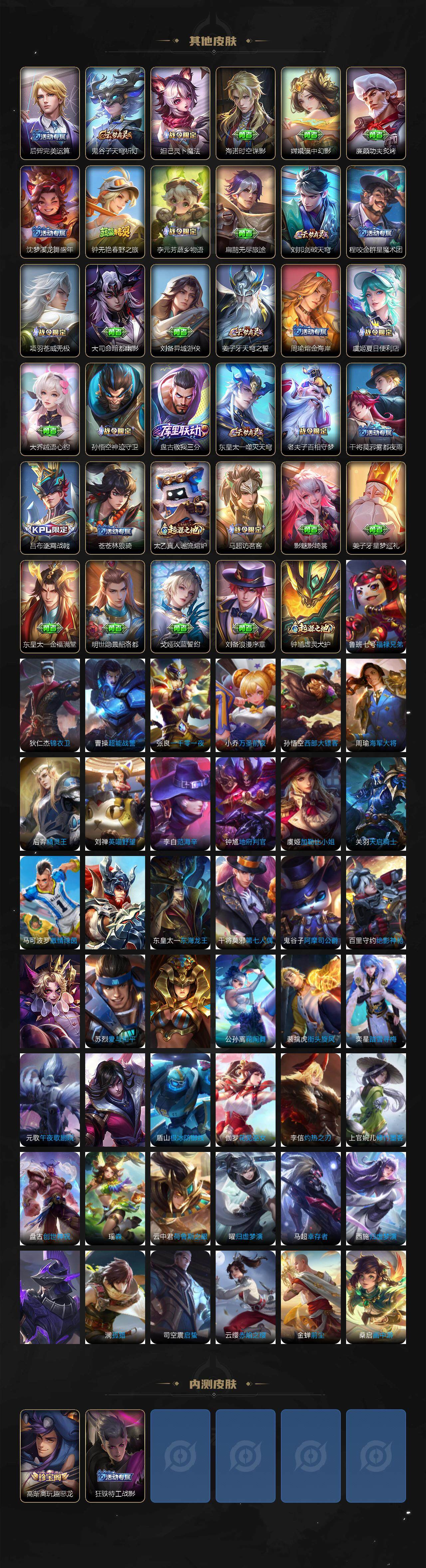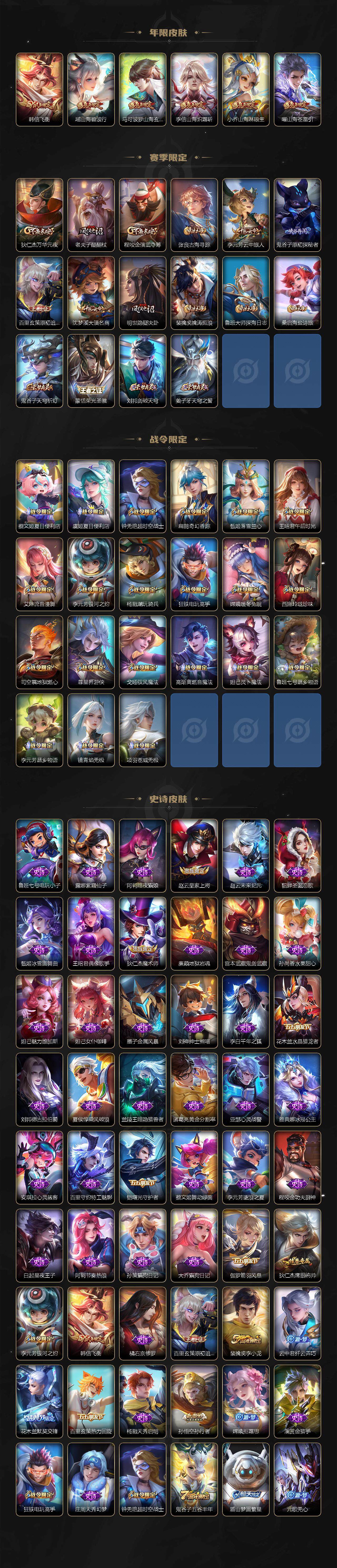 【限定皮肤】:蔡文姬夏日便利店,大乔绒语心约,虞姬夏日便利店,姜子牙天穹之誓,狄仁杰阴阳师,小乔山海琳琅生,赵云皇家上将,高渐离玩趣恶龙,钟无艳超时空战士,扁鹊奇幻香踪,元歌无心,甄姬落雪兰心,马可波罗山海玄木吟,狄仁杰魔术师,狄仁杰万华元夜,项羽海滩派对,老夫子醍醐杖,程咬金演武夺筹,韩信飞衡,王昭君午后时光,花木兰默契交锋,孙悟空孙行者,孙悟空齐天大圣,李元芳银河之约,李元芳云中旅人,虞姬启明星使,杨戬潮玩骑兵,鬼谷子原初探秘者,鬼谷子五谷丰年,百里玄策原初追逐者,沈梦溪大漠名商,沈梦溪匿光破解者,明世隐疑决卦,裴擒虎李小龙,裴擒虎擒涛扼浪,狂铁电玩高手,瑶山海碧波行,云中君纤云弄巧,李信山海炽霜斩,盾山梦圆繁星,嫦娥拒霜思,嫦娥暖冬兔眠,曜山海苍雷引,西施玲珑珍味,鲁班大师探海日志,桑启海盐诗旅,夏洛特浮生妄,暃星界游侠,戈娅驭风魔法,艾琳流音漫舞,司空震地狱燃心,阿古朵江河有灵,张良古海寻踪,蒙犽百解令,蒙恬荣光圣徽,高渐离燃音魔法,妲己灵卜魔法,鬼谷子天穹祈灯,沈梦溪龙舞盛年,鲁班七号蔬乡物语,李元芳蔬乡物语,刘邦剑破天穹,程咬金群星魔术团,镜青焰无极,项羽苍威无极,刘备异域游侠,周瑜熔金海岸