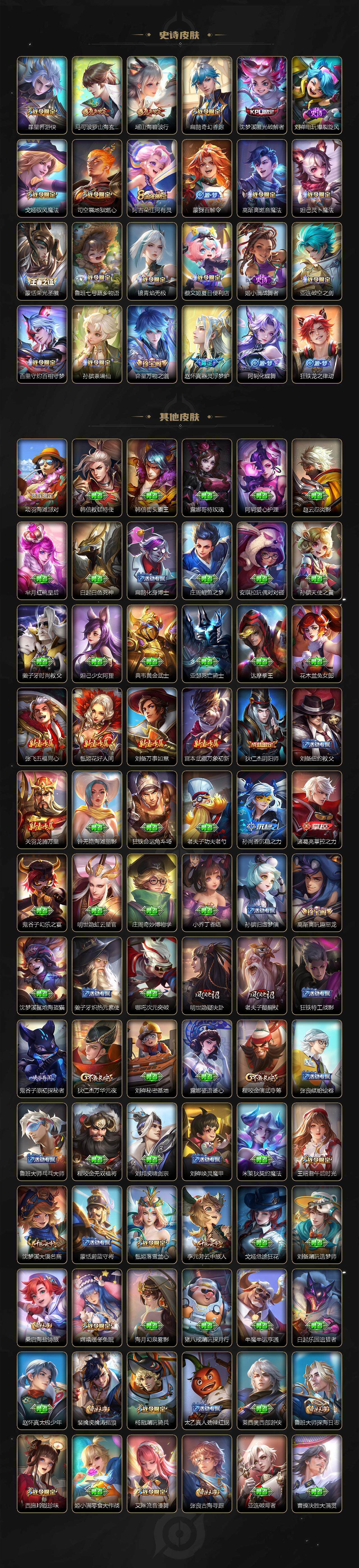 伽罗箭羽风息,李元芳逐浪之夏,大乔猫狗日记,孙策猫狗日记,阿轲节奏热浪,露娜紫霞仙子,诸葛亮黄金分割率,王昭君偶像歌手,阿轲暗夜猫娘,雅典娜冰冠公主,鲁班七号电玩小子,橘右京修罗,刘禅绅士熊喵,白起星夜王子,安琪拉心灵骇客,程咬金功夫厨神,刘邦德古拉伯爵,兰陵王暗隐猎兽者,宫本武藏鬼剑武藏,亚瑟心灵战警,杨戬天秀·启明,蔡文姬舞动绿茵,廉颇地狱岩魂,夏侯惇乘风破浪,花木兰水晶猎龙者,铠曙光守护者,百里玄策热力回旋,墨子金属风暴,百里玄策原初追逐者,貂蝉圣诞恋歌,百里守约特工魅影,嫦娥拒霜思,李白千年之狐,澜赏金猎手,庄周天秀·幻梦,沈梦溪匿光破解者,刘禅电玩·爆裂旋风,蒙犽百解令,高渐离燃音魔法,赵怀真器灵·浮梦炉
