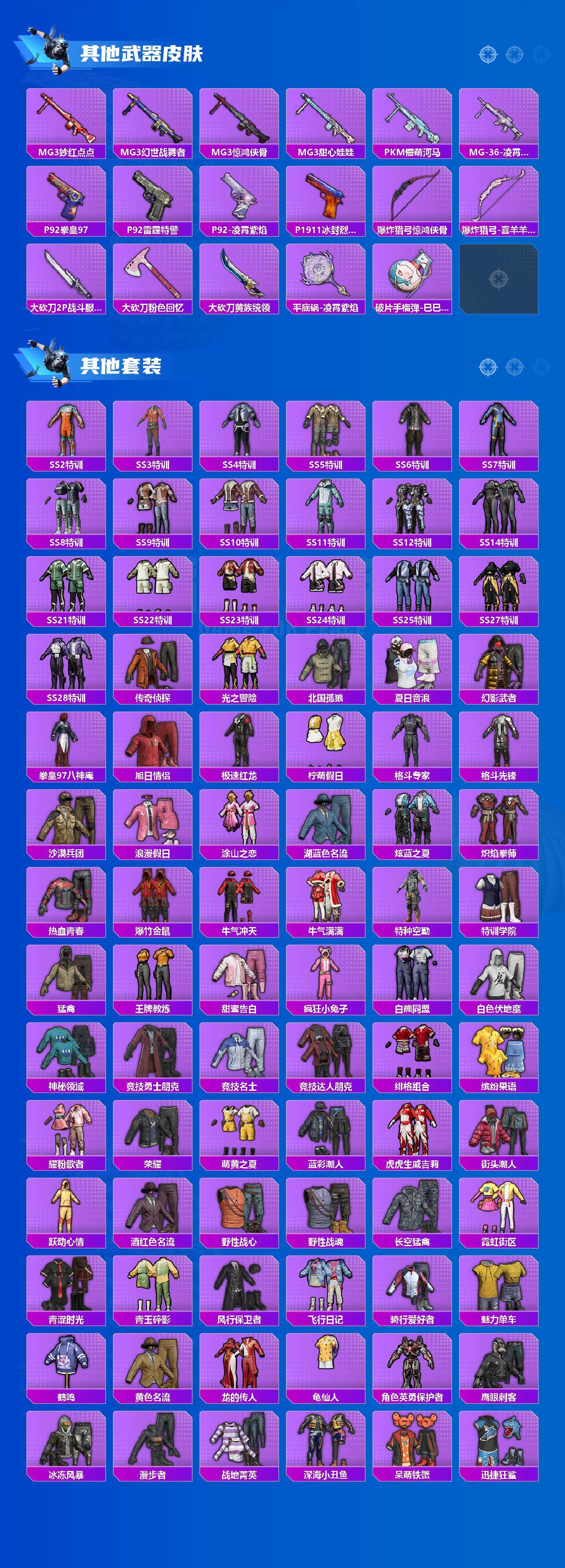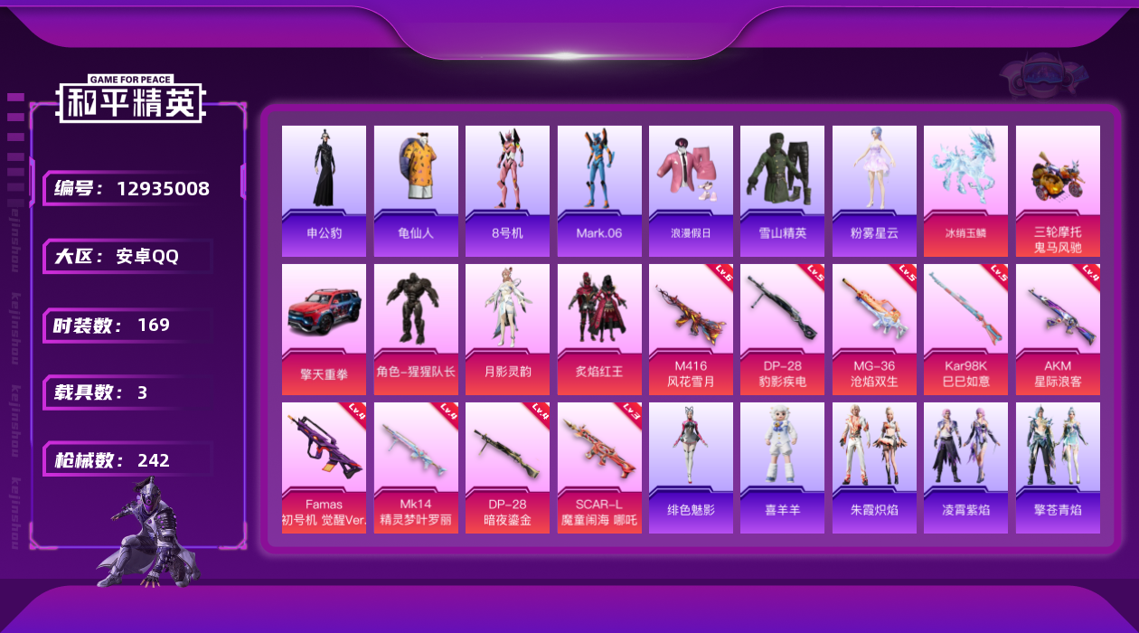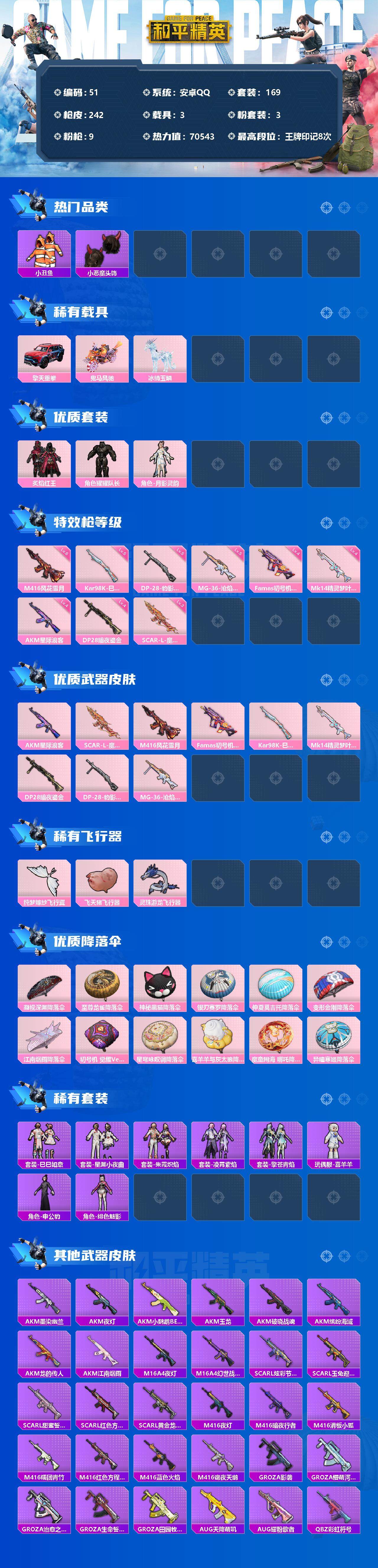 [12935008]安卓 手Q-3粉装-9特效枪-3载具-3粉色飞行器-70543热力值-8王牌印记-169套装-242枪皮 【热门品类】:套装-深海小丑鱼,套装-小丑鱼,套装-龟仙人,角色-8号机,角色-Mark.06,小恶魔头饰 【粉色载具】:擎天重拳,鬼马风驰,冰绡玉鳞 【粉色套装】:粉装-炙焰红王,角色-猩猩队长,角色-月影灵韵 【粉色枪皮等级】:AKM-星际浪客(四级),SCAR-L-魔童闹海 哪吒(三级),M416-风花雪月(六级),Famas-初号机 觉醒Ver.(四级),Kar98K-巳巳如意(五级),Mk14-精灵梦叶罗丽(四级),DP-28-暗夜鎏金(四级),DP-28-豹影疾电(五级),MG-36-沧焰双生(五级) 【粉色枪皮】:AKM-星际浪客,SCAR-L-魔童闹海 哪吒,M416-风花雪月,Famas-初号机 觉醒Ver.,Kar98K-巳巳如意,Mk14-精灵梦叶罗丽,DP-28-暗夜鎏金,DP-28-豹影疾电,MG-36-沧焰双生 【粉色飞行器】:纯梦嫁纱飞行翼,飞天猪飞行器,灵珠游龙飞行器 【粉色降落伞】:凝视深渊降落伞,至尊龙雀降落伞,神秘黑猫降落伞,银刃赛罗降落伞,仲夏莫吉托降落伞,变形金刚降落伞,江南烟雨降落伞,初号机 觉醒Ver.降落伞,星穹咏叹调降落伞,喜羊羊与灰太狼降落伞,魔童闹海 哪吒降落伞,异瞳寒姬降落伞 【稀有套装】:套装-龟仙人,套装-巳巳如意,套装-星渊小夜曲,套装-朱霞炽焰,套装-凌霄紫焰,套装-擎苍青焰,玩偶服-喜羊羊,角色-申公豹,角色-绯色魅影 【稀有枪皮】:AKM-墨染幽兰,AKM-夜灯,AKM-小鹦鹉BEBE,AKM-江南烟雨,AKM-玉龙,AKM-破晓战魂,AKM-缤纷海域,AKM-龙的传人,M16A4-夜灯,M16A4-幻世战舞者,SCAR-L-炫彩节奏,SCAR-L-玉兔迎春,SCAR-L-甜蜜誓约,SCAR-L-红色方程式,SCAR-L-黄金龙骨,M416-夜灯,M416-暗夜行者,M416-滑板小狐,M416-糯团青竹,M416-红色方程式,M416-蓝色火焰,M416-诡夜天鹅,GROZA-影袭,GROZA-懵萌河马,GROZA-治愈之星,GROZA-生命誓言,GROZA-田园牧歌,AUG-天降萌叽,AUG-耀粉歌者,QBZ-彩虹符号,QBZ-神秘黑猫,QBZ-诡娃娃,QBZ-银碳小老虎,M762-天降萌