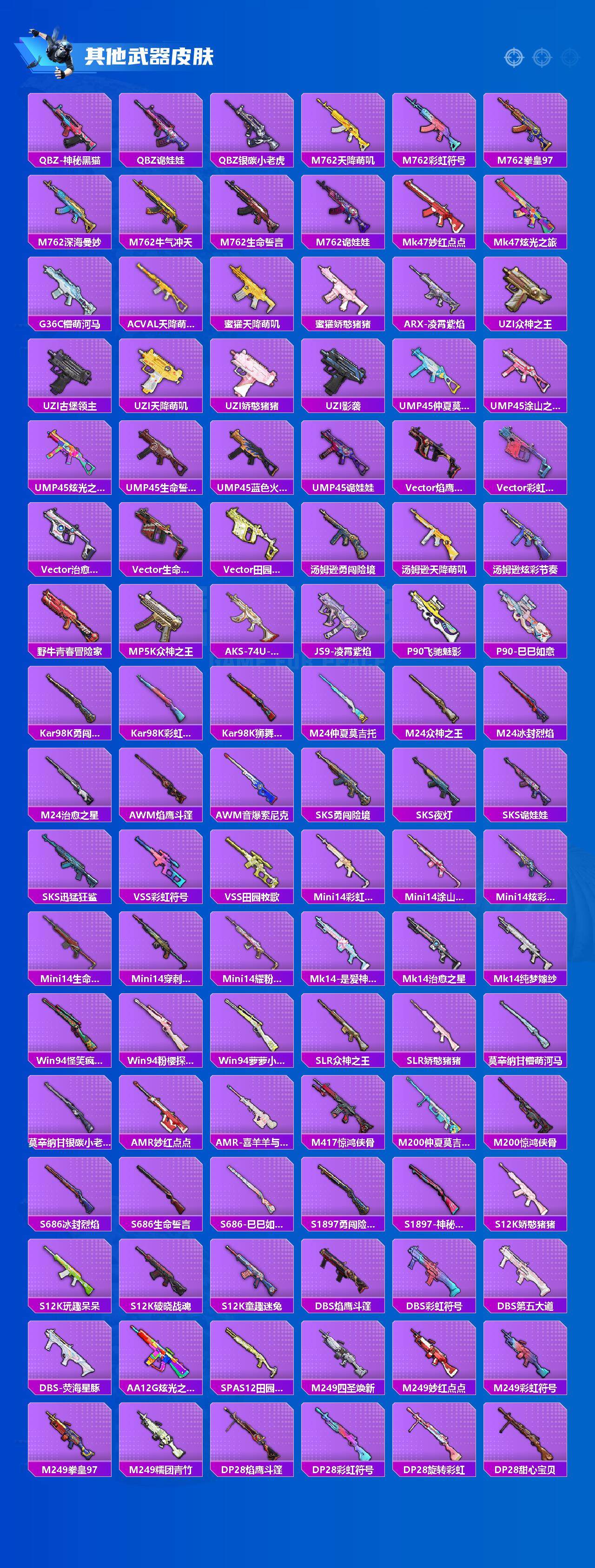 【稀有枪皮】:AKM-墨染幽兰,AKM-夜灯,AKM-小鹦鹉BEBE,AKM-江南烟雨,AKM-玉龙,AKM-破晓战魂,AKM-缤纷海域,AKM-龙的传人,M16A4-夜灯,M16A4-幻世战舞者,SCAR-L-炫彩节奏,SCAR-L-玉兔迎春,SCAR-L-甜蜜誓约,SCAR-L-红色方程式,SCAR-L-黄金龙骨,M416-夜灯,M416-暗夜行者,M416-滑板小狐,M416-糯团青竹,M416-红色方程式,M416-蓝色火焰,M416-诡夜天鹅,GROZA-影袭,GROZA-懵萌河马,GROZA-治愈之星,GROZA-生命誓言,GROZA-田园牧歌,AUG-天降萌叽,AUG-耀粉歌者,QBZ-彩虹符号,QBZ-神秘黑猫,QBZ-诡娃娃,QBZ-银碳小老虎,M762-天降萌