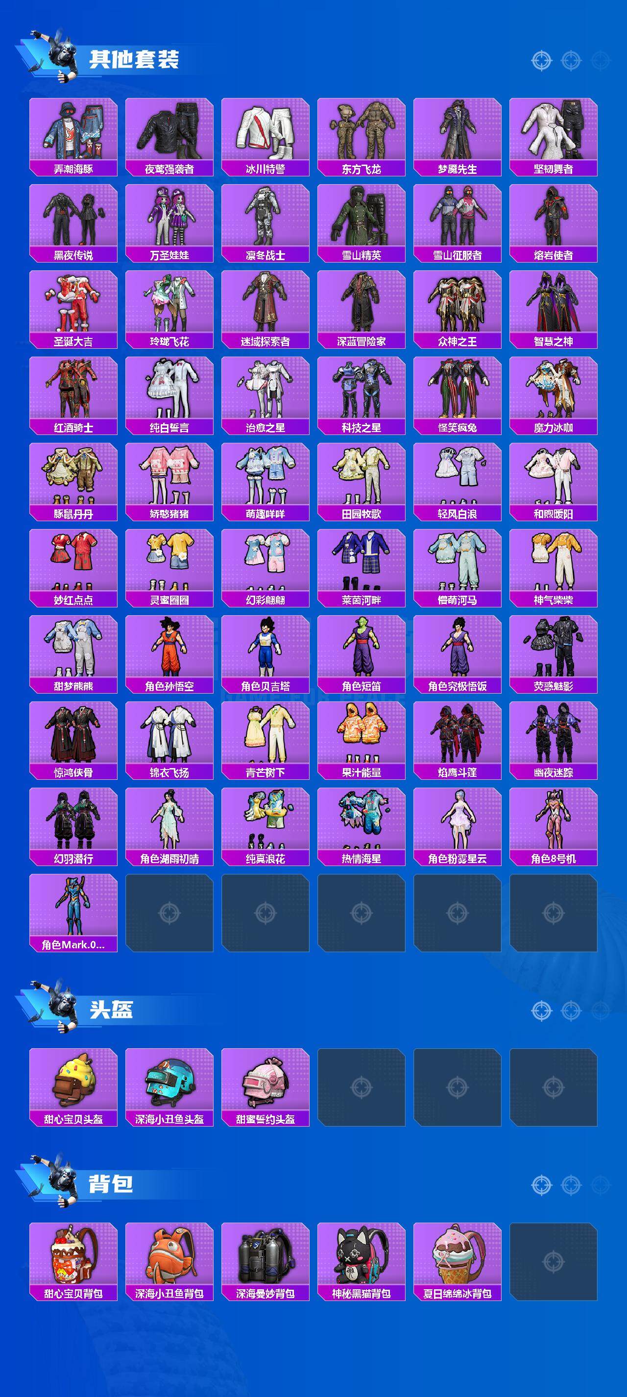 套装-龟仙人,角色-8号机,角色-Mark.06,套装-极速红龙,角色-英勇保护者,套装-漫步者,套装-弄潮海豚,套装-雪山精英,套装-纯白誓言,套装-怪笑疯兔,套装-豚鼠丹丹