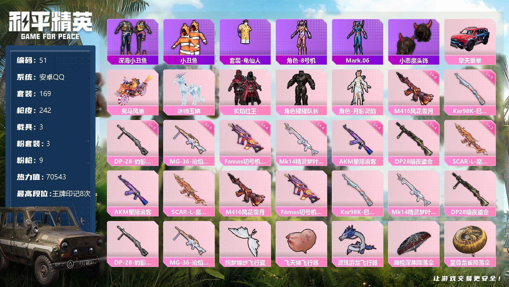 [12935008]安卓 手Q-3粉装-9特效枪-3载具-3粉色飞行器-70543热力值-8王牌印记-169套装-242枪皮
