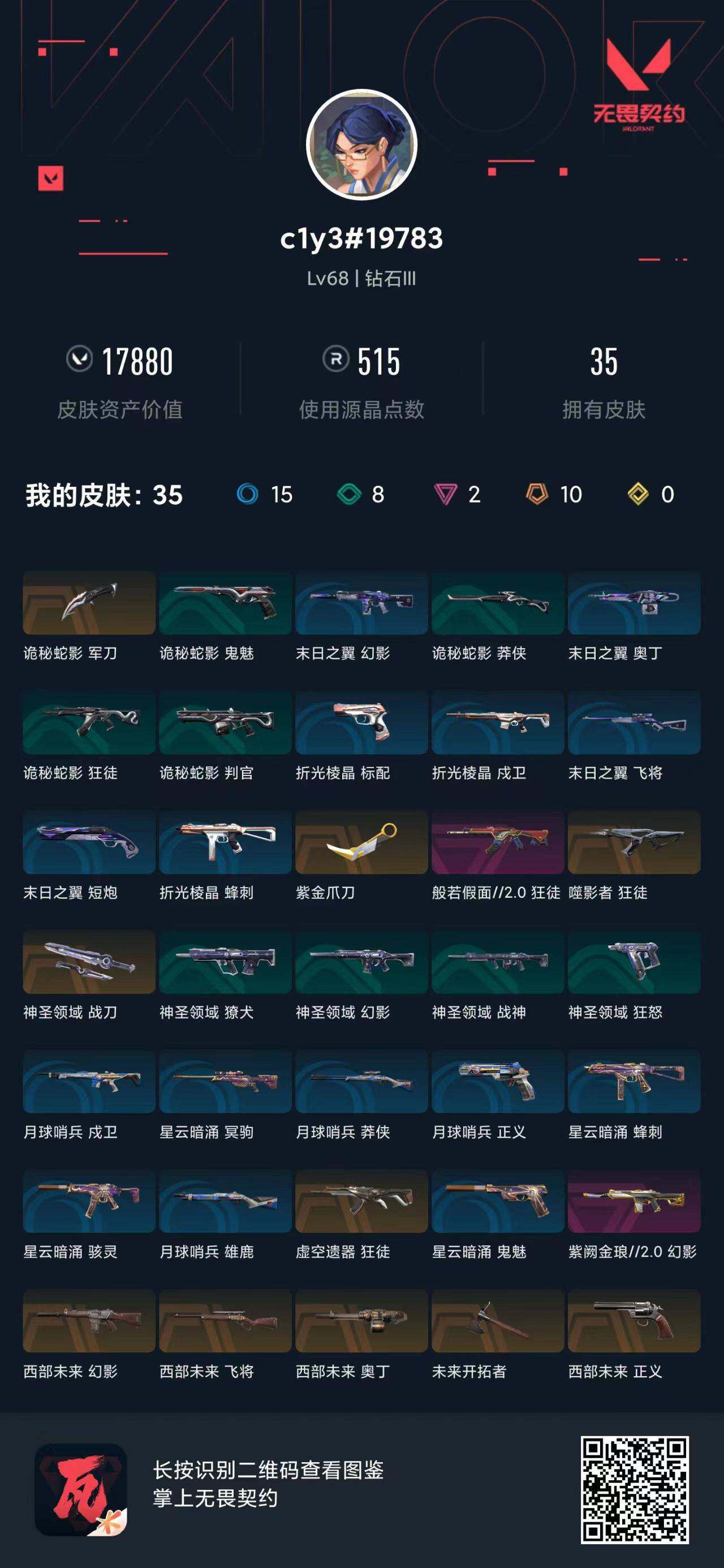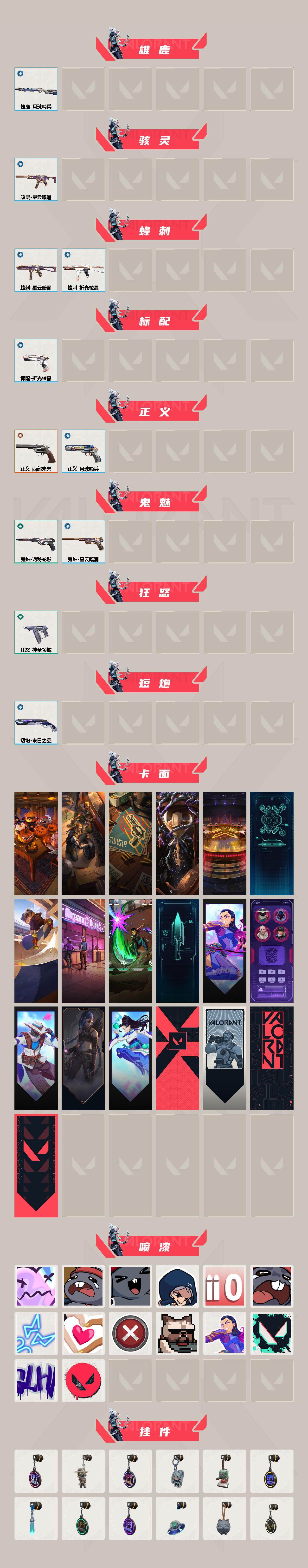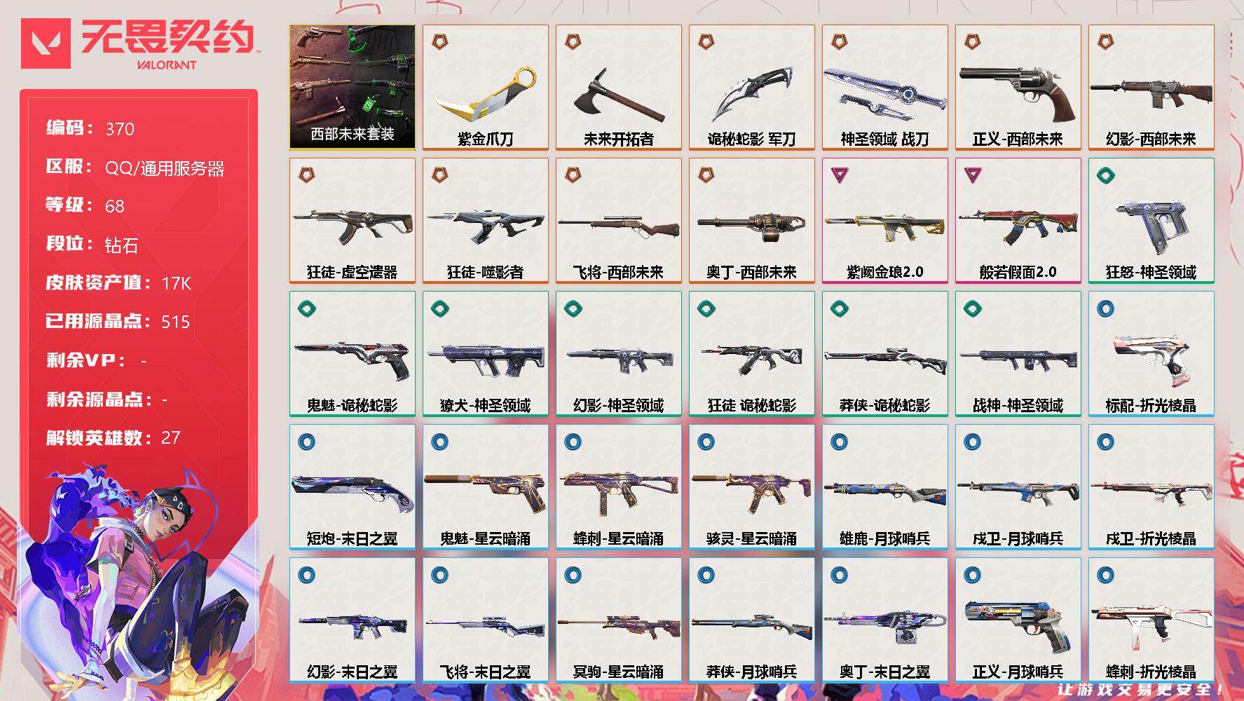 [12935040]【套装】:西部未来套装 【英雄】:幻棱,炼狱,维斯,暮蝶,钛狐,壹决,铁臂,捷风,雷兹,幽影,不死鸟,贤者,猎枭,蝰蛇,零,芮娜,奇乐,尚勃勒,霓虹,斯凯,夜露,星礈,K/O,海神,盖可,黑梦,钢锁 【近战 武器】:近战武器-紫金爪刀,近战武器-未来开拓者,近战武器-诡秘蛇影 军刀,近战武器-神圣领域 战刀 【狂徒】:狂徒-虚空遗器,狂徒-噬影者,狂徒-般若假面//2.0,狂徒-诡秘蛇影 【幻影】:幻影-西部未来,幻影-紫阙金琅//2.0,幻影-神圣领域,幻影-末日之翼,幻影-西部未来 【戍卫】:戍卫-月球哨兵,戍卫-折光棱晶 【獠犬】:獠犬-神圣领域 【冥驹】:冥驹-星云暗涌 【飞将】:飞将-西部未来,飞将-末日之翼 【莽侠】:莽侠-诡秘蛇影,莽侠-月球哨兵 【战神】:战神-神圣领域 【奥丁】:奥丁-西部未来,奥丁-末日之翼 【判官】:判官-诡秘蛇影 【雄鹿】:雄鹿-月球哨兵 【骇灵】:骇灵-星云暗涌 【蜂刺】:蜂刺-星云暗涌,蜂刺-折光棱晶 【标配】:标配-折光棱晶 【正义】:正义-西部未来,正义-月球哨兵 【鬼魅】:鬼魅-诡秘蛇影,鬼魅-星云暗涌 【狂怒】:狂怒-神圣领域 【短炮】:短炮-末日之翼 【卡面】:南瓜盛典 卡面,修车达人 卡面,正义的化身 卡面,时间到 卡面,最高舞台 卡面,声感陷阱设计图 卡面,Clutch 卡面,梦幻奶茶 卡面,源能反应 卡面,零点嗅探设计图 卡面,无畏契约GO!第一卷:芮娜 卡面,清除名单 卡面,无畏契约GO!第一卷:零 卡面,《双城之战》金克丝 卡面,无畏契约GO!第一卷:贤者 卡面,代号红色 卡面,新兵报到 卡面,V契约 卡面,无畏契约 卡面 【喷漆】:伤心心 喷漆,熊抱 喷漆,超级粉丝 喷漆,捷风差距 喷漆,拼一枪 喷漆,我的刀呢? 喷漆,霓光四射 喷漆,双人比心 喷漆,买装还是存钱 喷漆,关门放狗 喷漆,无畏契约GO!第一卷:芮娜 喷漆,胜利属于无畏契约 喷漆,GLHF 喷漆,无畏契约 喷漆 【挂饰】:第九季//第三幕 纪念币 挂饰,无畏契约GO!第一卷 零 挂饰,第九季//第二幕 纪念币 挂饰,袖珍捷风 挂饰,迷你浓缩 挂饰,第九季//第一幕 纪念币 挂饰,荧光棒 挂饰,第八季//第三幕 纪念币 挂饰,第八季//第二幕 纪念币 挂饰 ,天外飞客 挂饰,《双城之战》魄罗 挂饰,无畏契约 纪念币 挂饰