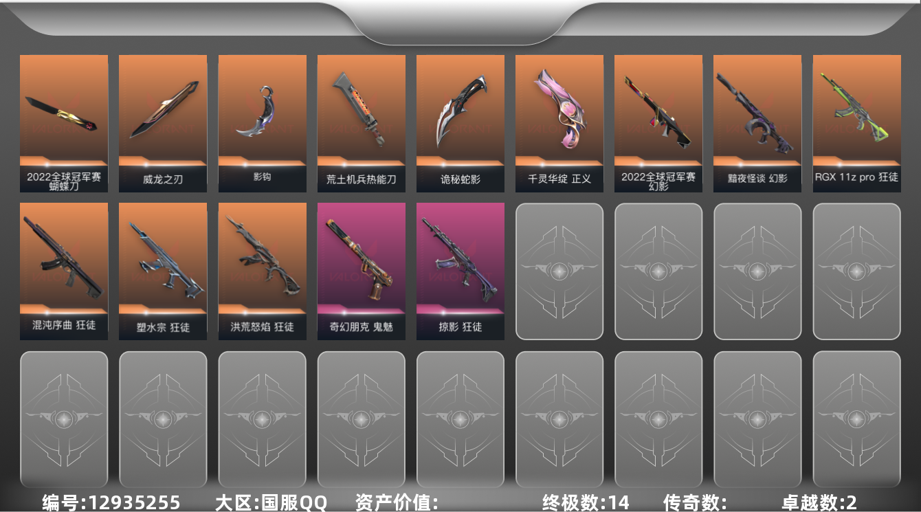 [12935255]【套装】:2022全球冠军赛套装 【英雄】:幻棱,炼狱,暮蝶,钛狐,壹决,铁臂,捷风,雷兹,幽影,不死鸟,贤者,猎枭,蝰蛇,零,芮娜,尚勃勒,夜露,K/O,黑梦,钢锁 【近战 武器】:近战武器-2022全球冠军赛 蝴蝶刀,近战武器-影钩,近战武器-威龙之刃,近战武器-荒土机兵 热能刀,近战武器-诡秘蛇影 军刀 【狂徒】:狂徒-洪荒怒焰,狂徒-混沌序曲,狂徒-塑水宗,狂徒-RGX 11z Pro,狂徒-掠影,狂徒-荒土机兵,狂徒-诡秘蛇影 【幻影】:幻影-2022全球冠军赛,幻影-黯夜怪谈,幻影-纳米打击,幻影-末日之翼 【戍卫】:戍卫-逆冲蛮牛,戍卫-折光棱晶 【獠犬】:獠犬-逆冲蛮牛 【冥驹】:冥驹-荒土机兵 【飞将】:飞将-末日之翼 【莽侠】:莽侠-诡秘蛇影 【奥丁】:奥丁-纳米打击,奥丁-末日之翼 【判官】:判官-诡秘蛇影,判官-纳米打击x 【雄鹿】:雄鹿-逆冲蛮牛 【骇灵】:骇灵-混沌序曲//2.0,骇灵-荒土机兵,骇灵-无限竞技 【蜂刺】:蜂刺-折光棱晶 【标配】:标配-荒土机兵,标配-折光棱晶 【正义】:正义-千灵华绽,正义-纳米打击 【鬼魅】:鬼魅-奇幻朋克,鬼魅-诡秘蛇影,鬼魅-星云暗涌 【狂怒】:狂怒-逆冲蛮牛 【短炮】:短炮-末日之翼 【卡面】:终章:激斗汉堡 卡面,进入射程 卡面,分崩离析 卡面,纳米打击 卡面,抑制技术 卡面,激斗汉堡 卡面,瓦娃脸雪糕 P2 卡面,从黄昏到黎明 卡面,荒土机兵 卡面,银弹猎手 卡面,逆冲蛮牛 卡面,《双城之战》拥抱 卡面,精灵大战 卡面,欢迎来到底城 卡面,南瓜盛典 卡面,正义的化身 卡面,无畏契约GO!第一卷:芮娜 卡面,无畏契约GO!第一卷:零 卡面,《双城之战》金克丝 卡面,沙尘幻旅 卡面,壹决工牌 卡面,代号红色 卡面,新兵报到 卡面,V契约 卡面,无畏契约 卡面 【喷漆】:小小心意 喷漆,战“素”兔 喷漆,宇宙的指引 喷漆,请求重启 喷漆,逆冲蛮牛 喷漆,纳米打击 喷漆,鼻尖上的蝴蝶 喷漆,简笔画黯兽 喷漆,独守蝰腹 喷漆,他们将落荒而逃 喷漆,通缉:战术企鹅 喷漆,荒土机兵 喷漆,别挡我吃球! 喷漆,嗨宝南瓜灯 喷漆,嘭! 喷漆,都算到了 喷漆,控场勿近 喷漆,买装还是存钱 喷漆,酷熊冲浪 喷漆,暴走萝莉 喷漆,胜利属于无畏契约 喷漆,GLHF 喷漆,无畏契约 喷漆 【挂饰】:终章:猫猫木乃伊