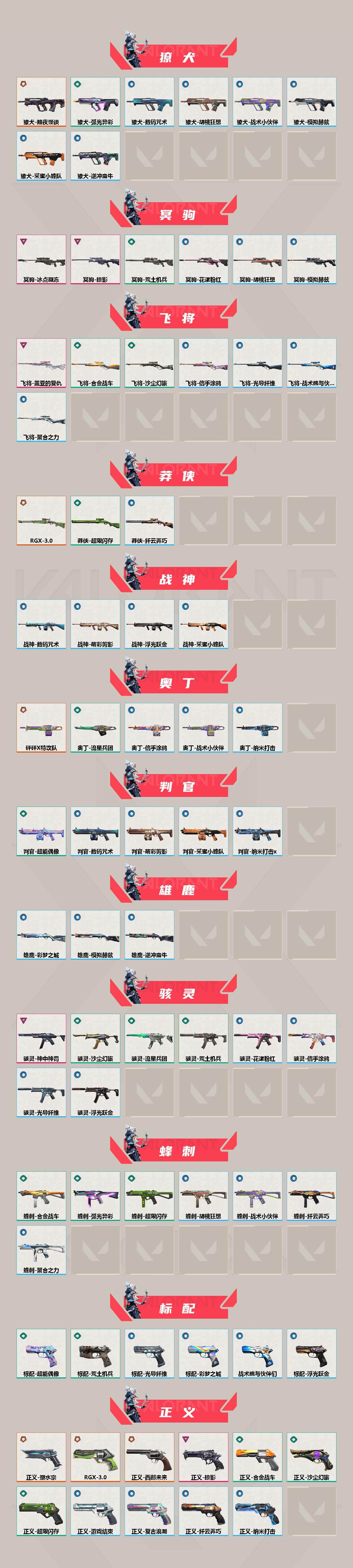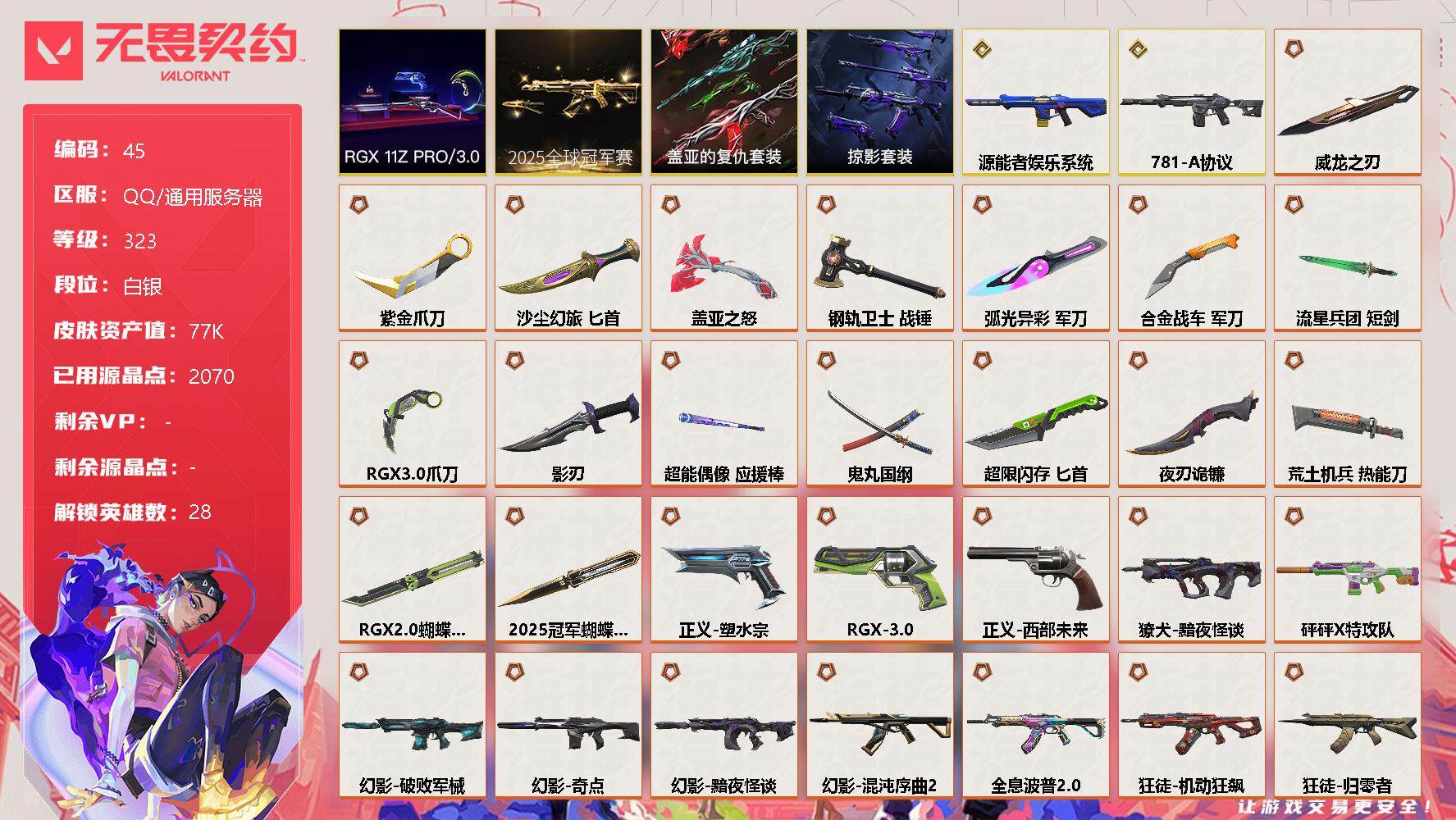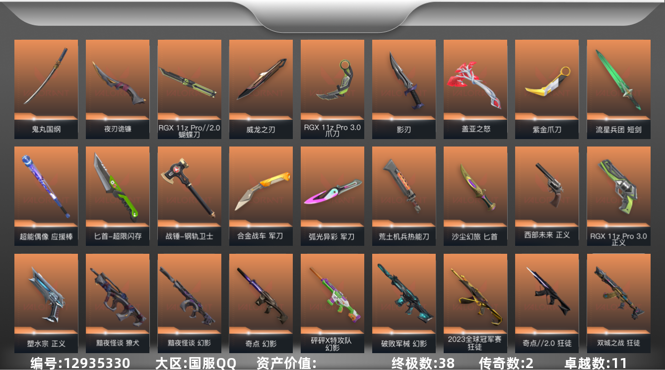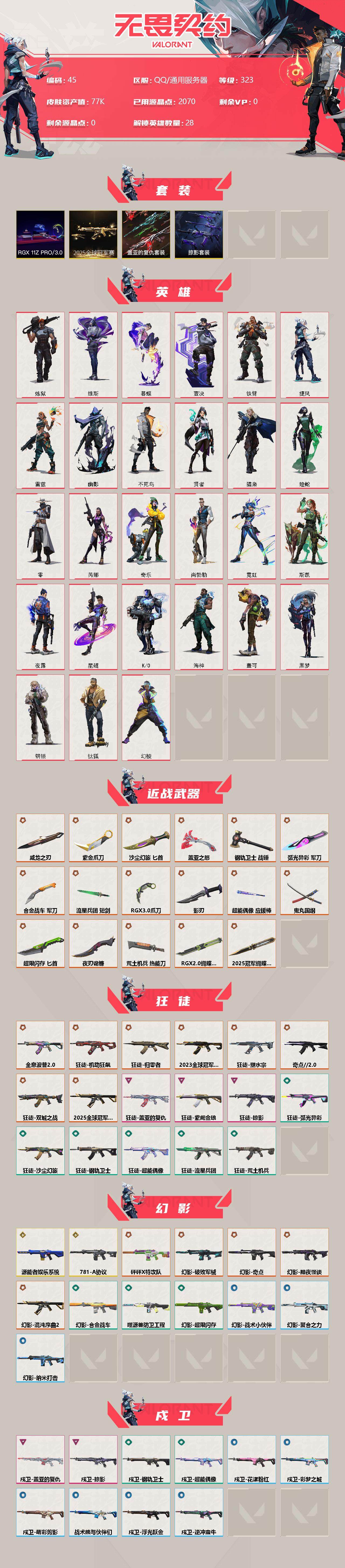[12935330]【套装】:2025全球冠军赛套装,RGX 11z Pro//3.0套装,掠影套装,盖亚的复仇套装 【英雄】:幻棱,炼狱,维斯,暮蝶,钛狐,壹决,铁臂,捷风,雷兹,幽影,不死鸟,贤者,猎枭,蝰蛇,零,芮娜,奇乐,尚勃勒,霓虹,斯凯,夜露,星礈,K/O,海神,盖可,黑梦,钢锁 【近战 武器】:近战武器-2025全球冠军赛 蝴蝶刀,近战武器-RGX 11z Pro//2.0 蝴蝶刀,近战武器-紫金爪刀,近战武器-RGX 11z Pro//3.0 爪刀,近战武器-威龙之刃,近战武器-鬼丸国纲,近战武器-流星兵团 短剑,近战武器-超能偶像 应援棒,近战武器-超限闪存 匕首,近战武器-盖亚之怒,近战武器-钢轨卫士 战锤,近战武器-合金战车 军刀,近战武器-弧光异彩 军刀,近战武器-荒土机兵 热能刀,近战武器-沙尘幻旅 匕首,近战武器-夜刃诡镰,近战武器-影刃 【狂徒】:狂徒-2025全球冠军赛,狂徒-2023全球冠军赛,狂徒-归零者,狂徒-机动狂飙,狂徒-奇点//2.0,狂徒-全息波普//2.0,狂徒-双城之战,狂徒-塑水宗,狂徒-掠影,狂徒-盖亚的复仇,狂徒-紫阙金琅,狂徒-超能偶像,狂徒-钢轨卫士,狂徒-弧光异彩,狂徒-荒土机兵,狂徒-流星兵团,狂徒-沙尘幻旅 【幻影】:幻影-781-A协议,幻影-源能者娱乐系统,幻影-黯夜怪谈,幻影-砰砰X特攻队,幻影-破败军械,幻影-奇点,幻影-混沌序曲//2.0,幻影-超限闪存,幻影-合金战车,幻影-噬源兽防卫工程,幻影-聚合之力,幻影-纳米打击,幻影-战术小伙伴 【戍卫】:戍卫-掠影,戍卫-盖亚的复仇,戍卫-超能偶像,戍卫-钢轨卫士,戍卫-彩梦之城,戍卫-浮光跃金,戍卫-花漾粉红,戍卫-萌彩剪影,戍卫-逆冲蛮牛,戍卫-战术熊与伙伴们 【獠犬】:獠犬-黯夜怪谈,獠犬-弧光异彩,獠犬-采蜜小蜂队,獠犬-胡桃狂想,獠犬-模拟赫兹,獠犬-逆冲蛮牛,獠犬-数码咒术,獠犬-战术小伙伴 【冥驹】:冥驹-冰点凝冻,冥驹-掠影,冥驹-荒土机兵,冥驹-胡桃狂想,冥驹-花漾粉红,冥驹-模拟赫兹 【飞将】:飞将-盖亚的复仇,飞将-合金战车,飞将-沙尘幻旅,飞将-聚合之力,飞将-信手涂鸦,飞将-光导纤维,飞将-战术熊与伙伴们 【莽侠】:莽侠-RGX 11z Pro//3.0,莽侠-超限闪存,莽侠-纤云弄巧 【战神】:战神-采蜜小蜂队,战神-浮光跃金,战神-