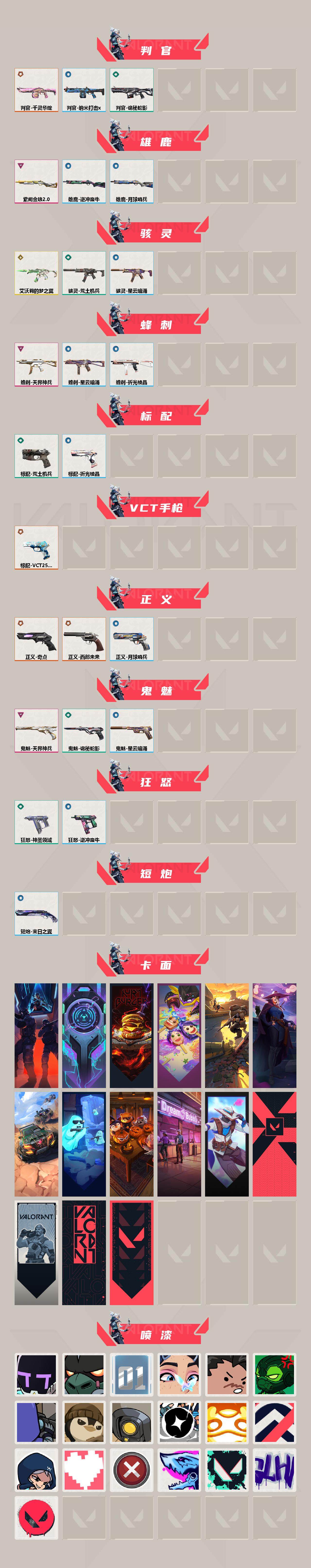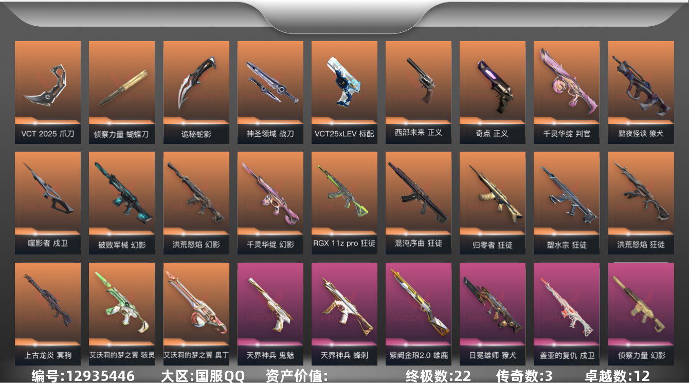 [12935446]【套装】:VCT 2025 赛季套装 【英雄】:幻棱,炼狱,维斯,暮蝶,钛狐,壹决,铁臂,捷风,雷兹,幽影,不死鸟,贤者,猎枭,蝰蛇,零,芮娜,奇乐,尚勃勒,霓虹,斯凯,夜露,星礈,K/O,海神,盖可,黑梦,钢锁 【近战 武器】:近战武器-侦察力量 蝴蝶刀,近战武器-VCT 2025 爪刀,近战武器-诡秘蛇影 军刀,近战武器-神圣领域 战刀 【狂徒】:狂徒-2025全球冠军赛,狂徒-归零者,狂徒-洪荒怒焰,狂徒-混沌序曲,狂徒-塑水宗,狂徒-RGX 11z Pro,狂徒-堕天遗武,狂徒-盖亚的复仇,狂徒-离子武器//2.0,狂徒-荒土机兵,狂徒-金纹世家,狂徒-诡秘蛇影 【幻影】:幻影-洪荒怒焰,幻影-破败军械,幻影-千灵华绽,幻影-侦察力量,幻影-神圣领域,幻影-末日之翼 【戍卫】:戍卫-噬影者,戍卫-盖亚的复仇,戍卫-逆冲蛮牛,戍卫-月球哨兵,戍卫-折光棱晶 【獠犬】:獠犬-黯夜怪谈,獠犬-日冕雄师,獠犬-神圣领域,獠犬-逆冲蛮牛 【冥驹】:冥驹-上古龙炎,冥驹-离子武器,冥驹-荒土机兵,冥驹-星云暗涌 【飞将】:飞将-天界神兵,飞将-末日之翼 【莽侠】:莽侠-诡秘蛇影,莽侠-月球哨兵 【战神】:战神-离子武器//2.0,战神-神圣领域 【奥丁】:奥丁-艾沃莉的梦之翼,奥丁-纳米打击,奥丁-末日之翼 【判官】:判官-千灵华绽,判官-诡秘蛇影,判官-纳米打击x 【雄鹿】:雄鹿-紫阙金琅//2.0,雄鹿-逆冲蛮牛,雄鹿-月球哨兵 【骇灵】:骇灵-艾沃莉的梦之翼,骇灵-荒土机兵,骇灵-星云暗涌 【蜂刺】:蜂刺-天界神兵,蜂刺-星云暗涌,蜂刺-折光棱晶 【标配】:标配-荒土机兵,标配-折光棱晶 【VCT手枪】:标配-VCT25 x LEV 【正义】:正义-奇点,正义-西部未来,正义-月球哨兵 【鬼魅】:鬼魅-天界神兵,鬼魅-诡秘蛇影,鬼魅-星云暗涌 【狂怒】:狂怒-神圣领域,狂怒-逆冲蛮牛 【短炮】:短炮-末日之翼 【卡面】:纳米打击 卡面,抑制技术 卡面,激斗汉堡 卡面,瓦娃脸雪糕 P2 卡面,荒土机兵 卡面,银弹猎手 卡面,逆冲蛮牛 卡面,精灵大战 卡面,南瓜盛典 卡面,梦幻奶茶 卡面,无畏契约GO!第一卷:零 卡面,代号红色 卡面,新兵报到 卡面,V契约 卡面,无畏契约 卡面 【喷漆】:请求重启 喷漆,逆冲蛮牛 喷漆,纳米打击 喷漆,鼻尖上的蝴蝶 喷漆,简笔画黯