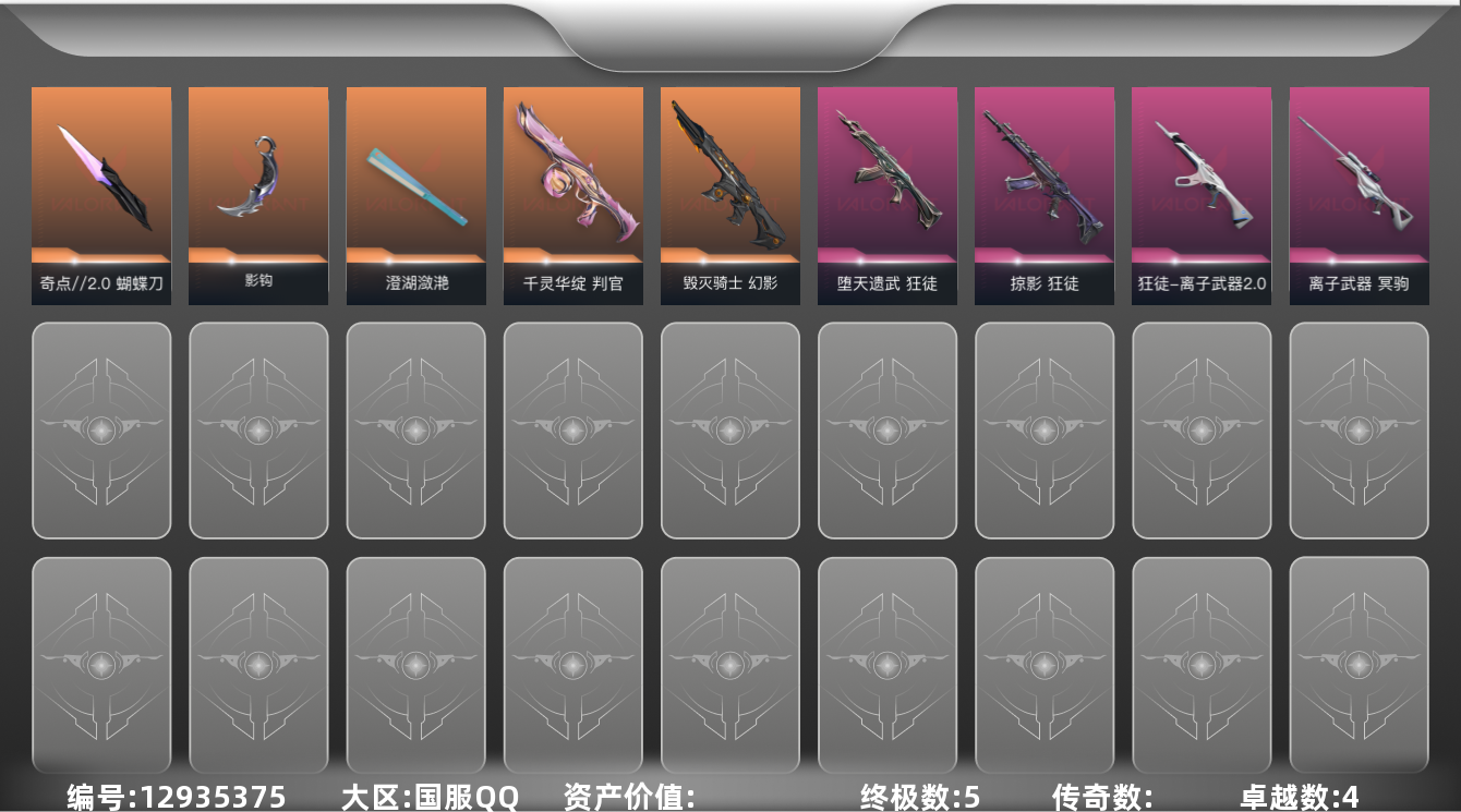 [12935375]【英雄】:幻棱,炼狱,暮蝶,钛狐,壹决,捷风,幽影,不死鸟,贤者,猎枭,蝰蛇,零,芮娜,尚勃勒,霓虹,夜露,盖可,钢锁 【近战 武器】:近战武器-影钩,近战武器-奇点//2.0 蝴蝶刀,近战武器-澄湖潋滟 【狂徒】:狂徒-堕天遗武,狂徒-掠影,狂徒-离子武器//2.0 【幻影】:幻影-毁灭骑士 【冥驹】:冥驹-离子武器 【判官】:判官-千灵华绽 【正义】:正义-超限闪存,正义-纳米打击 【鬼魅】:鬼魅-诡秘蛇影,鬼魅-宿怨,鬼魅-星云暗涌 【卡面】:终章:激斗汉堡 卡面,进入射程 卡面,《双城之战》拥抱 卡面,精灵大战 卡面,欢迎来到底城 卡面,南瓜盛典 卡面,钢弓与箭弦 卡面,修车达人 卡面,正义的化身 卡面,音熊登场 卡面,梦幻奶茶 卡面,西装暴徒 卡面,源能反应 卡面,零点嗅探设计图 卡面,沙雕爆能器 卡面,无畏契约GO!第一卷:芮娜 卡面,清除名单 卡面,无畏契约GO!第一卷:零 卡面,势不可挡//盖可 卡面,铁臂设计图 卡面,代号红色 卡面,冰淇淋店 卡面,新兵报到 卡面,友军火力 卡面,V契约 卡面,无畏契约 卡面 【喷漆】:嗨宝南瓜灯 喷漆,嘭! 喷漆,都算到了 喷漆,控场勿近 喷漆,小丑猫 喷漆,熊抱 喷漆,捷风差距 喷漆,拼一枪 喷漆,我觉得不行 喷漆,致命优雅 喷漆,我的刀呢? 喷漆,新潮流 喷漆,双击点赞 喷漆,买装还是存钱 喷漆,蕊形灯 喷漆,口袋贤者 喷漆,胜利属于无畏契约 喷漆,GLHF 喷漆,无畏契约 喷漆 【挂饰】:终章:猫猫木乃伊 挂饰,悠闲鸡块 挂饰,伞绳 挂饰,《双城之战》小蛋糕 挂饰,第九季//第三幕 纪念币 挂饰,拳击战术熊 挂饰,工具腰带 挂饰,无畏契约GO!第一卷 芮娜 挂饰,无畏契约GO!第一卷 零 挂饰,熔岩灯 挂饰,第九季//第二幕 纪念币 挂饰,袖珍捷风 挂饰,Z世代特饮 挂饰,第九季//第一幕 纪念币 挂饰,战术河童 挂饰,荧光棒 挂饰,第八季//第三幕 纪念币 挂饰,第八季//第二幕 纪念币 挂饰 ,天外飞客 挂饰,第七季//第三幕 纪念币 挂饰,幸运中国结 挂饰,无畏契约 纪念币 挂饰