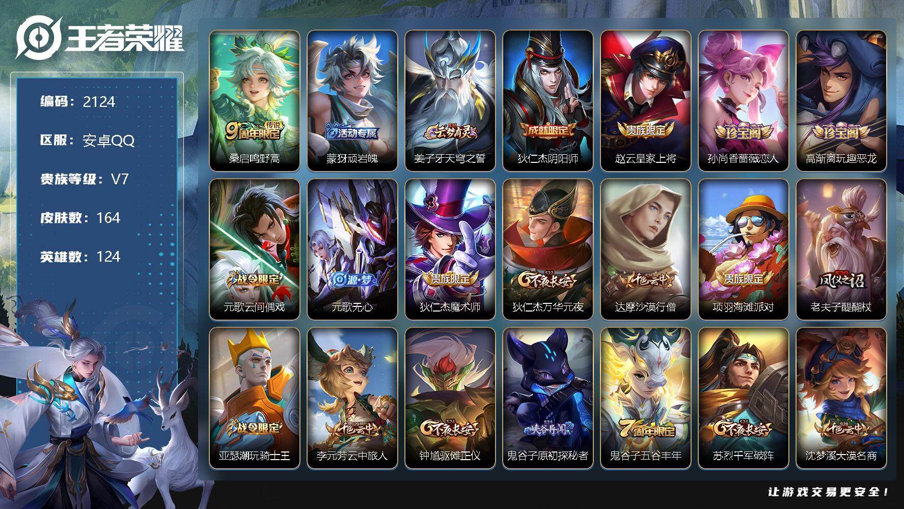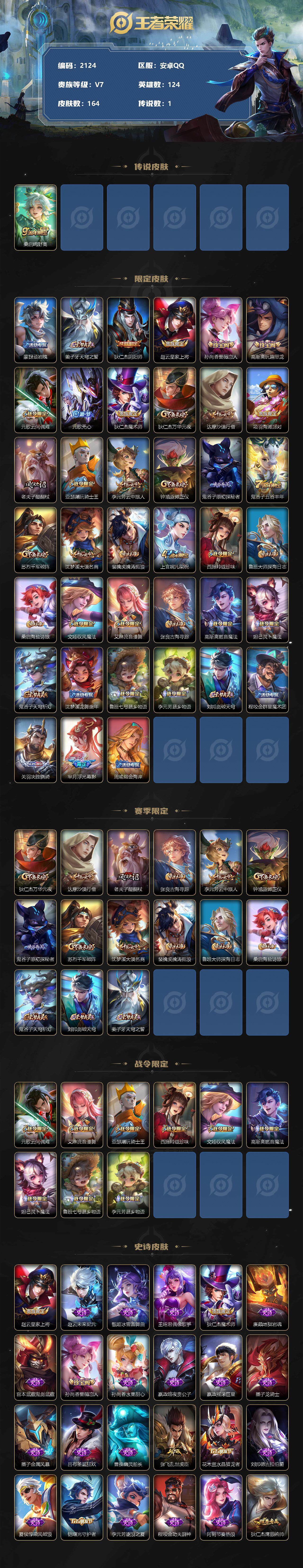 [12935456]安卓Q-V6-最强王者段位-124英雄-164皮肤-0典藏-0珍品无双-0无双-0珍品传说-1传说-40史诗