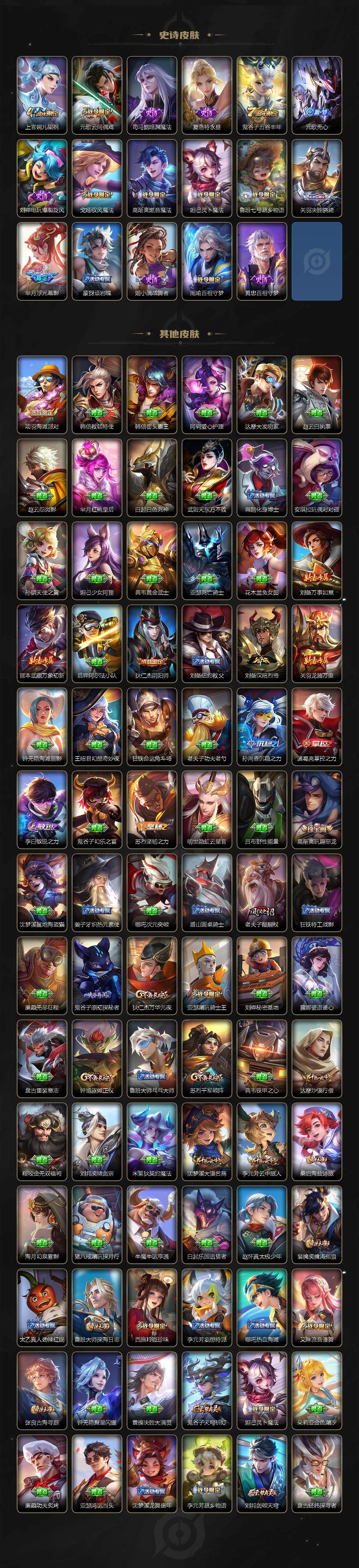【史诗皮肤】:赵云皇家上将,赵云未来纪元,甄姬冰雪圆舞曲,王昭君偶像歌手,狄仁杰魔术师,廉颇地狱岩魂,宫本武藏鬼剑武藏,孙尚香蔷薇恋人,孙尚香水果甜心,嬴政暗夜贵公子,嬴政摇滚巨星,墨子龙骑士,墨子金属风暴,吕布圣诞狂欢,曹操幽灵船长,张飞乱世虎臣,花木兰水晶猎龙者,刘邦德古拉伯爵,夏侯惇乘风破浪,铠曙光守护者,李元芳逐浪之夏,程咬金功夫厨神,阿轲节奏热浪,狄仁杰鹰眼统帅,上官婉儿梁祝,元歌云间偶戏,司马懿暗渊魔法,夏洛特永昼,鬼谷子五谷丰年,元歌无心,刘禅电玩爆裂旋风,戈娅驭风魔法,妲己灵卜魔法,高渐离燃音魔法,鲁班七号蔬乡物语,关羽决胜骁骑,芈月浮光幕影,蒙犽顽岩魄,姬小满战舞者,周瑜百相守梦,黄忠百相守梦