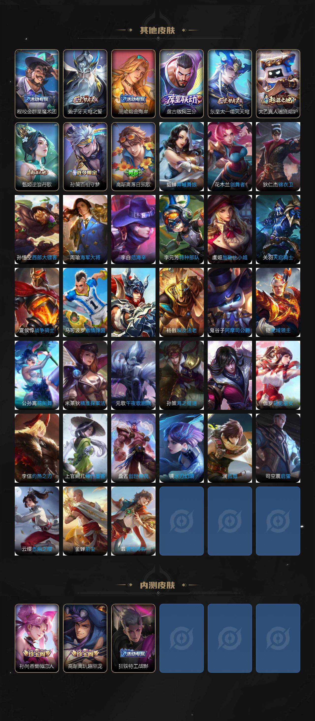 【赛季限定】:狄仁杰万华元夜,达摩沙漠行僧,老夫子醍醐杖,张良古海寻踪,李元芳云中旅人,钟馗驱傩正仪,鬼谷子原初探秘者,苏烈千军破阵,沈梦溪大漠名商,裴擒虎擒涛扼浪,鲁班大师探海日志,桑启海盐诗旅,鬼谷子天穹祈灯,刘邦剑破天穹,姜子牙天穹之誓
