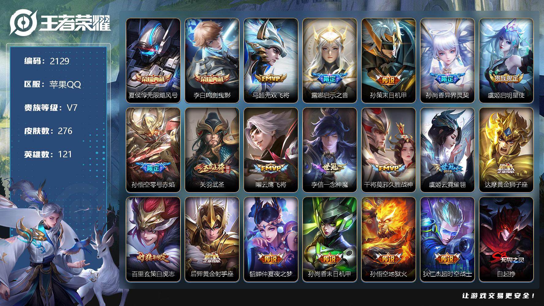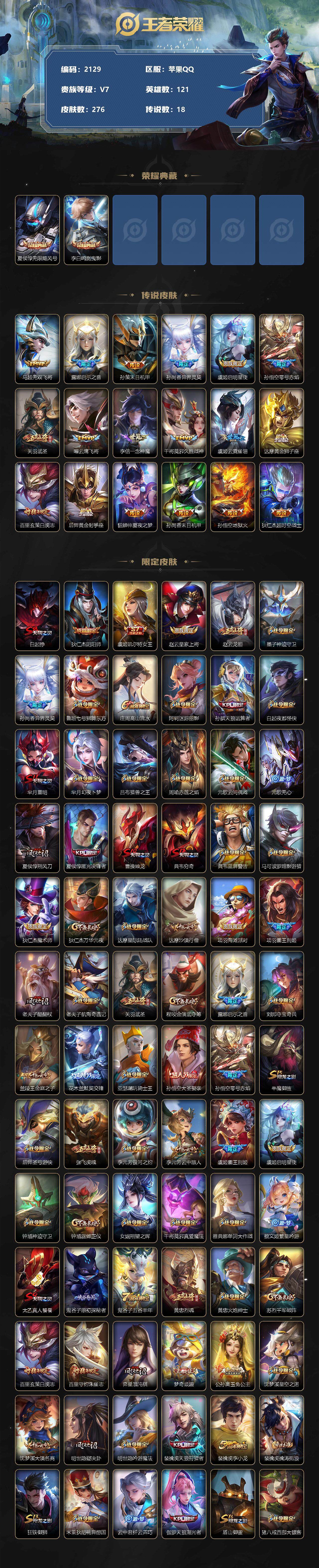 [12936049]苹果Q-V7-永恒钻石V段位-121英雄-276皮肤-2典藏-0珍品无双-0无双-0珍品传说-18传说-70史诗