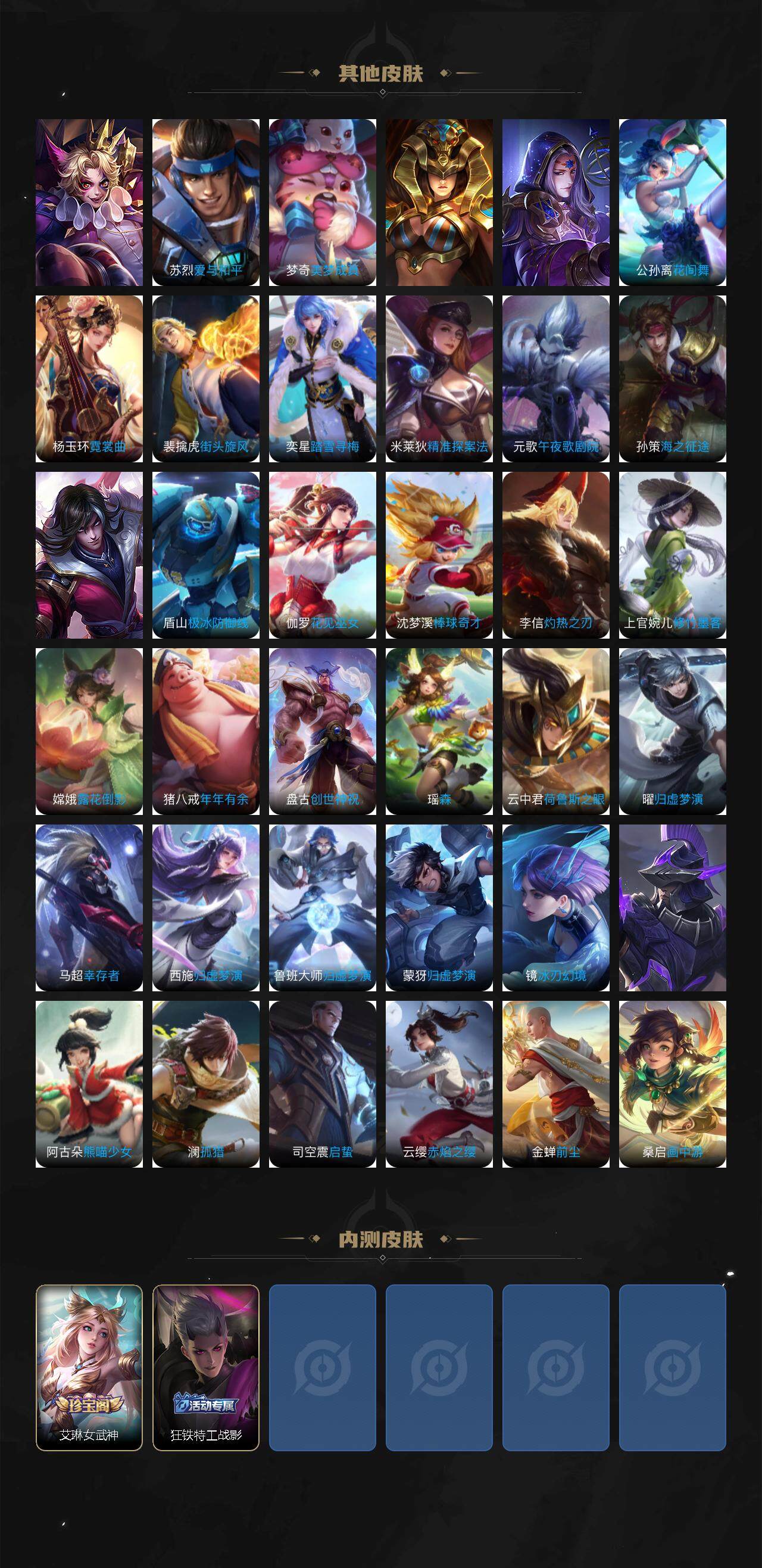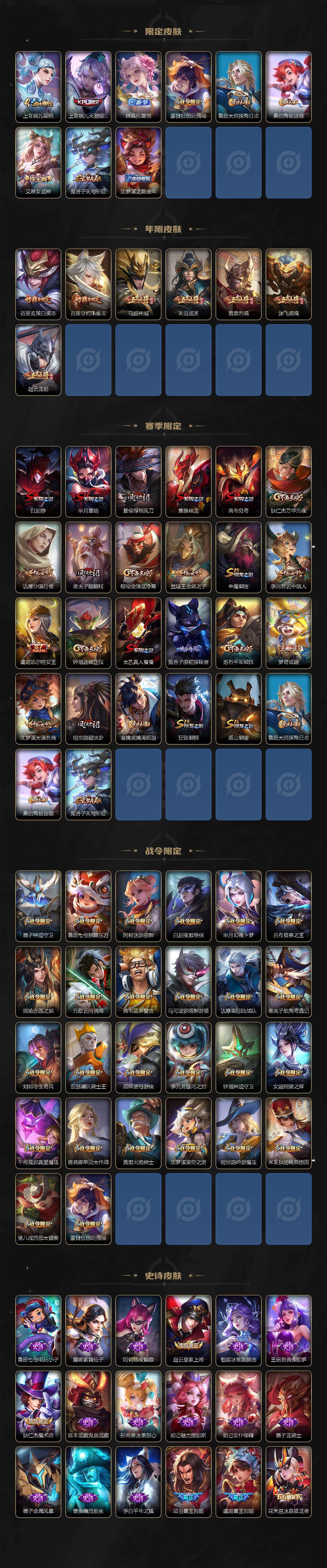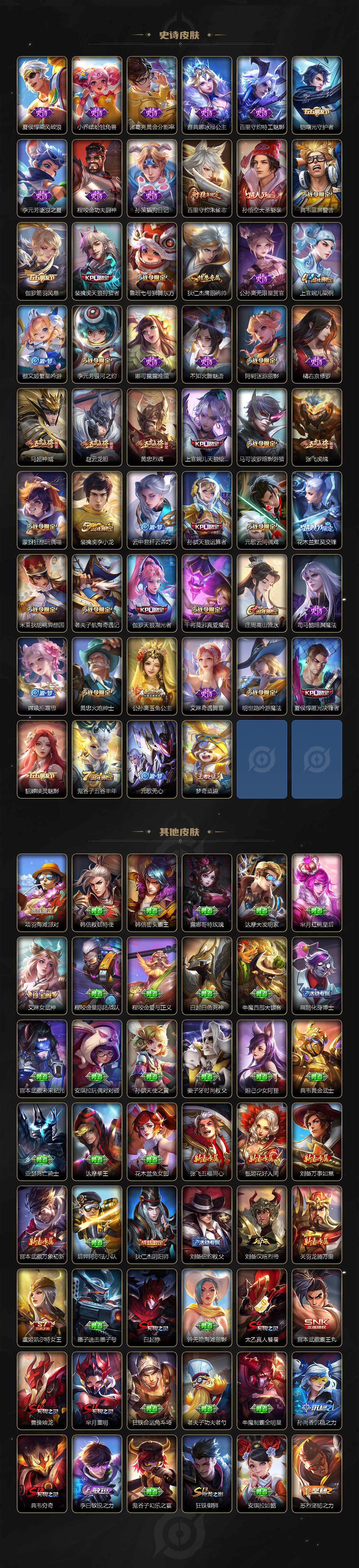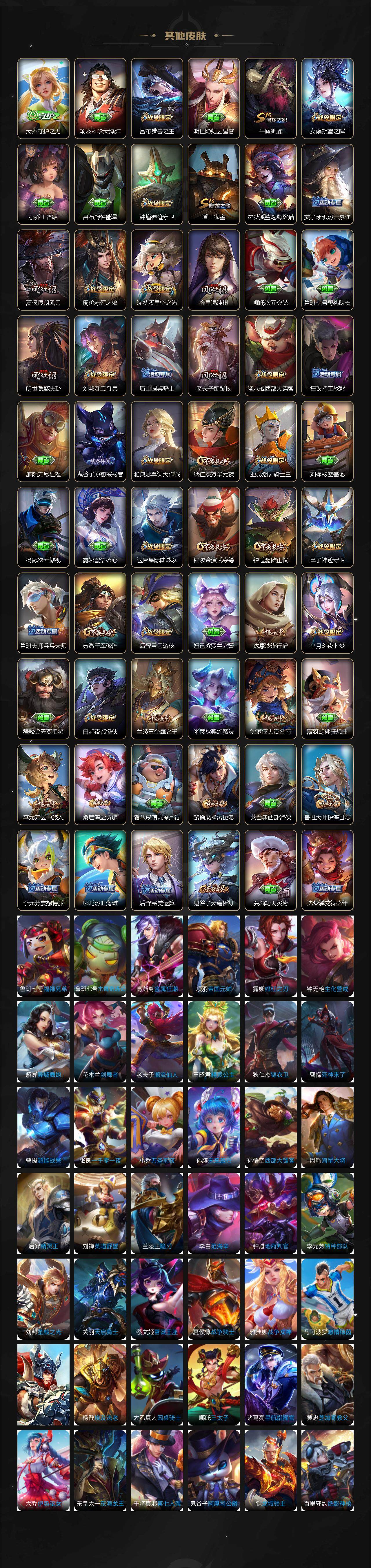 【限定皮肤】:白起狰,狄仁杰阴阳师,虞姬凯尔特女王,赵云皇家上将,赵云龙胆,墨子神迹守卫,孙尚香异界灵契,鲁班七号狮舞东方,庄周高山流水,阿轲迷踪丽影,孙膑天狼运算者,白起夜都怪侠,芈月重明,芈月幻夜卜梦,吕布猎兽之王,周瑜赤莲之焰,元歌云间偶戏,元歌无心,夏侯惇朔风刀,夏侯惇匿光决锋者,曹操烛龙,典韦穷奇,典韦蓝屏警告,马可波罗暗影游猎,狄仁杰魔术师,狄仁杰万华元夜,达摩星际陆战队,达摩沙漠行僧,项羽海滩派对,项羽霸王别姬,老夫子醍醐杖,老夫子航海奇遇记,关羽武圣,程咬金演武夺筹,露娜启示之音,刘邦夺宝奇兵,兰陵王金庭之子,花木兰默契交锋,亚瑟潮玩骑士王,孙悟空大圣娶亲,孙悟空零号赤焰,牛魔御旌,后羿圣弓游侠,张飞虎魄,李元芳银河之约,李元芳云中旅人,虞姬霸王别姬,虞姬启明星使,钟馗神迹守卫,钟馗驱傩正仪,女娲朔望之晖,干将莫邪真爱魔法,雅典娜单词大作战,蔡文姬繁星吟游,太乙真人饕餮,鬼谷子原初探秘者,鬼谷子五谷丰年,黄忠烈魂,黄忠火炮绅士,苏烈千军破阵,百里玄策白虎志,百里守约朱雀志,弈星混沌棋,梦奇顽趣,公孙离玉兔公主,沈梦溪星空之诺,沈梦溪大漠名商,明世隐疑决卦,明世隐吟游魔法,裴擒虎天狼狩猎者,裴擒虎李小龙,裴擒虎擒涛扼浪,狂铁御狮,米莱狄胡桃异想国,云中君纤云弄巧,伽罗天狼溯光者,盾山御銮,猪八戒西部大镖客,上官婉儿梁祝,上官婉儿天狼绘梦者,嫦娥拒霜思,蒙犽狂想玩偶喵,鲁班大师探海日志,桑启海盐诗旅,艾琳女武神,鬼谷子天穹祈灯,沈梦溪龙舞盛年