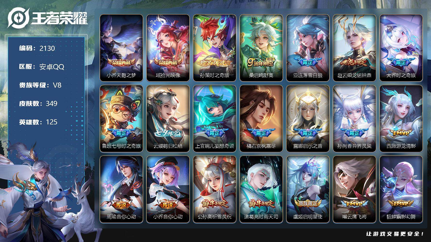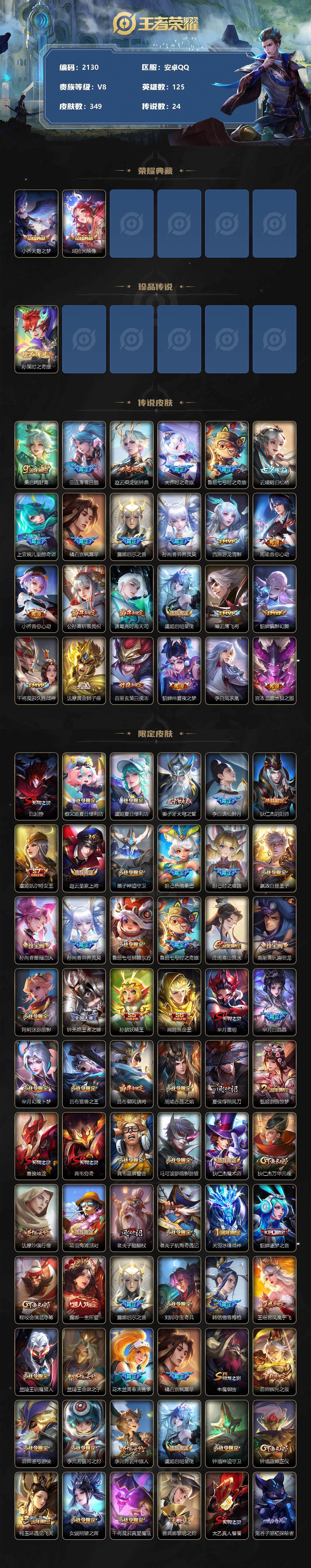 [12936090]安卓Q-V8-最强王者段位-125英雄-349皮肤-2典藏-0珍品无双-0无双-1珍品传说-24传说-102史诗 【英雄全皮】:刘禅全皮,阿轲全皮,蒙恬全皮 【荣耀典藏】:小乔天鹅之梦,瑶拾光映像 【珍品传说】:孙策时之奇旅 【传说皮肤】:桑启鸣野蒿,亚连落雪白狼,赵云乘龙铭钟鼎,大乔时之奇旅,鲁班七号时之奇旅,云缨鹤归松栖,上官婉儿妄想奇谈,橘右京枫霜尽,露娜启示之音,孙尚香异界灵契,西施游龙清影,周瑜音你心动,小乔音你心动,公孙离祈雪灵祝,诸葛亮时雨天司,虞姬启明星使,曜云鹰飞将,貂蝉猫影幻舞,干将莫邪久胜战神,达摩黄金狮子座,百里玄策白虎志,貂蝉仲夏夜之梦,李白凤求凰,宫本武藏地狱之眼 【限定皮肤】:白起狰,蔡文姬夏日便利店,虞姬夏日便利店,姜子牙天穹之誓,李白谪仙醉月,狄仁杰阴阳师,虞姬凯尔特女王,赵云皇家上将,墨子神迹守卫,妲己热情桑巴,妲己时之彼端,嬴政白昼王子,孙尚香蔷薇恋人,孙尚香异界灵契,鲁班七号狮舞东方,鲁班七号时之奇旅,庄周高山流水,高渐离玩趣恶龙,阿轲迷踪丽影,钟无艳王者之锤,孙膑妖精王,扁鹊炼金王,芈月重明,芈月白晶晶,芈月幻夜卜梦,吕布猎兽之王,吕布御风骁将,周瑜赤莲之焰,夏侯惇朔风刀,甄姬游园惊梦,曹操烛龙,典韦穷奇,典韦蓝屏警告,马可波罗暗影游猎,狄仁杰魔术师,狄仁杰万华元夜,达摩沙漠行僧,项羽海滩派对,老夫子醍醐杖,老夫子航海奇遇记,关羽冰锋战神,貂蝉逐梦之音,程咬金演武夺筹,露娜一生所爱,露娜启示之音,刘邦夺宝奇兵,韩信傲雪梅枪,王昭君凤凰于飞,兰陵王驯魔猎人,兰陵王金庭之子,花木兰青春决赛季,橘右京枫霜尽,牛魔御旌,后羿辉光之辰,后羿圣弓游侠,李元芳银河之约,李元芳云中旅人,虞姬启明星使,钟馗神迹守卫,钟馗驱傩正仪,杨玉环遇见飞天,女娲朔望之晖,干将莫邪真爱魔法,雅典娜黎明之约,太乙真人饕餮,鬼谷子原初探秘者,鬼谷子五谷丰年,诸葛亮时雨天司,大乔白鹤梁神女,大乔时之奇旅,黄忠火炮绅士,苏烈千军破阵,百里玄策白虎志,百里玄策原初追逐者,弈星混沌棋,梦奇顽趣,公孙离祈雪灵祝,沈梦溪星空之诺,沈梦溪大漠名商,沈梦溪匿光破解者,明世隐疑决卦,裴擒虎天狼狩猎者,裴擒虎李小龙,裴擒虎擒涛扼浪,狂铁御狮,米莱狄御霄,云中君纤云弄巧,伽罗天狼溯光者,盾山御銮,猪八戒西部大镖客,上官婉儿梁祝,上官婉儿妄想奇谈,嫦娥拒霜思,鲁班大师探海日志,桑启