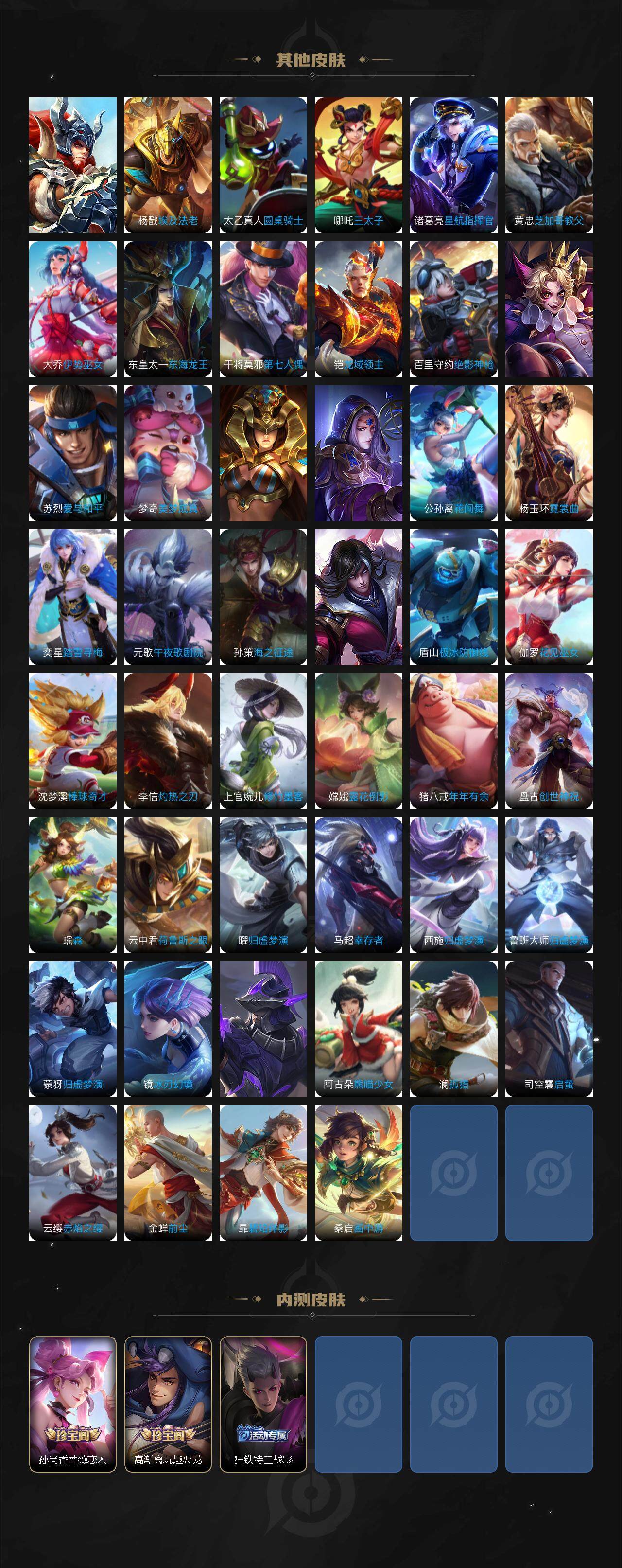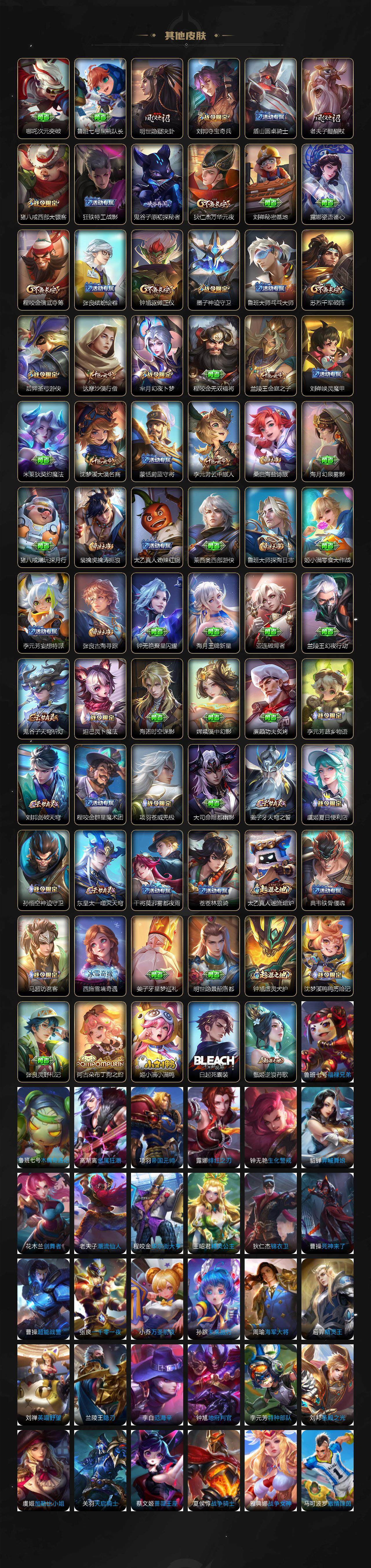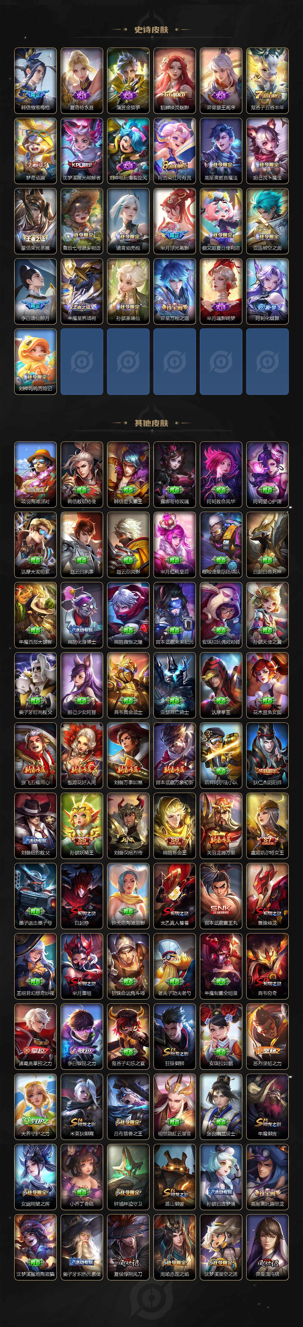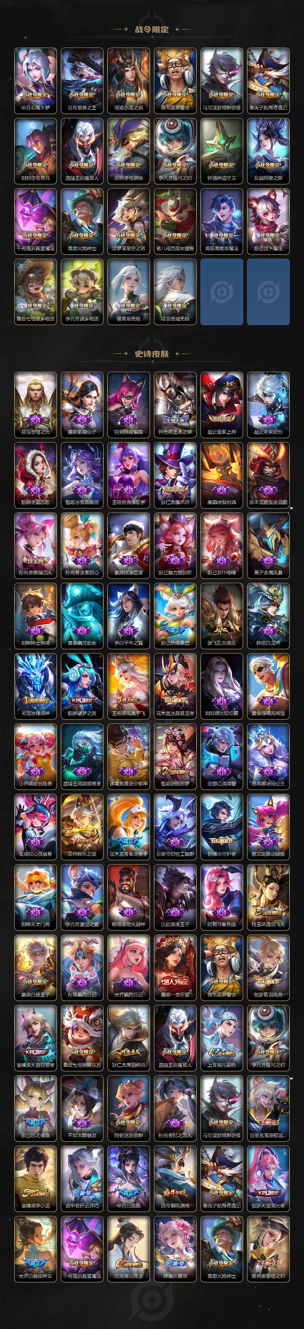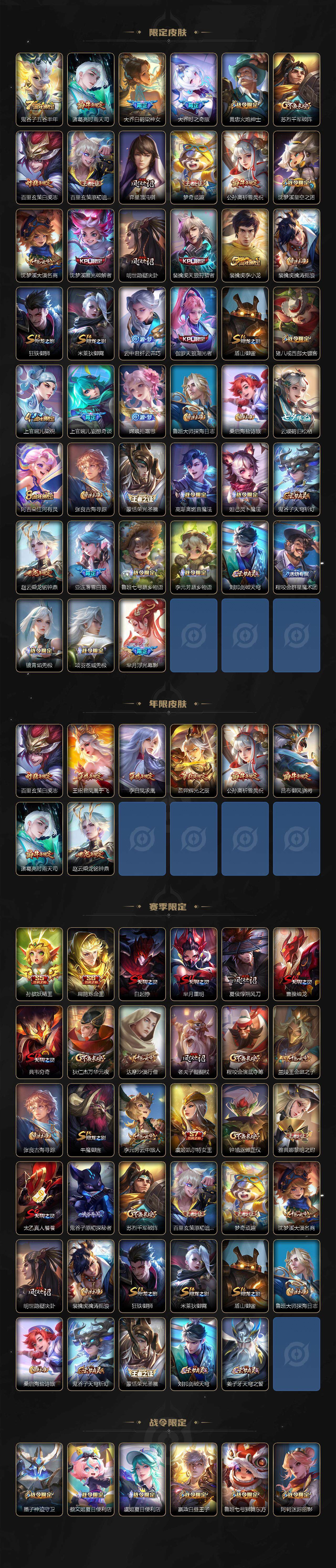 【限定皮肤】:白起狰,蔡文姬夏日便利店,虞姬夏日便利店,姜子牙天穹之誓,李白谪仙醉月,狄仁杰阴阳师,虞姬凯尔特女王,赵云皇家上将,墨子神迹守卫,妲己热情桑巴,妲己时之彼端,嬴政白昼王子,孙尚香蔷薇恋人,孙尚香异界灵契,鲁班七号狮舞东方,鲁班七号时之奇旅,庄周高山流水,高渐离玩趣恶龙,阿轲迷踪丽影,钟无艳王者之锤,孙膑妖精王,扁鹊炼金王,芈月重明,芈月白晶晶,芈月幻夜卜梦,吕布猎兽之王,吕布御风骁将,周瑜赤莲之焰,夏侯惇朔风刀,甄姬游园惊梦,曹操烛龙,典韦穷奇,典韦蓝屏警告,马可波罗暗影游猎,狄仁杰魔术师,狄仁杰万华元夜,达摩沙漠行僧,项羽海滩派对,老夫子醍醐杖,老夫子航海奇遇记,关羽冰锋战神,貂蝉逐梦之音,程咬金演武夺筹,露娜一生所爱,露娜启示之音,刘邦夺宝奇兵,韩信傲雪梅枪,王昭君凤凰于飞,兰陵王驯魔猎人,兰陵王金庭之子,花木兰青春决赛季,橘右京枫霜尽,牛魔御旌,后羿辉光之辰,后羿圣弓游侠,李元芳银河之约,李元芳云中旅人,虞姬启明星使,钟馗神迹守卫,钟馗驱傩正仪,杨玉环遇见飞天,女娲朔望之晖,干将莫邪真爱魔法,雅典娜黎明之约,太乙真人饕餮,鬼谷子原初探秘者,鬼谷子五谷丰年,诸葛亮时雨天司,大乔白鹤梁神女,大乔时之奇旅,黄忠火炮绅士,苏烈千军破阵,百里玄策白虎志,百里玄策原初追逐者,弈星混沌棋,梦奇顽趣,公孙离祈雪灵祝,沈梦溪星空之诺,沈梦溪大漠名商,沈梦溪匿光破解者,明世隐疑决卦,裴擒虎天狼狩猎者,裴擒虎李小龙,裴擒虎擒涛扼浪,狂铁御狮,米莱狄御霄,云中君纤云弄巧,伽罗天狼溯光者,盾山御銮,猪八戒西部大镖客,上官婉儿梁祝,上官婉儿妄想奇谈,嫦娥拒霜思,鲁班大师探海日志,桑启