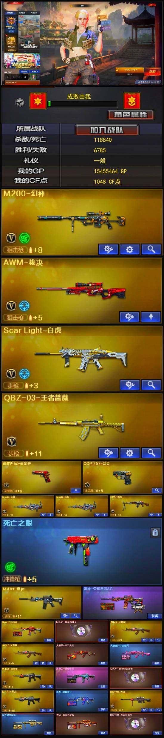 【热门武器】:Scar Light-白虎,M200-幻神,死亡之眼,荣耀世冠-柯尔特,金色小号,M4A1-黑骑士,RPK-盘龙,加特林-炼狱*2,羊驼玩偶,COP 357-幻灵,沙鹰-修罗*3,荣耀世冠-龙啸