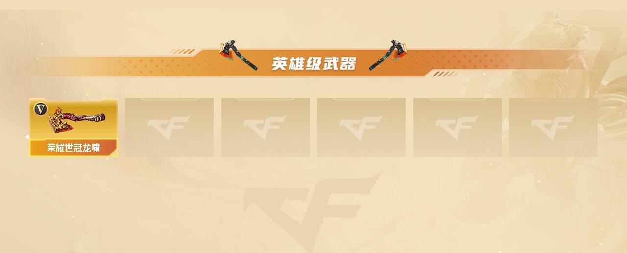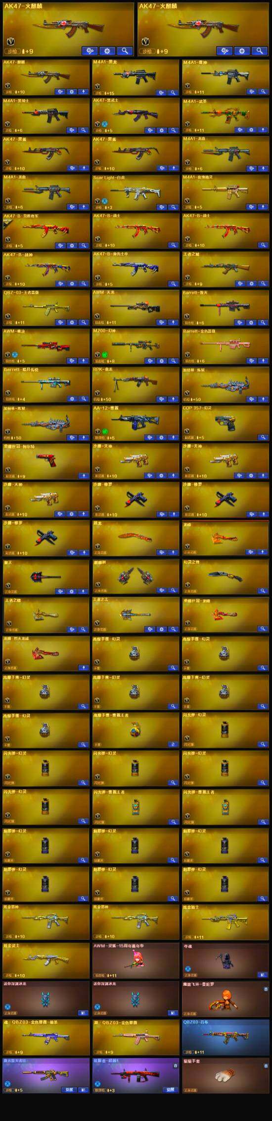 【英雄级武器】:AK47-火麒麟*2,AK47-麒麟,M4A1-黑龙,M4A1-雷神,M4A1-黑骑士,AK47-黑武士,M4A1-武圣,AK47-黑鲨*2,M4A1-龙血*2,Scar Light-白虎,M4A1-玫瑰精灵,AK-47-猩红传说*2,AK47-B-战神,AK47-B-常胜将军,AWM-天龙,Barrett-毁灭,AWM-裁决,M200-幻神,RPK-盘龙,加特林-炼狱*2,AA-12-雷霆,沙鹰-修罗*3,沙鹰-天神*3,COP 357-幻灵,荣耀世冠-柯尔特,屠龙,龙啸,擎天,麒麟刺,幻灵之锋,荣耀世冠-龙啸