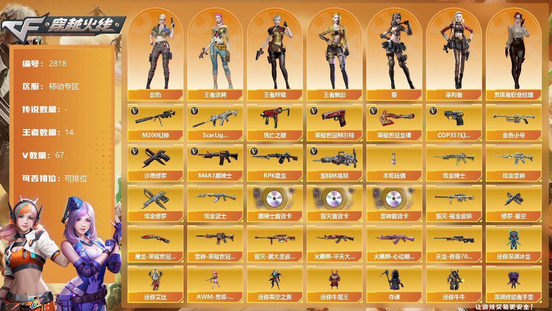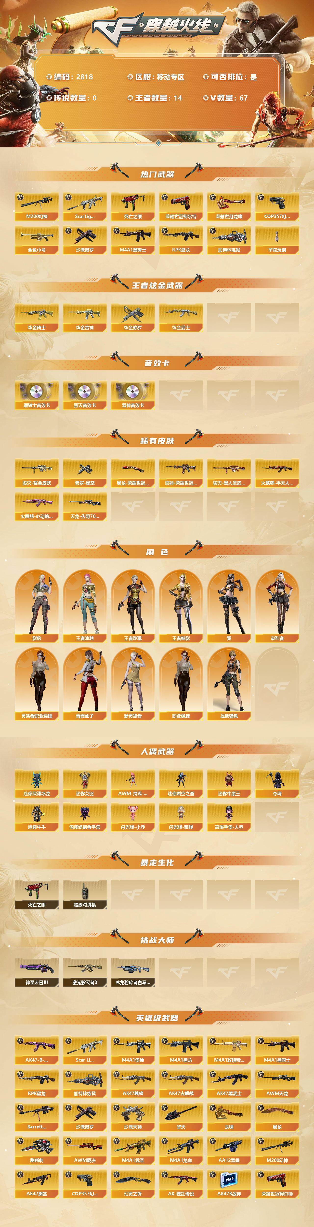 [12936063]移动专区-67V-14王者-5炫金 【热门武器】:Scar Light-白虎,M200-幻神,死亡之眼,荣耀世冠-柯尔特,金色小号,M4A1-黑骑士,RPK-盘龙,加特林-炼狱*2,羊驼玩偶,COP 357-幻灵,沙鹰-修罗*3,荣耀世冠-龙啸 【王者炫金武器】:炫金骑士,炫金雷神*2,炫金修罗,炫金武士 【音效卡】:M4A1-雷神音效卡,M4A1-黑骑士音效卡,Barrett-毁灭音效卡 【稀有皮肤】:雷神-荣耀世冠AG,火麒麟-平天大圣,火麒麟-心动糖果,毁灭耀金皮肤,毁灭-黑大圣皮肤,AWM-天龙-传奇70KG,修罗-星空,屠龙-荣耀世冠AG 【角色】:审判者,葵,影豹,战地猎狐,王者涂鸦,王者玲珑,王者-魅影,灵狐者-职业经理*2,新灵狐者,青霞仙子 【人偶武器】:AWM-灵狐-15周年嘉年华,迷你深渊冰龙*2,迷你艾比,迷你裂空之翼,迷你牛魔王,夺魂,迷你牛牛*2,深渊终结者手雷*2,闪光弹-小乔,闪光弹-貂蝉,高爆手雷-大乔 【暴走生化】:死亡之眼,超级对讲机 【挑战大师】:神圣爆裂者-末日III*2,激光毁灭者III,冰龙粉碎者-白马银枪 【英雄级武器】:AK47-火麒麟*2,AK47-麒麟,M4A1-黑龙,M4A1-雷神,M4A1-黑骑士,AK47-黑武士,M4A1-武圣,AK47-黑鲨*2,M4A1-龙血*2,Scar Light-白虎,M4A1-玫瑰精灵,AK-47-猩红传说*2,AK47-B-战神,AK47-B-常胜将军,AWM-天龙,Barrett-毁灭,AWM-裁决,M200-幻神,RPK-盘龙,加特林-炼狱*2,AA-12-雷霆,沙鹰-修罗*3,沙鹰-天神*3,COP 357-幻灵,荣耀世冠-柯尔特,屠龙,龙啸,擎天,麒麟刺,幻灵之锋,荣耀世冠-龙啸 【特殊枪械】:1白虎,1黑骑士,1盘龙,2炼狱