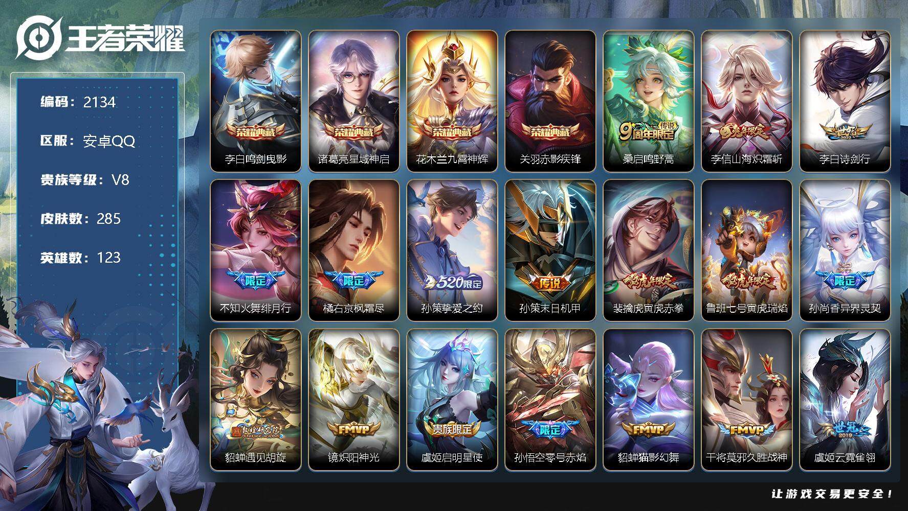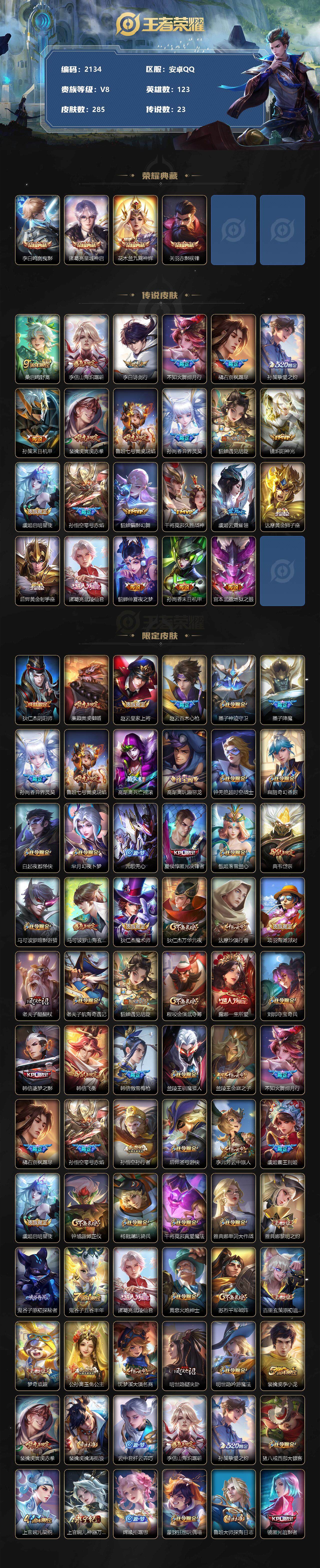 [12936264]安卓Q-V7-永恒钻石V段位-123英雄-285皮肤-4典藏-0珍品无双-0无双-0珍品传说-23传说-78史诗