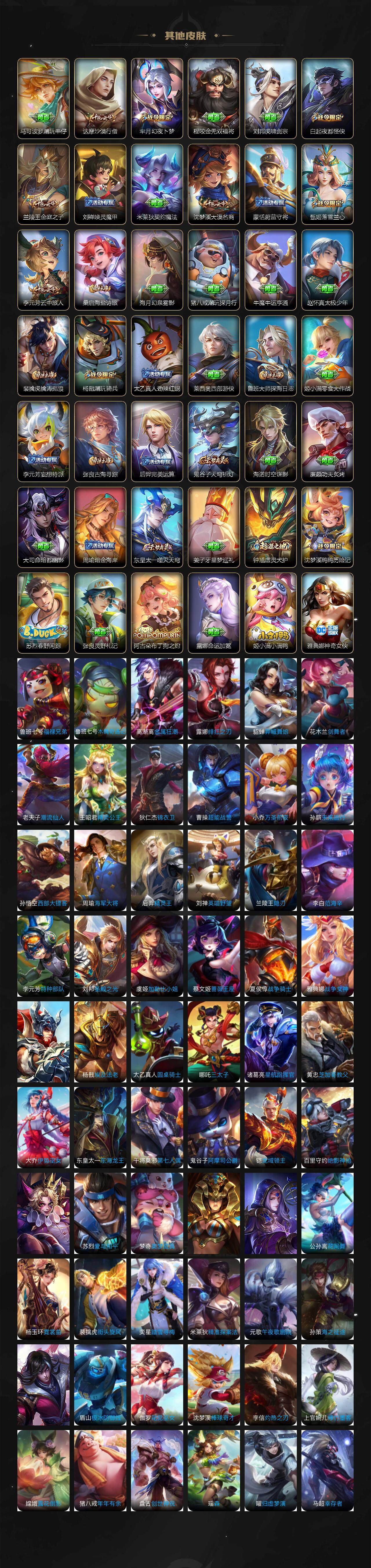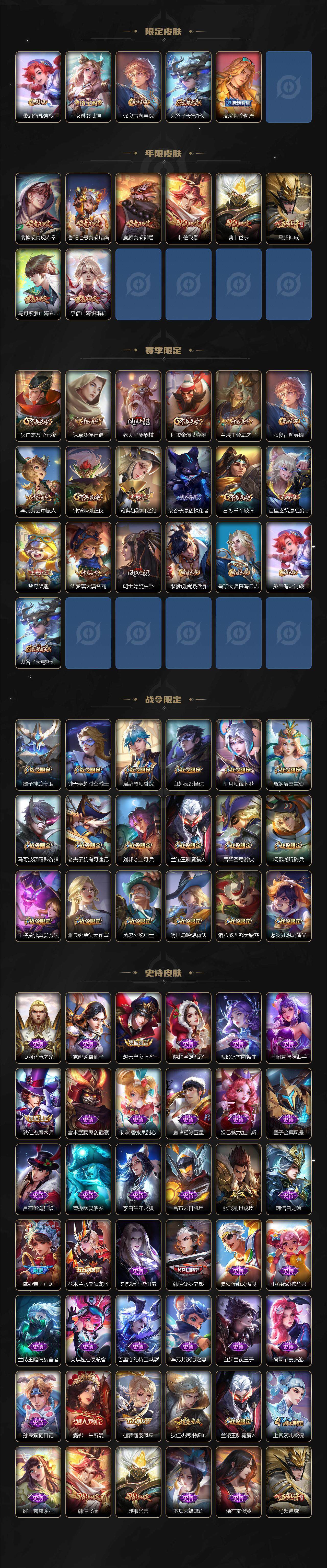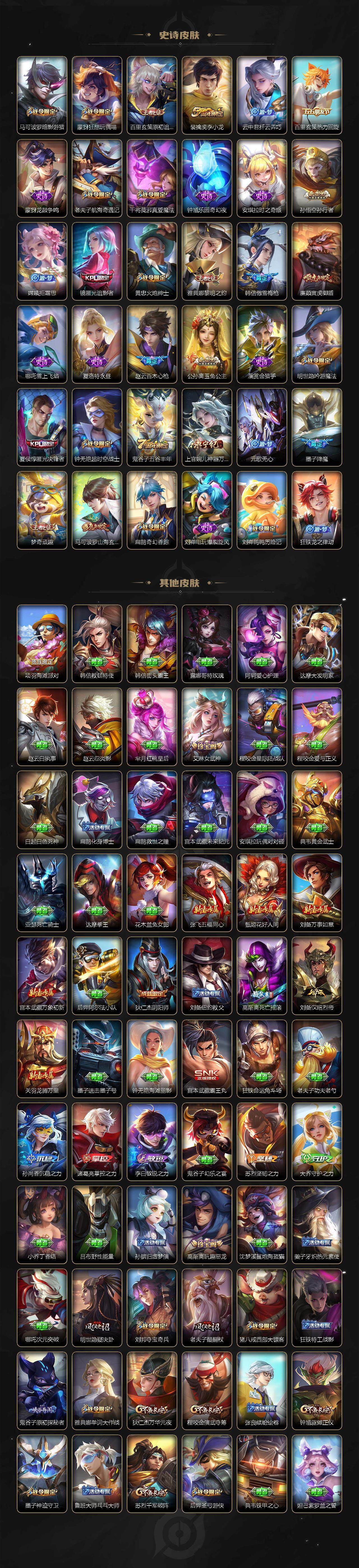 【限定皮肤】:狄仁杰阴阳师,廉颇寅虎御盾,赵云皇家上将,赵云百木心枪,墨子神迹守卫,墨子降魔,孙尚香异界灵契,鲁班七号寅虎瑞焰,高渐离死亡摇滚,高渐离玩趣恶龙,钟无艳超时空战士,扁鹊奇幻香踪,白起夜都怪侠,芈月幻夜卜梦,元歌无心,夏侯惇匿光决锋者,甄姬落雪兰心,典韦岱宗,马可波罗暗影游猎,马可波罗山海玄木吟,狄仁杰魔术师,狄仁杰万华元夜,达摩沙漠行僧,项羽海滩派对,老夫子醍醐杖,老夫子航海奇遇记,貂蝉遇见胡旋,程咬金演武夺筹,露娜一生所爱,刘邦夺宝奇兵,韩信逐梦之影,韩信飞衡,韩信傲雪梅枪,兰陵王驯魔猎人,兰陵王金庭之子,不知火舞绯月行,橘右京枫霜尽,孙悟空零号赤焰,孙悟空孙行者,后羿圣弓游侠,李元芳云中旅人,虞姬霸王别姬,虞姬启明星使,钟馗驱傩正仪,杨戬潮玩骑兵,干将莫邪真爱魔法,雅典娜单词大作战,雅典娜黎明之约,鬼谷子原初探秘者,鬼谷子五谷丰年,诸葛亮武陵仙君,黄忠火炮绅士,苏烈千军破阵,百里玄策原初追逐者,梦奇顽趣,公孙离玉兔公主,沈梦溪大漠名商,明世隐疑决卦,明世隐吟游魔法,裴擒虎李小龙,裴擒虎寅虎赤拳,裴擒虎擒涛扼浪,云中君纤云弄巧,李信山海炽霜斩,孙策挚爱之约,猪八戒西部大镖客,上官婉儿梁祝,上官婉儿神器万象笔,嫦娥拒霜思,蒙犽狂想玩偶喵,鲁班大师探海日志,镜匿光追影者,桑启海盐诗旅,艾琳女武神,张良古海寻踪,鬼谷子天穹祈灯,周瑜熔金海岸