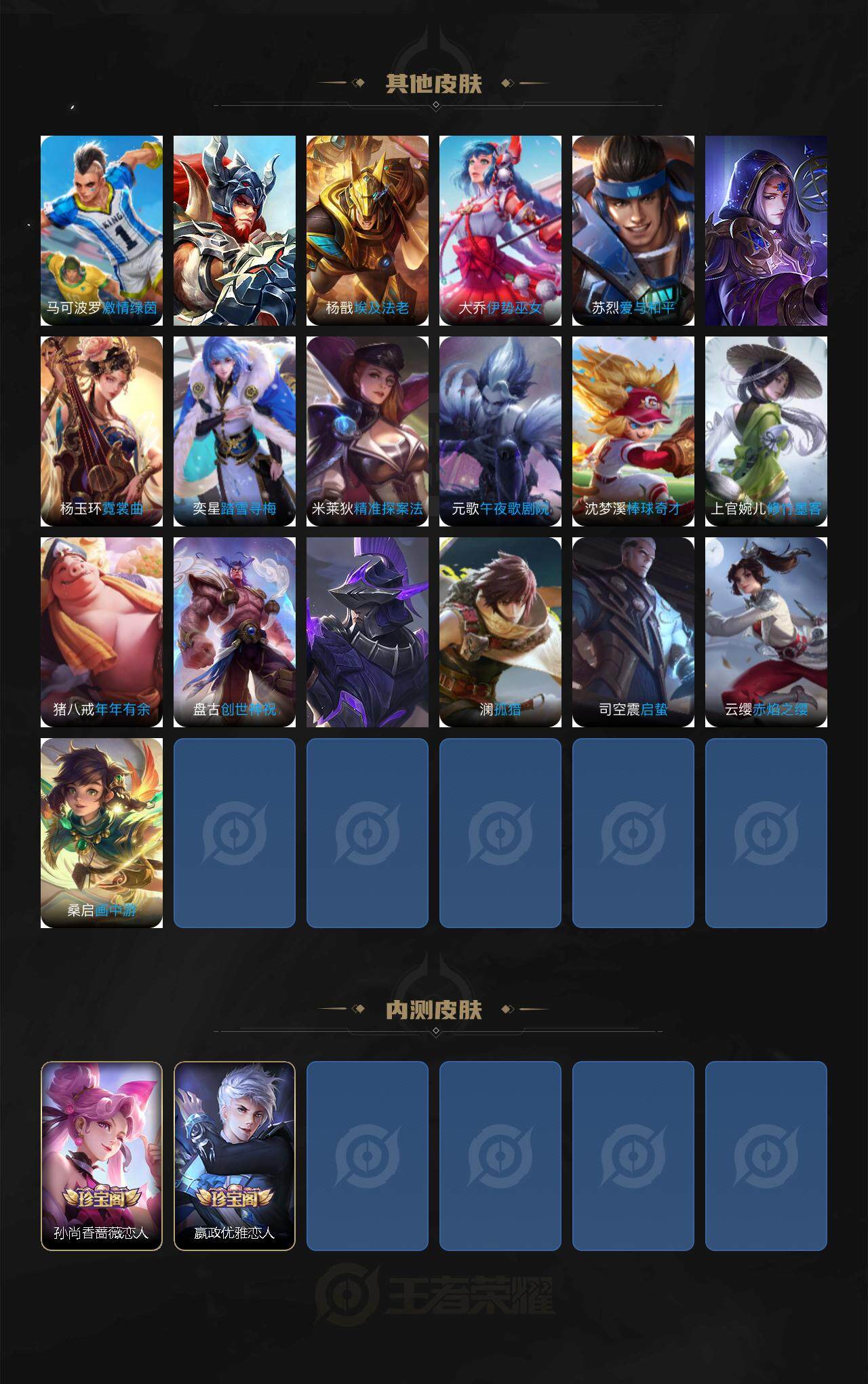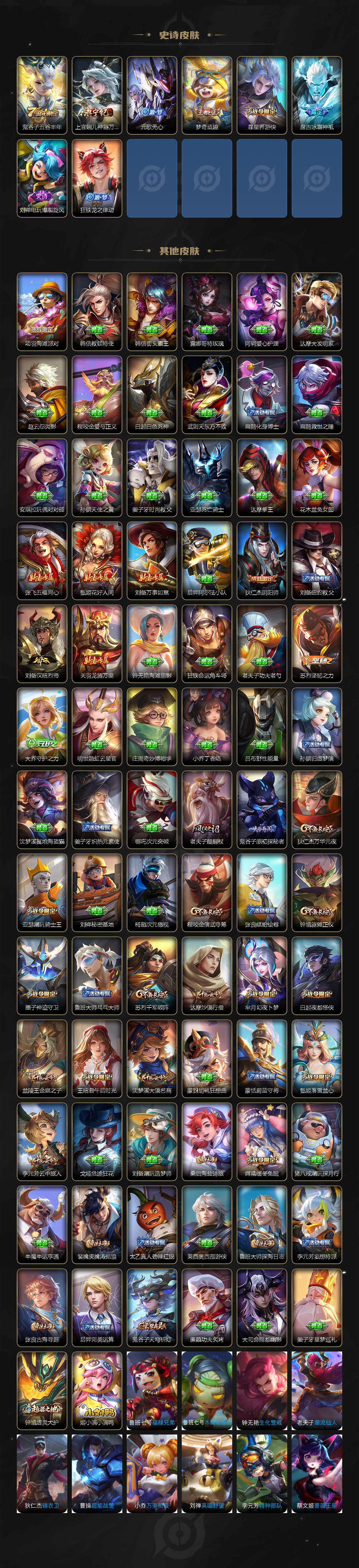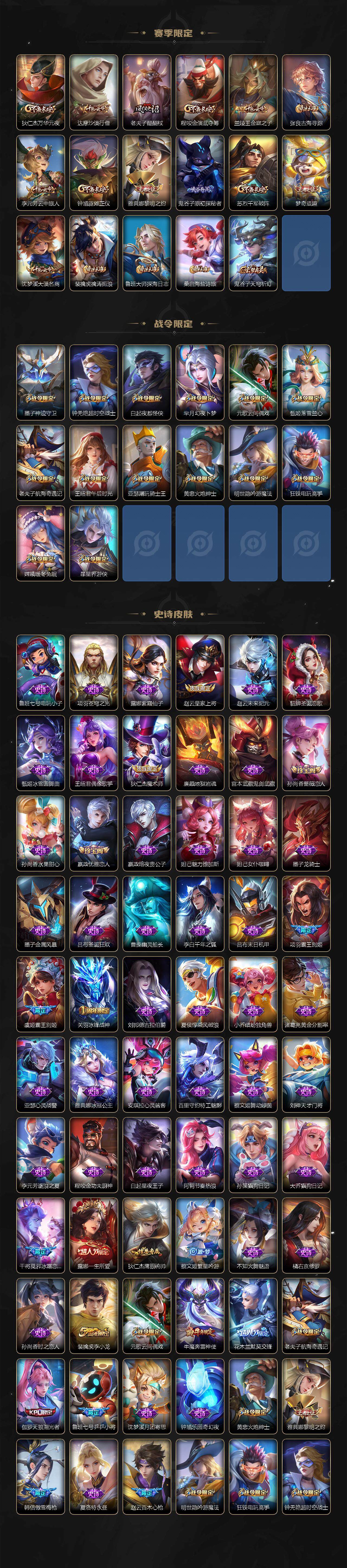 【限定皮肤】:狄仁杰阴阳师,赵云皇家上将,赵云百木心枪,墨子神迹守卫,嬴政优雅恋人,孙尚香蔷薇恋人,鲁班七号乒乒小将,钟无艳超时空战士,白起夜都怪侠,芈月幻夜卜梦,元歌云间偶戏,元歌无心,甄姬落雪兰心,马可波罗深海之息,狄仁杰魔术师,狄仁杰万华元夜,达摩沙漠行僧,项羽海滩派对,项羽霸王别姬,老夫子醍醐杖,老夫子航海奇遇记,关羽冰锋战神,程咬金演武夺筹,露娜一生所爱,韩信傲雪梅枪,王昭君午后时光,兰陵王默契交锋,兰陵王金庭之子,花木兰默契交锋,橘右京枫霜尽,亚瑟潮玩骑士王,孙悟空零号赤焰,孙悟空齐天大圣,牛魔奔雷神使,李元芳云中旅人,虞姬霸王别姬,虞姬启明星使,钟馗驱傩正仪,女娲补天,干将莫邪冰霜恋舞曲,雅典娜黎明之约,蔡文姬繁星吟游,鬼谷子原初探秘者,鬼谷子五谷丰年,诸葛亮时雨天司,黄忠火炮绅士,苏烈千军破阵,百里玄策白虎志,梦奇顽趣,沈梦溪大漠名商,明世隐吟游魔法,裴擒虎李小龙,裴擒虎擒涛扼浪,狂铁电玩高手,李信山海炽霜斩,伽罗天狼溯光者,上官婉儿神器万象笔,嫦娥暖冬兔眠,鲁班大师探海日志,盘古冰霜神祇,桑启海盐诗旅,暃星界游侠,张良古海寻踪,鬼谷子天穹祈灯