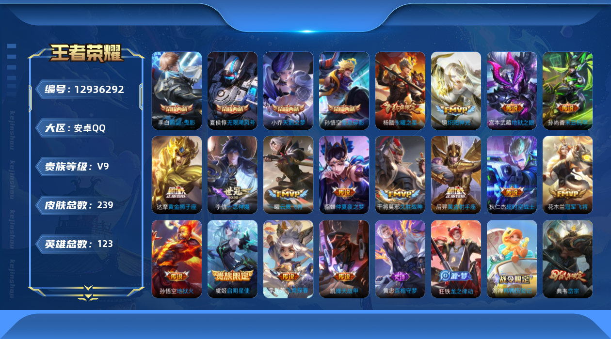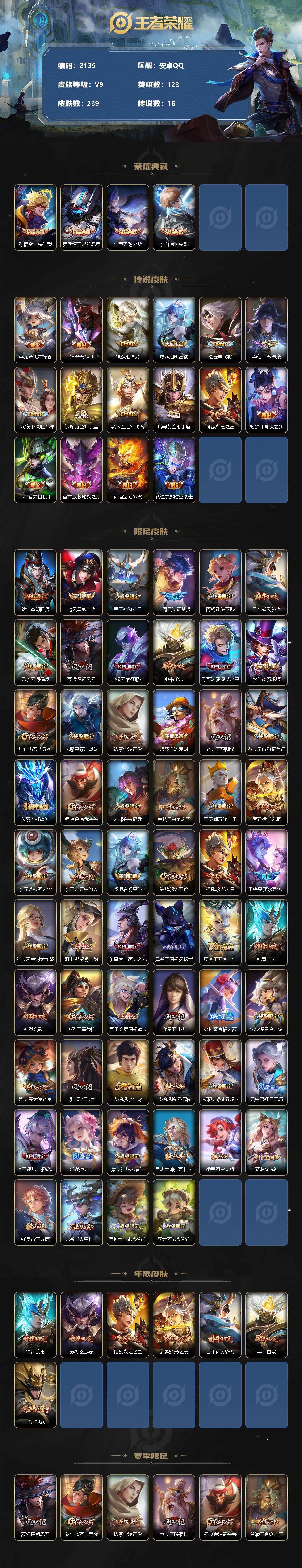 [12936292]安卓Q-V9-至尊星耀IV段位-123英雄-239皮肤-4典藏-0珍品无双-0无双-0珍品传说-16传说-68史诗
