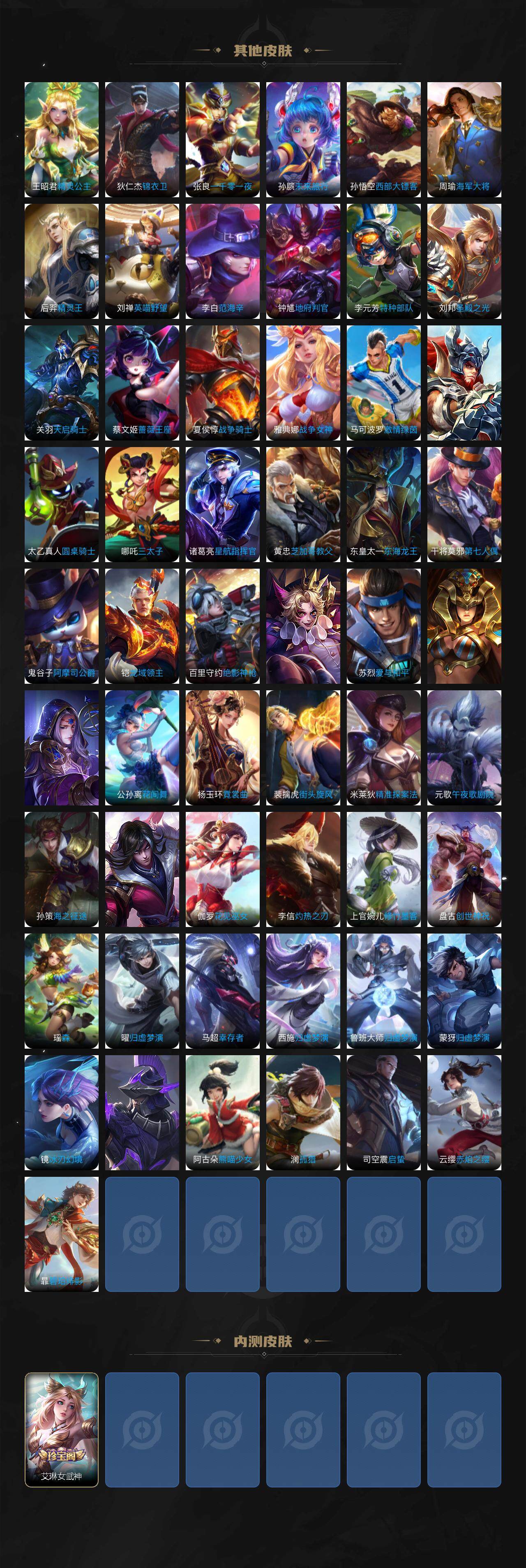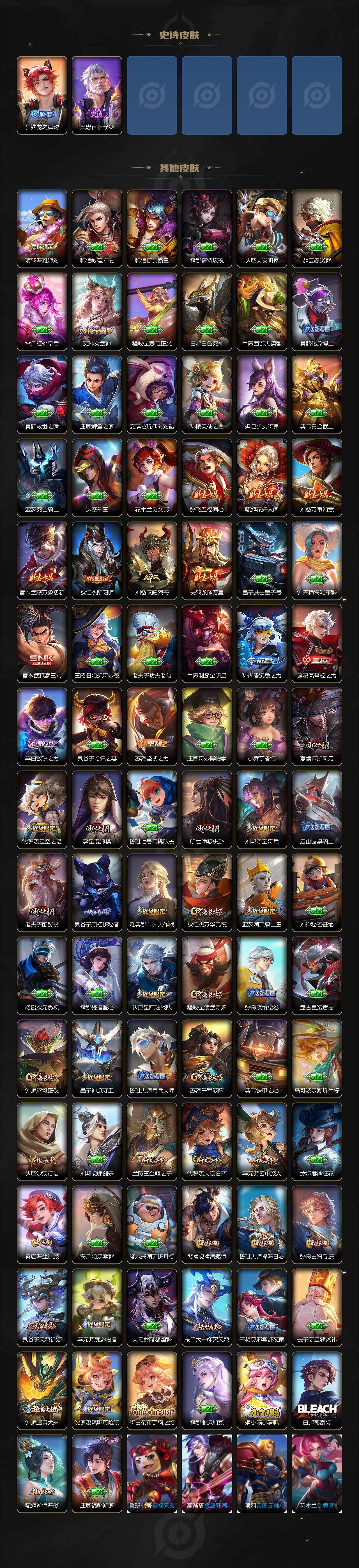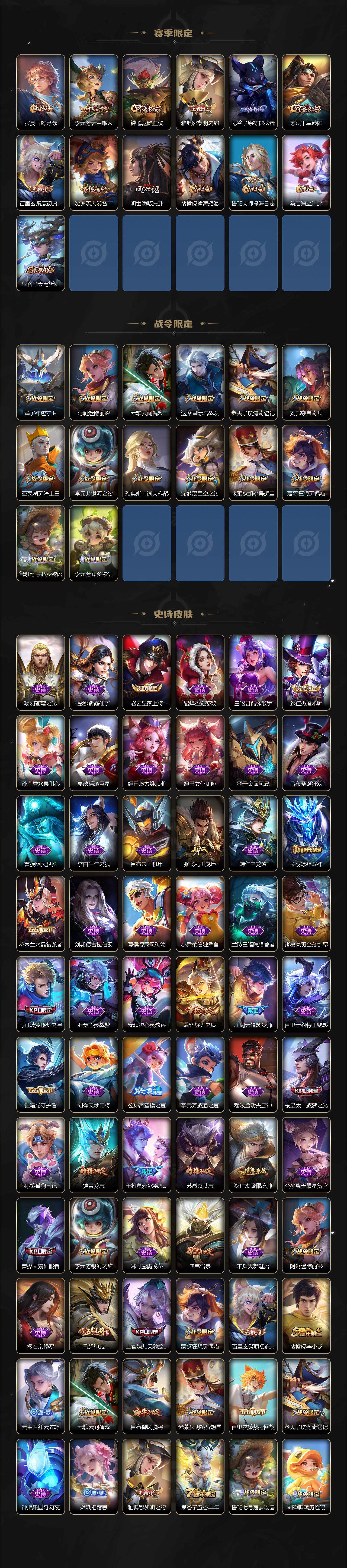 【限定皮肤】:狄仁杰阴阳师,赵云皇家上将,墨子神迹守卫,庄周云端筑梦师,阿轲迷踪丽影,吕布御风骁将,元歌云间偶戏,夏侯惇朔风刀,曹操天狼征服者,典韦岱宗,马可波罗逐梦之星,狄仁杰魔术师,狄仁杰万华元夜,达摩星际陆战队,达摩沙漠行僧,项羽海滩派对,老夫子醍醐杖,老夫子航海奇遇记,关羽冰锋战神,程咬金演武夺筹,刘邦夺宝奇兵,兰陵王金庭之子,亚瑟潮玩骑士王,后羿辉光之辰,李元芳银河之约,李元芳云中旅人,虞姬启明星使,钟馗驱傩正仪,杨戬永曜之星,干将莫邪冰霜恋舞曲,雅典娜单词大作战,雅典娜黎明之约,东皇太一逐梦之光,鬼谷子原初探秘者,鬼谷子五谷丰年,铠青龙志,苏烈玄武志,苏烈千军破阵,百里玄策原初追逐者,弈星混沌棋,公孙离蜜橘之夏,沈梦溪星空之诺,沈梦溪大漠名商,明世隐疑决卦,裴擒虎李小龙,裴擒虎擒涛扼浪,米莱狄胡桃异想国,云中君纤云弄巧,上官婉儿天狼绘梦者,嫦娥拒霜思,蒙犽狂想玩偶喵,鲁班大师探海日志,桑启海盐诗旅,艾琳女武神,张良古海寻踪,鬼谷子天穹祈灯,鲁班七号蔬乡物语,李元芳蔬乡物语