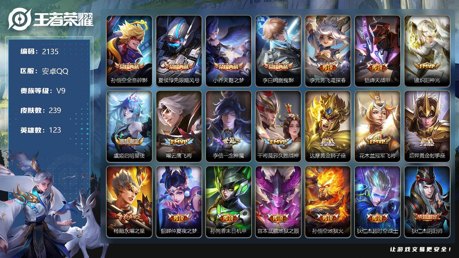 [12936292]安卓Q-V9-至尊星耀IV段位-123英雄-239皮肤-4典藏-0珍品无双-0无双-0珍品传说-16传说-68史诗 【荣耀典藏】:孙悟空全息碎影,夏侯惇无限飓风号,小乔天鹅之梦,李白鸣剑曳影 【传说皮肤】:李元芳飞鸢探春,铠绛天战甲,镜炽阳神光,虞姬启明星使,曜云鹰飞将,李信一念神魔,干将莫邪久胜战神,达摩黄金狮子座,花木兰冠军飞将,后羿黄金射手座,杨戬永曜之星,貂蝉仲夏夜之梦,孙尚香末日机甲,宫本武藏地狱之眼,孙悟空地狱火,狄仁杰超时空战士 【限定皮肤】:狄仁杰阴阳师,赵云皇家上将,墨子神迹守卫,庄周云端筑梦师,阿轲迷踪丽影,吕布御风骁将,元歌云间偶戏,夏侯惇朔风刀,曹操天狼征服者,典韦岱宗,马可波罗逐梦之星,狄仁杰魔术师,狄仁杰万华元夜,达摩星际陆战队,达摩沙漠行僧,项羽海滩派对,老夫子醍醐杖,老夫子航海奇遇记,关羽冰锋战神,程咬金演武夺筹,刘邦夺宝奇兵,兰陵王金庭之子,亚瑟潮玩骑士王,后羿辉光之辰,李元芳银河之约,李元芳云中旅人,虞姬启明星使,钟馗驱傩正仪,杨戬永曜之星,干将莫邪冰霜恋舞曲,雅典娜单词大作战,雅典娜黎明之约,东皇太一逐梦之光,鬼谷子原初探秘者,鬼谷子五谷丰年,铠青龙志,苏烈玄武志,苏烈千军破阵,百里玄策原初追逐者,弈星混沌棋,公孙离蜜橘之夏,沈梦溪星空之诺,沈梦溪大漠名商,明世隐疑决卦,裴擒虎李小龙,裴擒虎擒涛扼浪,米莱狄胡桃异想国,云中君纤云弄巧,上官婉儿天狼绘梦者,嫦娥拒霜思,蒙犽狂想玩偶喵,鲁班大师探海日志,桑启海盐诗旅,艾琳女武神,张良古海寻踪,鬼谷子天穹祈灯,鲁班七号蔬乡物语,李元芳蔬乡物语 【年限皮肤】:铠青龙志,苏烈玄武志,杨戬永曜之星,后羿辉光之辰,吕布御风骁将,典韦岱宗,马超神威 【赛季限定】:夏侯惇朔风刀,狄仁杰万华元夜,达摩沙漠行僧,老夫子醍醐杖,程咬金演武夺筹,兰陵王金庭之子,张良古海寻踪,李元芳云中旅人,钟馗驱傩正仪,雅典娜黎明之约,鬼谷子原初探秘者,苏烈千军破阵,百里玄策原初追逐者,弈星混沌棋,沈梦溪大漠名商,明世隐疑决卦,裴擒虎擒涛扼浪,鲁班大师探海日志,桑启海盐诗旅,鬼谷子天穹祈灯 【战令限定】:墨子神迹守卫,阿轲迷踪丽影,元歌云间偶戏,达摩星际陆战队,老夫子航海奇遇记,刘邦夺宝奇兵,亚瑟潮玩骑士王,李元芳银河之约,雅典娜单词大作战,沈梦溪星空之诺,米莱狄胡桃异想国,蒙犽狂想玩偶喵,鲁班七号蔬乡物语,李元芳蔬乡