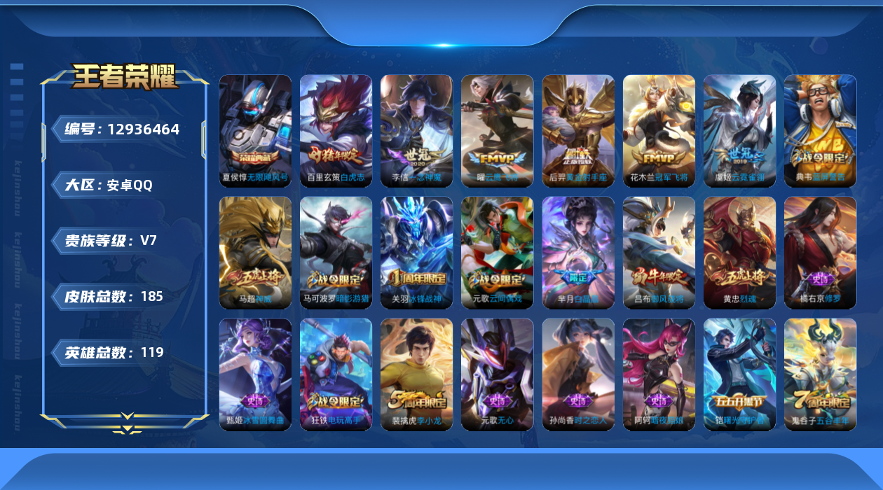- [12313840]V7 1典藏 6传说 122英雄 268皮肤 可修改实名 优质装备:九霄神辉(木兰典藏),冠军飞将,地狱火,地狱之眼,超时空战士-狄仁杰 珍宝阁皮:蔷薇恋人,女武神 限定皮:鸣野蒿,白虎志(电光耗子),遇见飞天,高山流水,青龙志(铠年限),游园惊梦,梁祝,逐梦之星,李小龙,逐梦之影,圣诞老人,默契交锋-花木兰,猪悟能,大圣娶亲,引擎之心 史诗皮:星界战将,蒙犽顽岩魄,百相守梦-黄忠,苍穹之光,电玩小子(小书包),黄金分割率,特工魅影,千年之狐,蒙恬荣光圣徽,冰冠公主,暗夜猫娘,猫狗日记-孙策,乱世虎臣,女仆咖啡,摇滚巨星,水果甜心,星夜王子,心灵骇客,功夫厨神,德古拉伯爵,暗隐猎兽者,幽灵船长,鬼剑武藏,心灵战警,舞动绿茵,地狱岩魂,乘风破浪,逐浪之夏,水晶猎龙者,曙光守护者,金属风暴,原初追逐者,圣诞狂欢,圣诞恋歌,鹰眼统帅,王者之锤,黎明之约,未来纪元-赵云