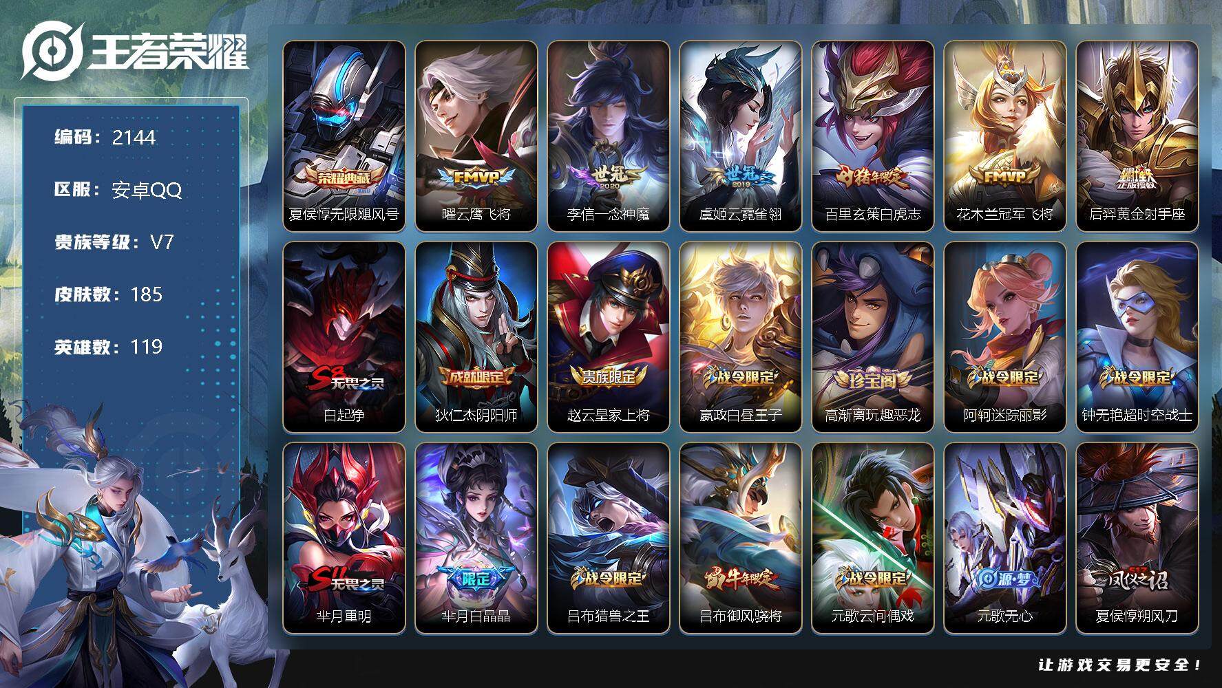 [12936464]安卓Q-V0-秩序白银III段位-119英雄-185皮肤-1典藏-0珍品无双-0无双-0珍品传说-6传说-45史诗 【荣耀典藏】:夏侯惇无限飓风号 【传说皮肤】:曜云鹰飞将,李信一念神魔,虞姬云霓雀翎,百里玄策白虎志,花木兰冠军飞将,后羿黄金射手座 【限定皮肤】:白起狰,狄仁杰阴阳师,赵云皇家上将,嬴政白昼王子,高渐离玩趣恶龙,阿轲迷踪丽影,钟无艳超时空战士,芈月重明,芈月白晶晶,吕布猎兽之王,吕布御风骁将,元歌云间偶戏,元歌无心,夏侯惇朔风刀,甄姬落雪兰心,曹操烛龙,典韦穷奇,典韦蓝屏警告,马可波罗暗影游猎,狄仁杰魔术师,狄仁杰万华元夜,项羽海滩派对,老夫子醍醐杖,关羽冰锋战神,程咬金演武夺筹,刘邦夺宝奇兵,王昭君午后时光,兰陵王金庭之子,亚瑟潮玩骑士王,牛魔御旌,李元芳云中旅人,钟馗驱傩正仪,女娲朔望之晖,雅典娜单词大作战,雅典娜黎明之约,蔡文姬繁星吟游,太乙真人饕餮,鬼谷子原初探秘者,鬼谷子五谷丰年,黄忠烈魂,百里玄策白虎志,百里玄策原初追逐者,弈星混沌棋,沈梦溪大漠名商,明世隐疑决卦,裴擒虎李小龙,裴擒虎擒涛扼浪,狂铁御狮,狂铁电玩高手,米莱狄御霄,云中君纤云弄巧,盾山御銮,猪八戒西部大镖客,蒙犽狂想玩偶喵,鲁班大师探海日志,桑启海盐诗旅,张良古海寻踪,鬼谷子天穹祈灯 【年限皮肤】:百里玄策白虎志,吕布御风骁将,马超神威,黄忠烈魂 【赛季限定】:白起狰,芈月重明,夏侯惇朔风刀,曹操烛龙,典韦穷奇,狄仁杰万华元夜,老夫子醍醐杖,程咬金演武夺筹,兰陵王金庭之子,张良古海寻踪,牛魔御旌,李元芳云中旅人,钟馗驱傩正仪,雅典娜黎明之约,太乙真人饕餮,鬼谷子原初探秘者,百里玄策原初追逐者,弈星混沌棋,沈梦溪大漠名商,明世隐疑决卦,裴擒虎擒涛扼浪,狂铁御狮,米莱狄御霄,盾山御銮,鲁班大师探海日志,桑启海盐诗旅,鬼谷子天穹祈灯 【战令限定】:嬴政白昼王子,阿轲迷踪丽影,钟无艳超时空战士,吕布猎兽之王,元歌云间偶戏,甄姬落雪兰心,典韦蓝屏警告,马可波罗暗影游猎,刘邦夺宝奇兵,王昭君午后时光,亚瑟潮玩骑士王,女娲朔望之晖,雅典娜单词大作战,狂铁电玩高手,猪八戒西部大镖客,蒙犽狂想玩偶喵 【史诗皮肤】:项羽苍穹之光,阿轲暗夜猫娘,赵云皇家上将,甄姬冰雪圆舞曲,狄仁杰魔术师,宫本武藏鬼剑武藏,孙尚香水果甜心,妲己魅力维加斯,墨子金属风暴,吕布圣诞狂欢,刘禅绅士熊喵,李白千年之狐,