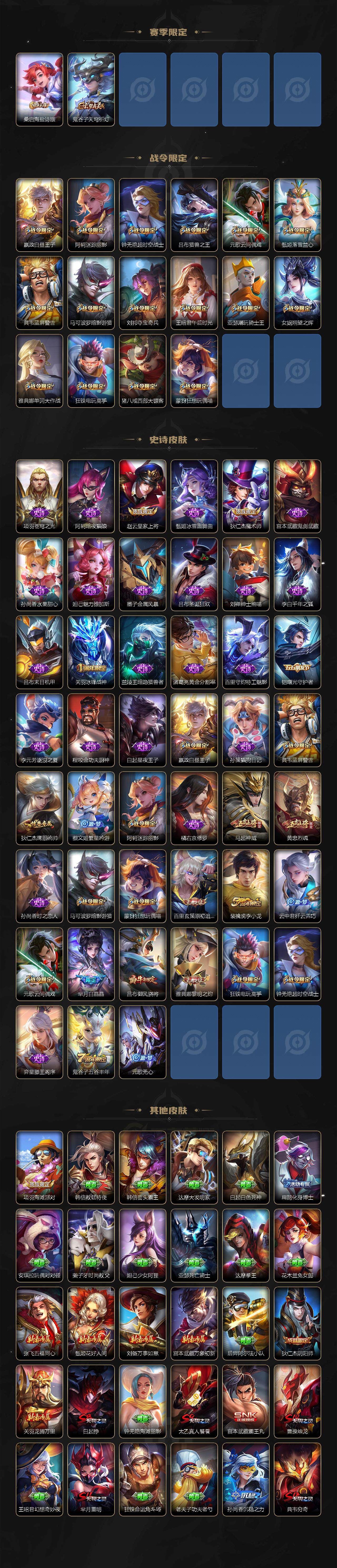 【赛季限定】:白起狰,芈月重明,夏侯惇朔风刀,曹操烛龙,典韦穷奇,狄仁杰万华元夜,老夫子醍醐杖,程咬金演武夺筹,兰陵王金庭之子,张良古海寻踪,牛魔御旌,李元芳云中旅人,钟馗驱傩正仪,雅典娜黎明之约,太乙真人饕餮,鬼谷子原初探秘者,百里玄策原初追逐者,弈星混沌棋,沈梦溪大漠名商,明世隐疑决卦,裴擒虎擒涛扼浪,狂铁御狮,米莱狄御霄,盾山御銮,鲁班大师探海日志,桑启海盐诗旅,鬼谷子天穹祈灯