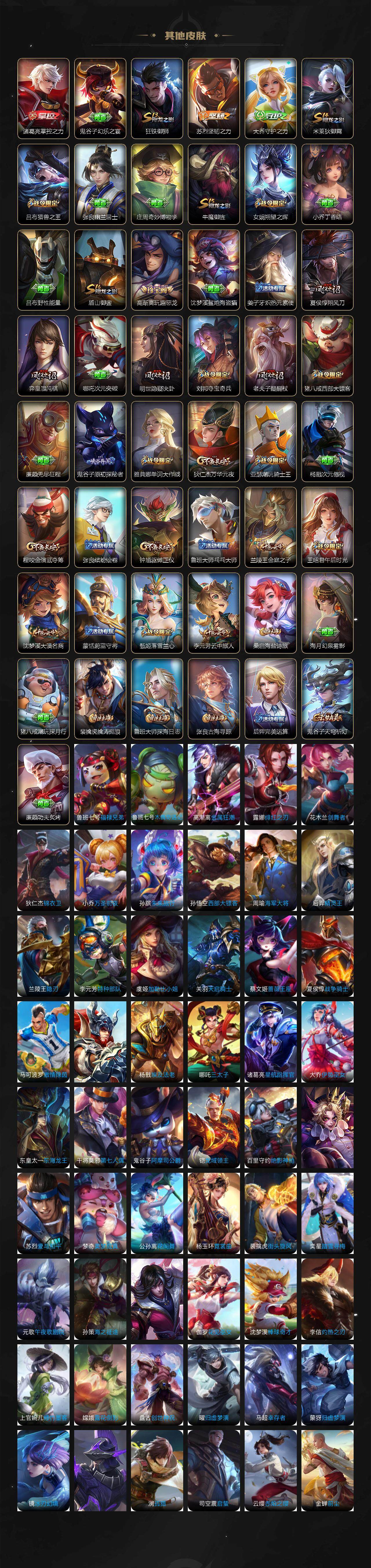 【限定皮肤】:白起狰,狄仁杰阴阳师,赵云皇家上将,嬴政白昼王子,高渐离玩趣恶龙,阿轲迷踪丽影,钟无艳超时空战士,芈月重明,芈月白晶晶,吕布猎兽之王,吕布御风骁将,元歌云间偶戏,元歌无心,夏侯惇朔风刀,甄姬落雪兰心,曹操烛龙,典韦穷奇,典韦蓝屏警告,马可波罗暗影游猎,狄仁杰魔术师,狄仁杰万华元夜,项羽海滩派对,老夫子醍醐杖,关羽冰锋战神,程咬金演武夺筹,刘邦夺宝奇兵,王昭君午后时光,兰陵王金庭之子,亚瑟潮玩骑士王,牛魔御旌,李元芳云中旅人,钟馗驱傩正仪,女娲朔望之晖,雅典娜单词大作战,雅典娜黎明之约,蔡文姬繁星吟游,太乙真人饕餮,鬼谷子原初探秘者,鬼谷子五谷丰年,黄忠烈魂,百里玄策白虎志,百里玄策原初追逐者,弈星混沌棋,沈梦溪大漠名商,明世隐疑决卦,裴擒虎李小龙,裴擒虎擒涛扼浪,狂铁御狮,狂铁电玩高手,米莱狄御霄,云中君纤云弄巧,盾山御銮,猪八戒西部大镖客,蒙犽狂想玩偶喵,鲁班大师探海日志,桑启海盐诗旅,张良古海寻踪,鬼谷子天穹祈灯