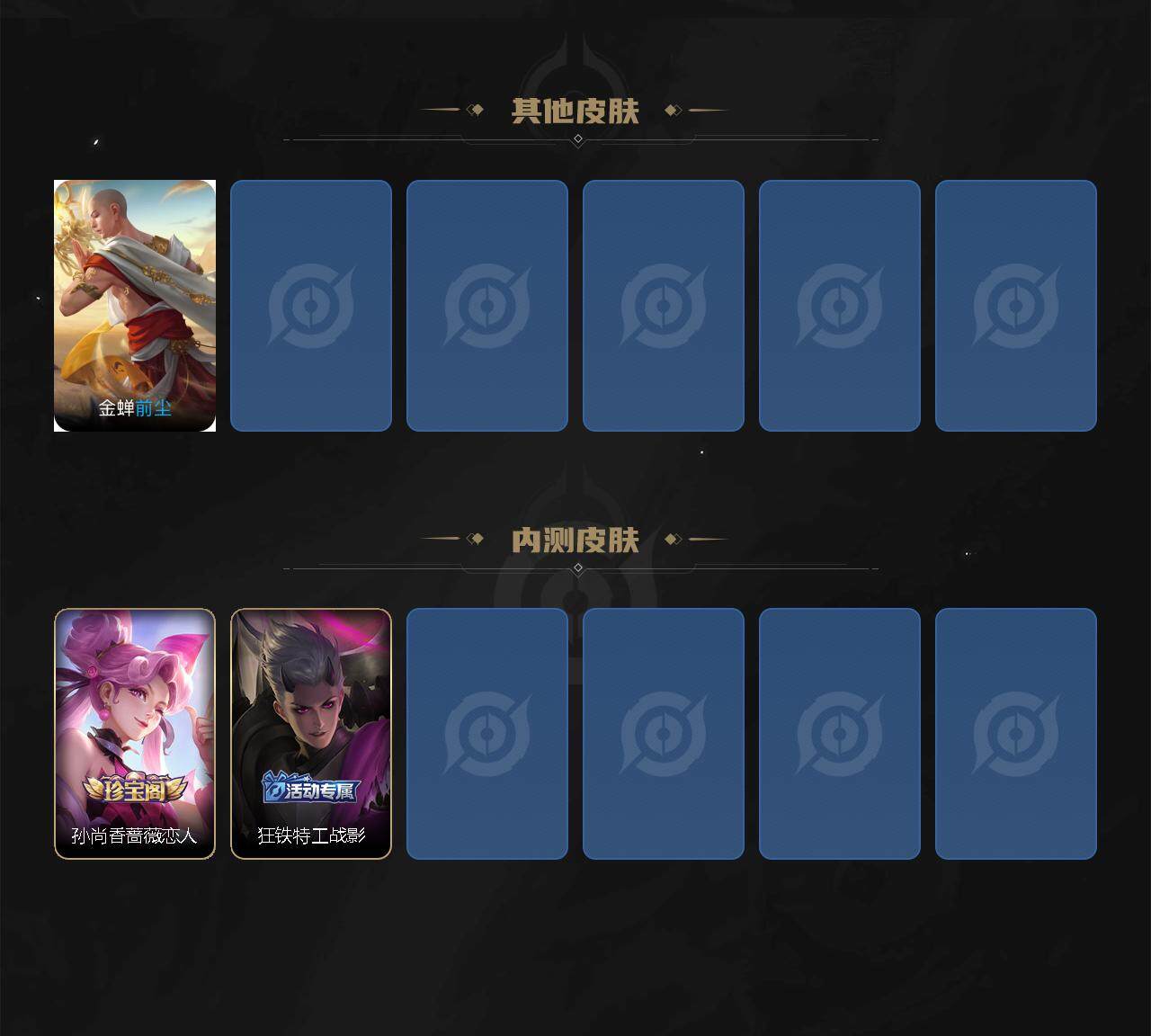 【限定皮肤】:狄仁杰阴阳师,赵云皇家上将,孙尚香蔷薇恋人,钟无艳超时空战士,甄姬游园惊梦,甄姬落雪兰心,狄仁杰魔术师,达摩沙漠行僧,项羽海滩派对,王昭君午后时光,兰陵王金庭之子,孙悟空孙行者,后羿圣弓游侠,李元芳云中旅人,钟馗驱傩正仪,干将莫邪真爱魔法,鬼谷子五谷丰年,铠青龙志,苏烈千军破阵,沈梦溪大漠名商,裴擒虎李小龙,裴擒虎擒涛扼浪,狂铁电玩高手,鲁班大师探海日志,桑启海盐诗旅,阿古朵江河有灵,张良古海寻踪,鬼谷子天穹祈灯,沈梦溪龙舞盛年,刘邦剑破天穹
