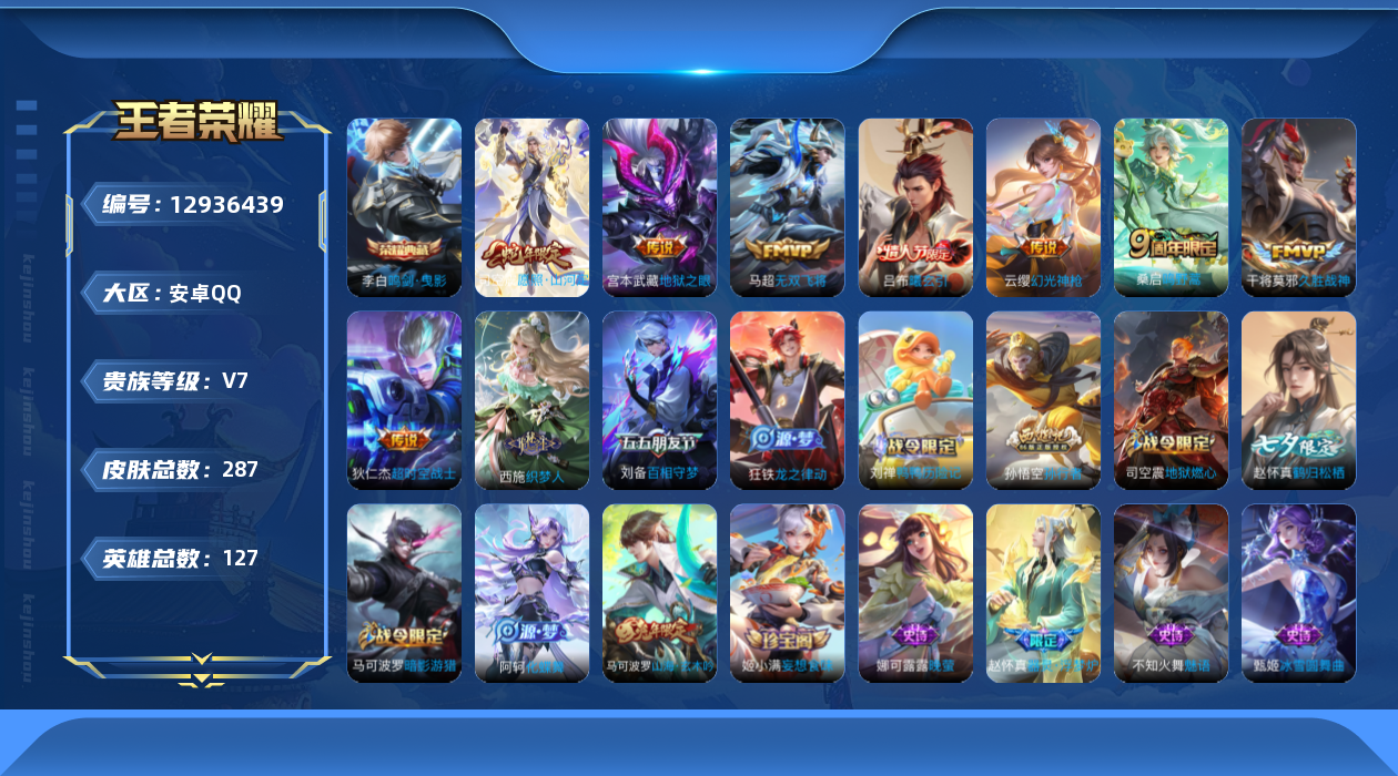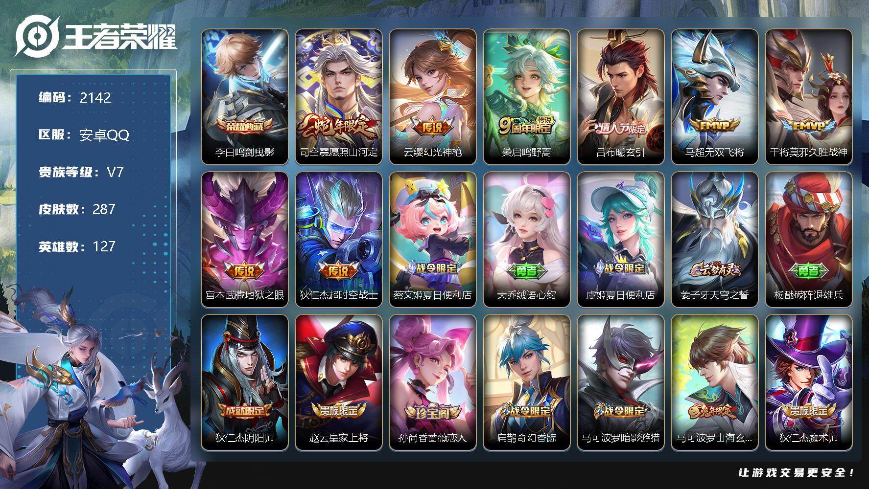 [12936439]安卓Q-V7-最强王者段位-127英雄-287皮肤-1典藏-0珍品无双-0无双-0珍品传说-8传说-71史诗