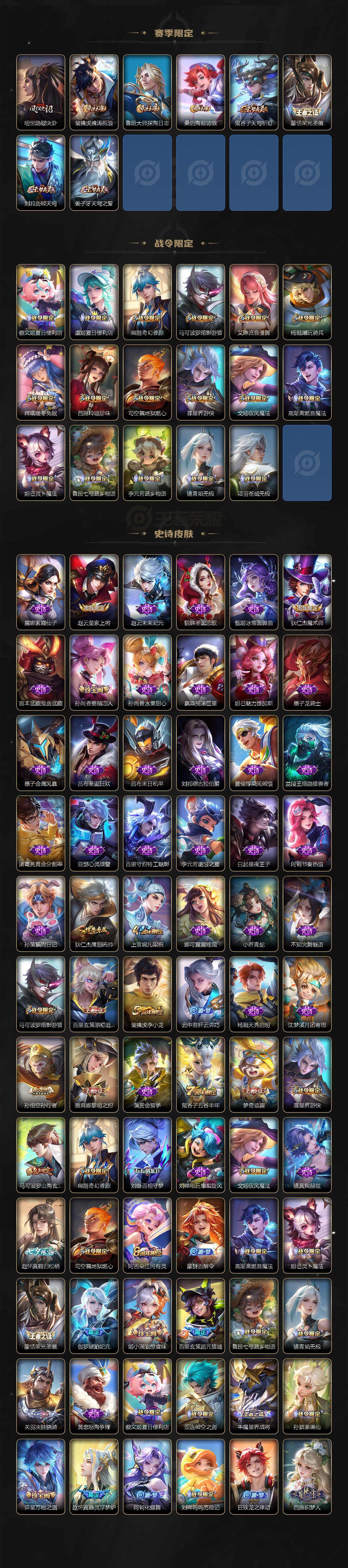 【限定皮肤】:蔡文姬夏日便利店,大乔绒语心约,虞姬夏日便利店,姜子牙天穹之誓,杨戬破阵退雄兵,狄仁杰阴阳师,赵云皇家上将,孙尚香蔷薇恋人,扁鹊奇幻香踪,马可波罗暗影游猎,马可波罗山海玄木吟,狄仁杰魔术师,达摩沙漠行僧,项羽海滩派对,老夫子醍醐杖,兰陵王金庭之子,孙悟空孙行者,刘备百相守梦,李元芳云中旅人,钟馗驱傩正仪,杨戬潮玩骑兵,雅典娜黎明之约,鬼谷子原初探秘者,鬼谷子五谷丰年,苏烈千军破阵,百里玄策原初追逐者,梦奇顽趣,沈梦溪大漠名商,明世隐疑决卦,裴擒虎李小龙,裴擒虎擒涛扼浪,云中君纤云弄巧,上官婉儿梁祝,嫦娥暖冬兔眠,西施玲珑珍味,鲁班大师探海日志,桑启海盐诗旅,暃星界游侠,戈娅驭风魔法,艾琳流音漫舞,赵怀真鹤归松栖,司空震地狱燃心,阿古朵江河有灵,张良古海寻踪,蒙犽百解令,蒙恬荣光圣徽,高渐离燃音魔法,妲己灵卜魔法,鬼谷子天穹祈灯,伽罗琥珀纪元,姬小满妄想食味,吕布曦玄引,百里玄策超元猎域,鲁班七号蔬乡物语,李元芳蔬乡物语,刘邦剑破天穹,程咬金群星魔术团,关羽决胜骁骑,镜青焰无极,项羽苍威无极,刘备异域游侠,周瑜熔金海岸