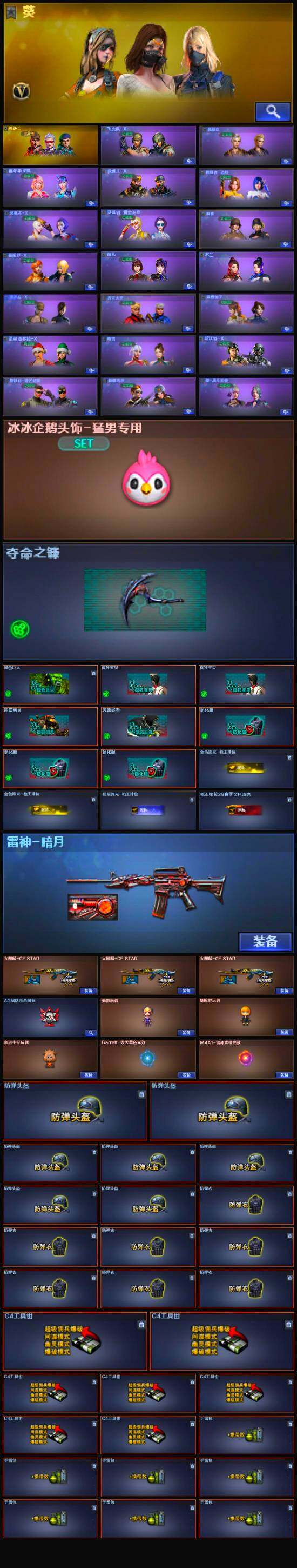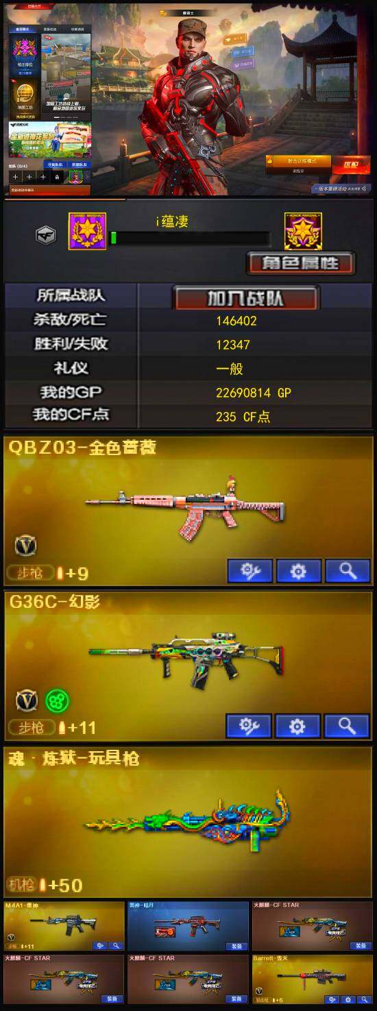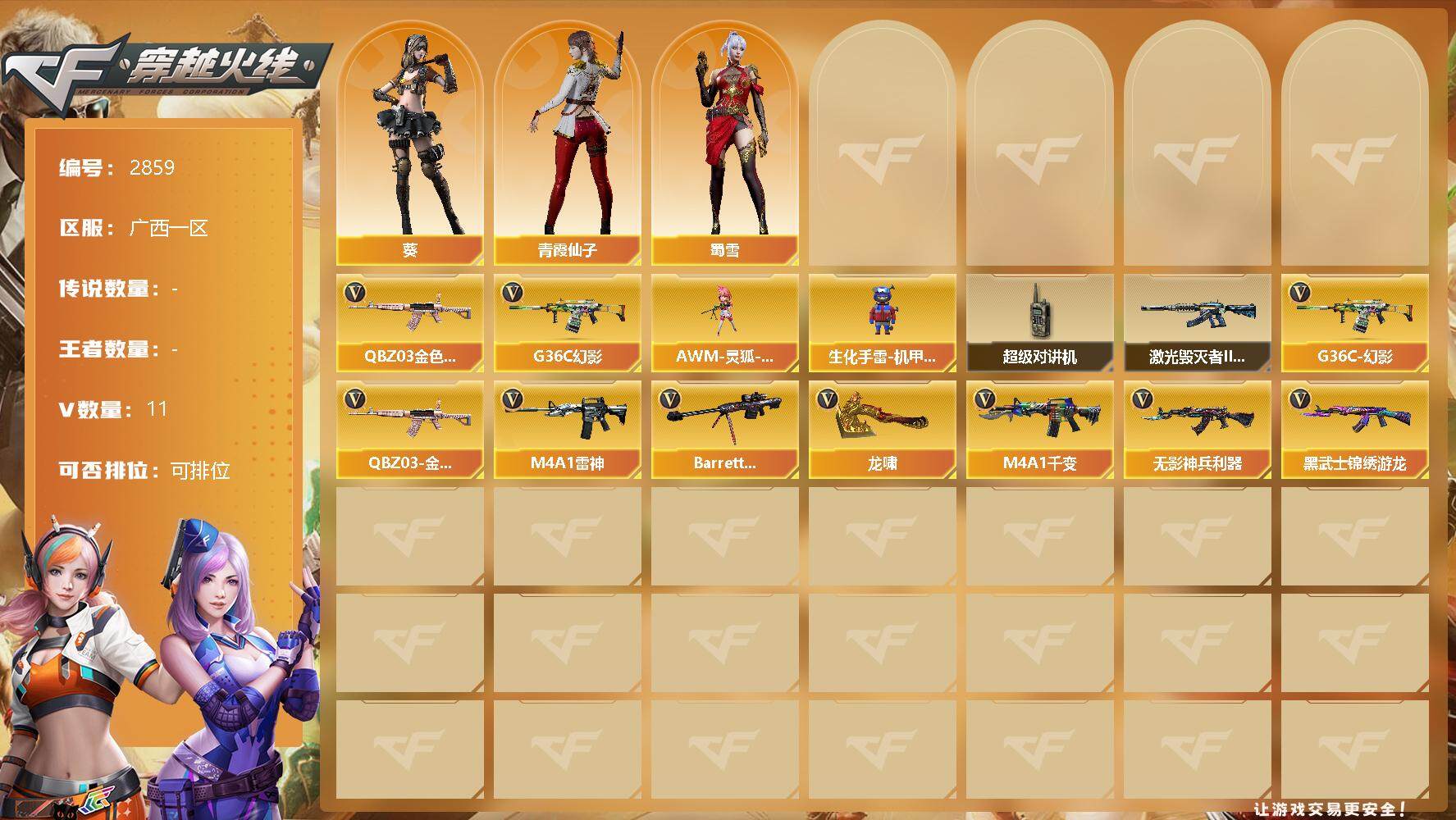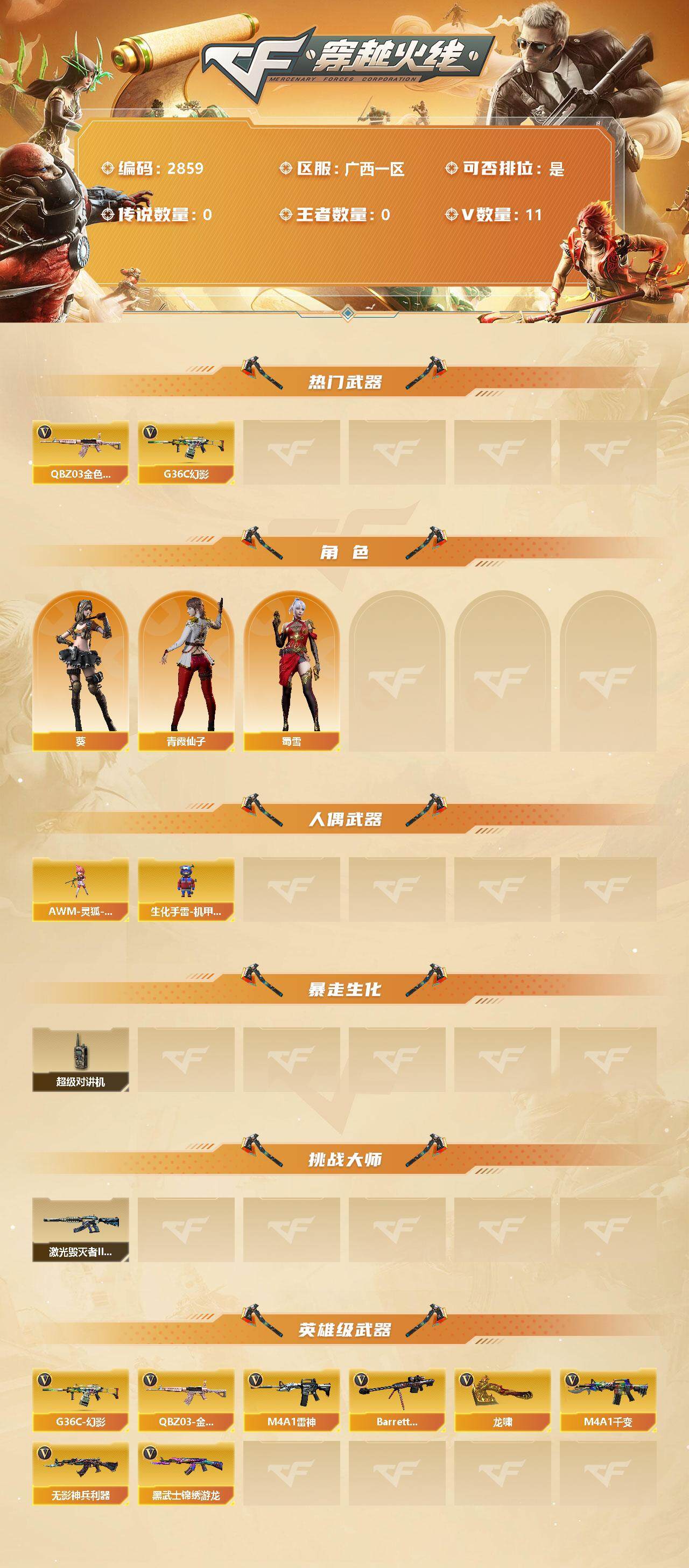 [12936815]广西一区-11V-0王者-0炫金 【热门武器】:G36C-幻影,QBZ03-金色蔷薇 【角色】:葵,蜀雪,青霞仙子 【人偶武器】:AWM-灵狐-15周年嘉年华,生化手雷-机甲核心 【暴走生化】:超级对讲机 【挑战大师】:激光毁灭者III-白马银枪 【英雄级武器】:M4A1-千变,M4A1-雷神,无影-神兵利器,G36C-幻影,黑武士-锦绣游龙,QBZ03-金色蔷薇,Barrett-毁灭,龙啸 【特殊枪械】: