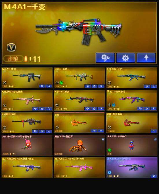 【英雄级武器】:M4A1-千变,M4A1-雷神,无影-神兵利器,G36C-幻影,黑武士-锦绣游龙,QBZ03-金色蔷薇,Barrett-毁灭,龙啸