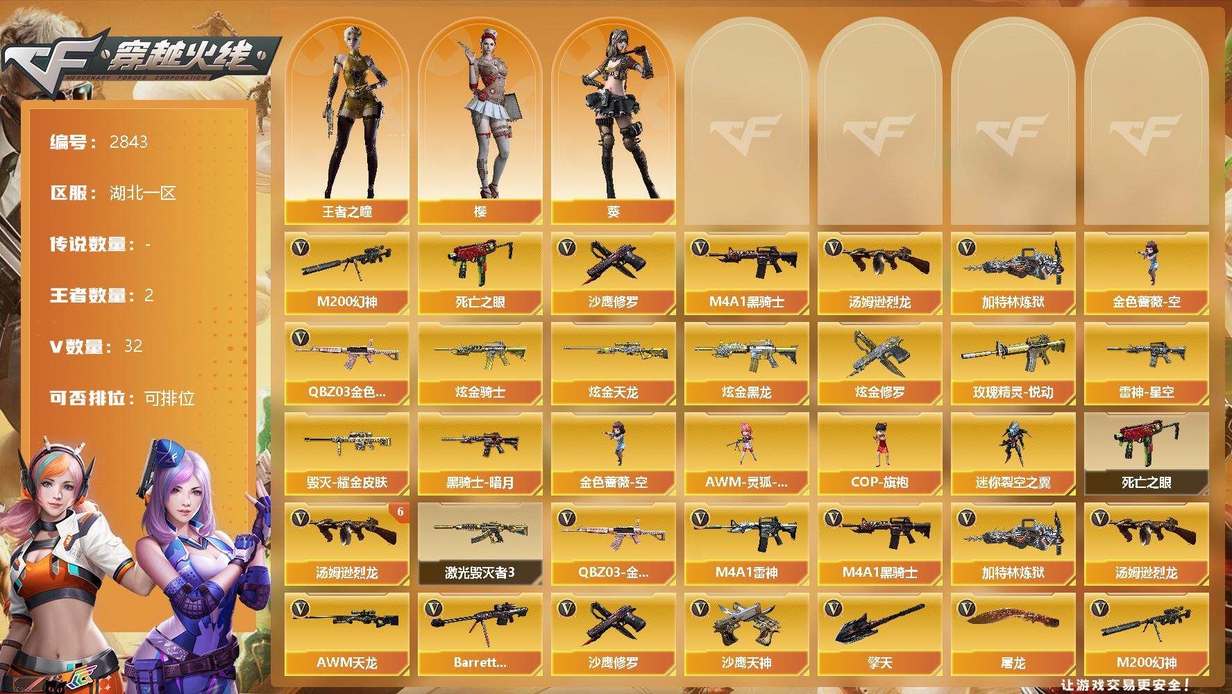 [12937025]湖北一区-32V-2王者-5炫金 【热门武器】:QBZ03-金色蔷薇,M200-幻神,死亡之眼*7,M4A1-黑骑士,汤姆逊-烈龙*6,加特林-炼狱,金色蔷薇-空,沙鹰-修罗*3 【王者炫金武器】:玫瑰精灵-悦动,炫金骑士,炫金天龙,炫金黑龙,炫金修罗*2 【稀有皮肤】:雷神-星空,黑骑士-暗月,毁灭耀金皮肤 【角色】:葵,樱,王者之瞳 【人偶武器】:金色蔷薇-空,AWM-灵狐-15周年嘉年华,COP-旗袍,迷你裂空之翼 【暴走生化】:死亡之眼*7 【挑战大师】:激光毁灭者III 【英雄级武器】:M4A1-雷神*2,M4A1-黑骑士,QBZ03-金色蔷薇,M4A1-猎神,AWM-天龙,Barrett-毁灭,M200-幻神,加特林-炼狱,汤姆逊-烈龙*6,沙鹰-修罗*3,沙鹰-天神*3,屠龙*5,擎天 【特殊枪械】:1黑骑士,6烈龙,1炼狱